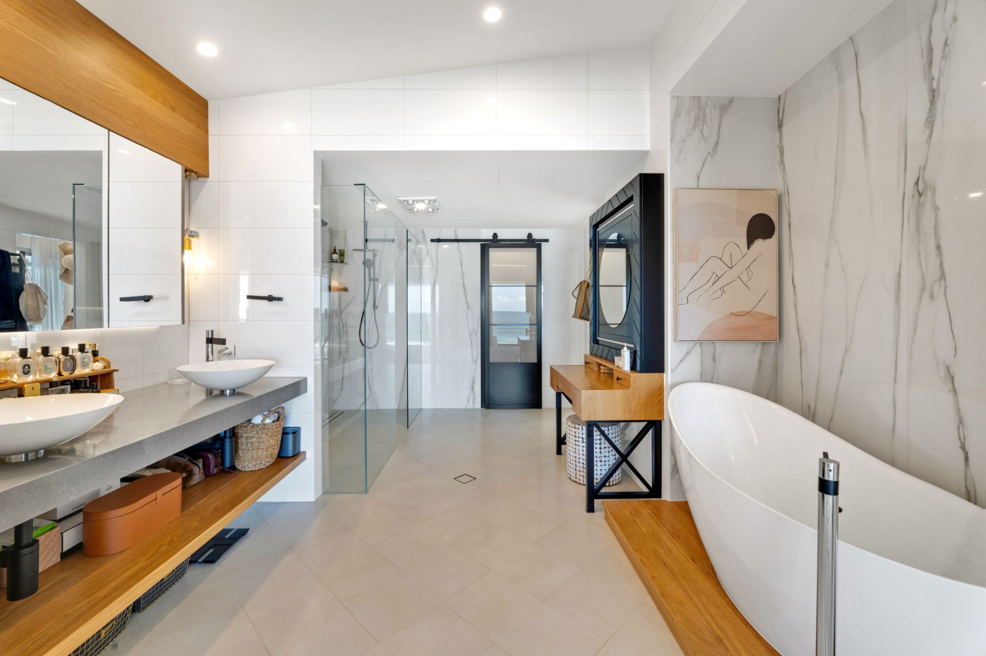 Top level dedicated to the luxe master suite with his and hers opulent walk-in robes and contemporary ensuite with elevated freestanding bath, dual showers and stone vanities plus premium Oliveri tapware