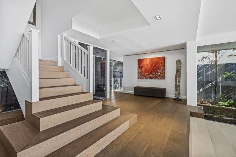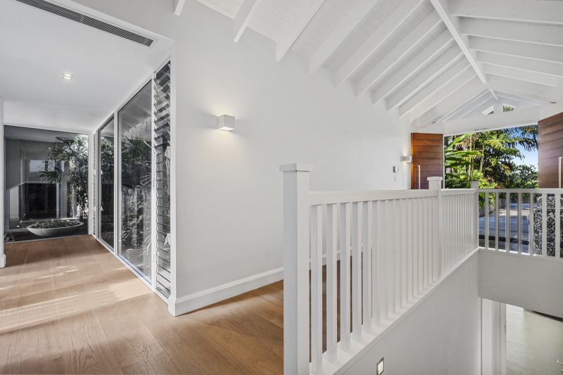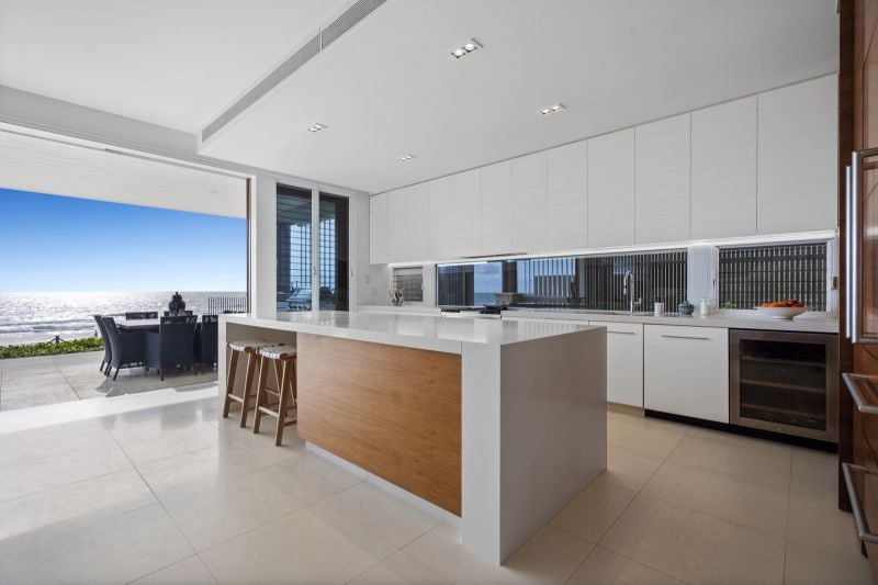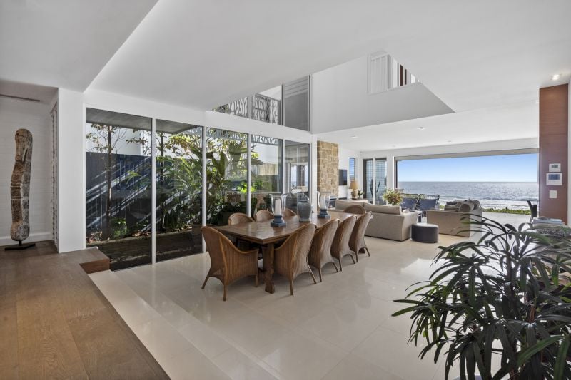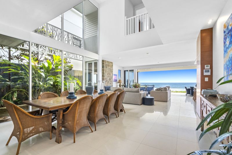 Beyond the private tropical entry, soaring ceilings, limestone floors, and glass louvres capture sea breezes and natural light throughout. Expansive open-plan living and dining areas flow effortlessly to a covered entertaining terrace with built-in BBQ, lawn, and 12.4 metres of direct beach frontage - the perfect setting for relaxed family living and seaside entertaining.