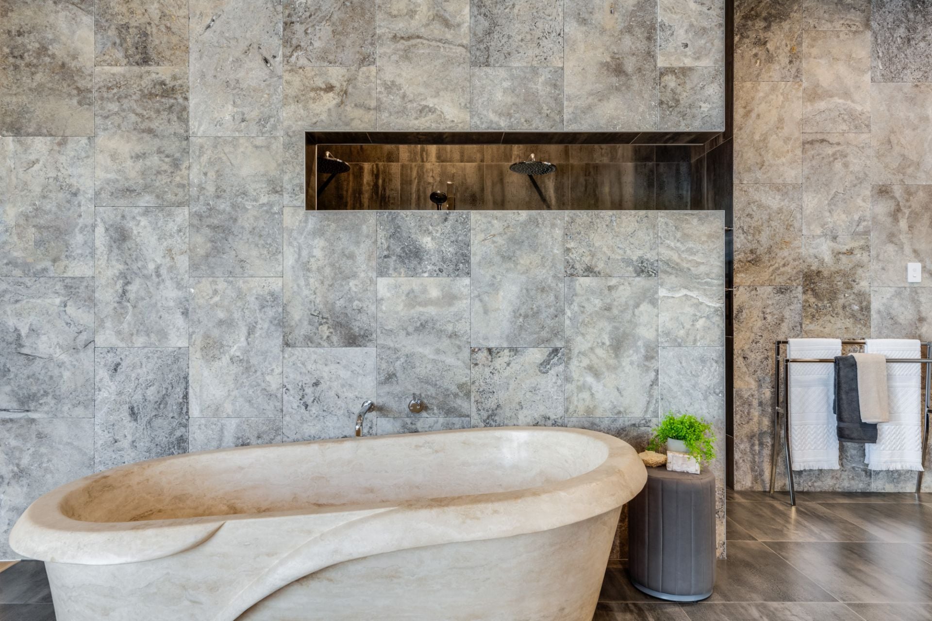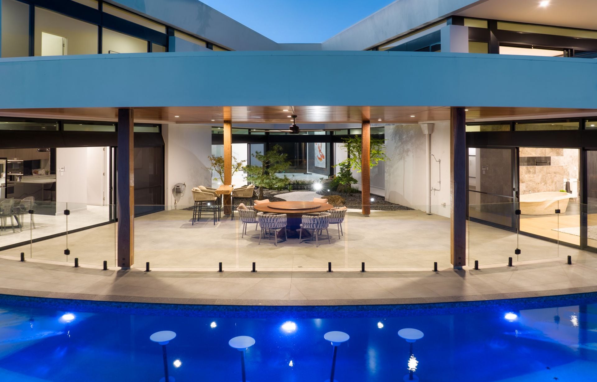 Expansive glass doors lead to a substantial WA Jarrah lined alfresco terrace, overlooking the 80,000-liter magnesium infinity pool with wet bar seating-a perfect setting for outdoor entertaining and alfresco area.