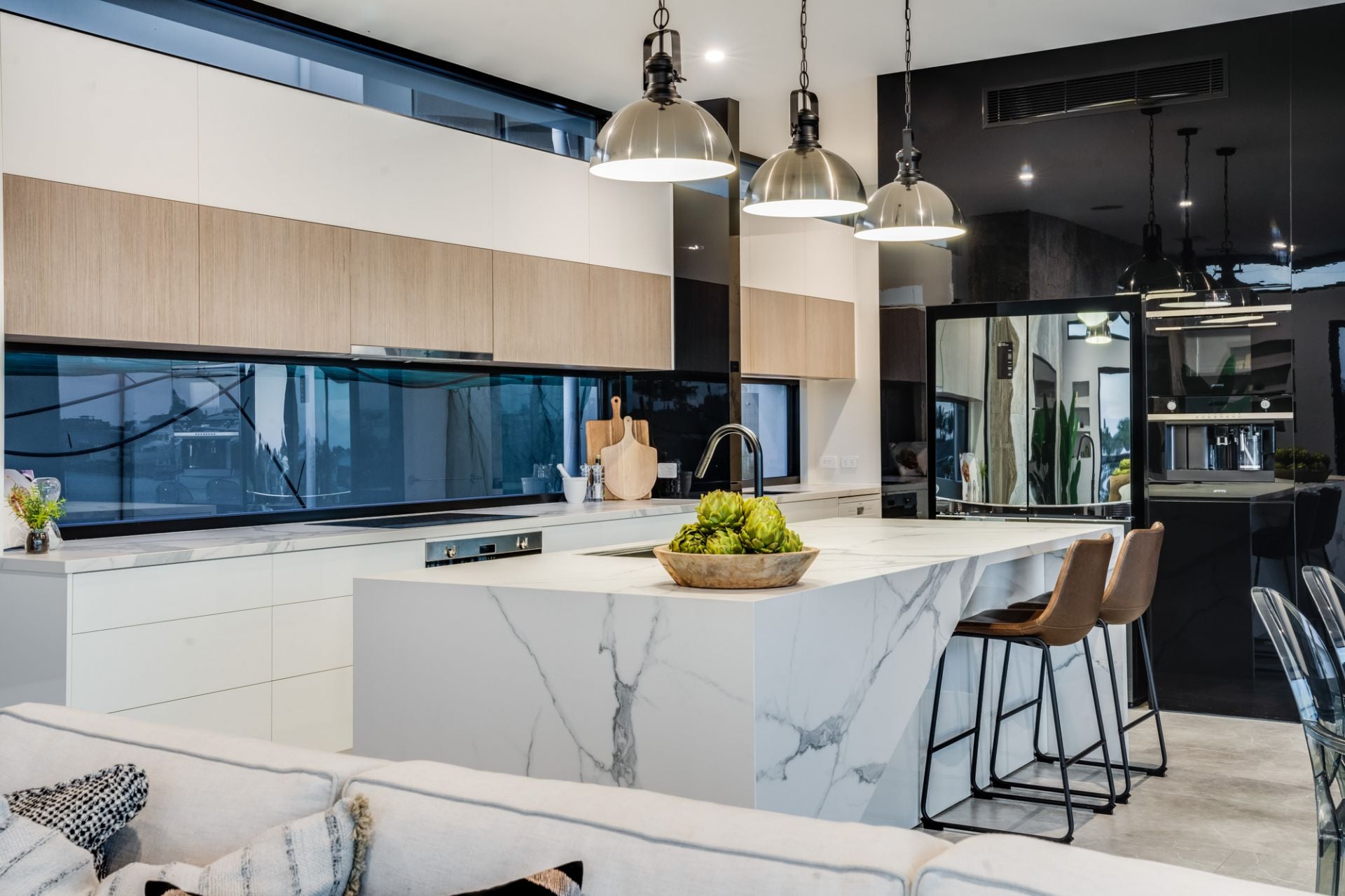 The kitchen showcases a bold aesthetic with black and white accent cabinetry and Statuario porcelain, complemented by integrated Smeg appliances and a butler's pantry. This culinary space merges seamlessly with the light-filled waterfront dining and living area, featuring a low-lying gas fireplace and a travertine-recessed TV.