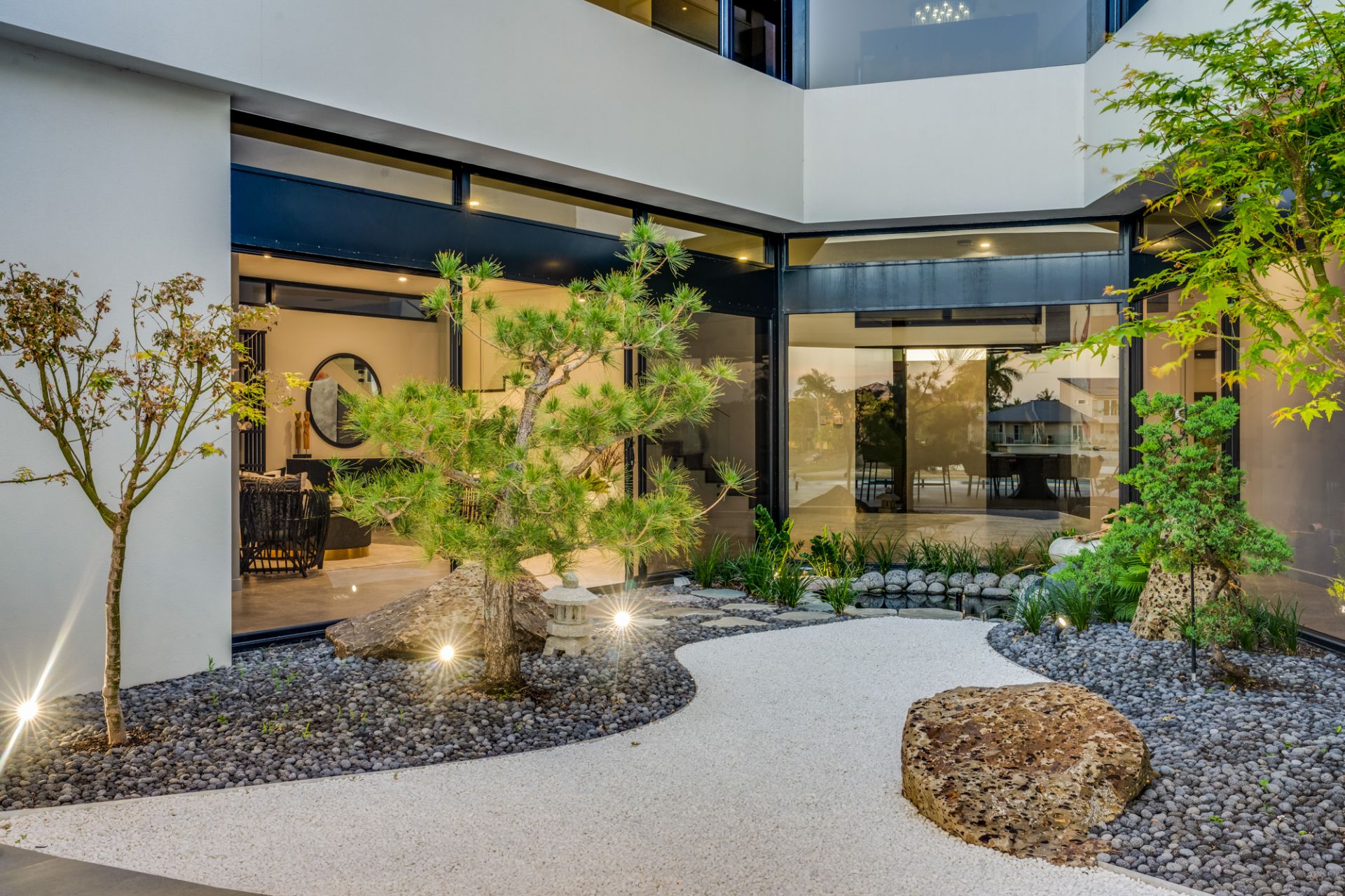 Situated in a prime location, the property boasts manicured lawns and a private beach, stretching along 45 meters of serene waterfront from an esteemed vantage point. Inside, the interiors create a heightened sense of space, seamlessly integrating with the natural surroundings through three-meter ceilings, expansive glass panels, and a thoughtfully designed V-shaped floor plan that unfolds to embrace the waterfront and a stunning outdoor atrium.