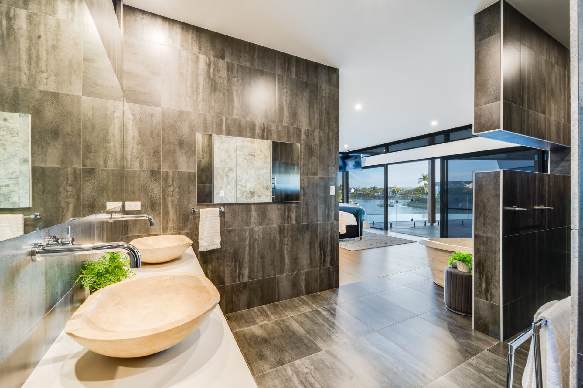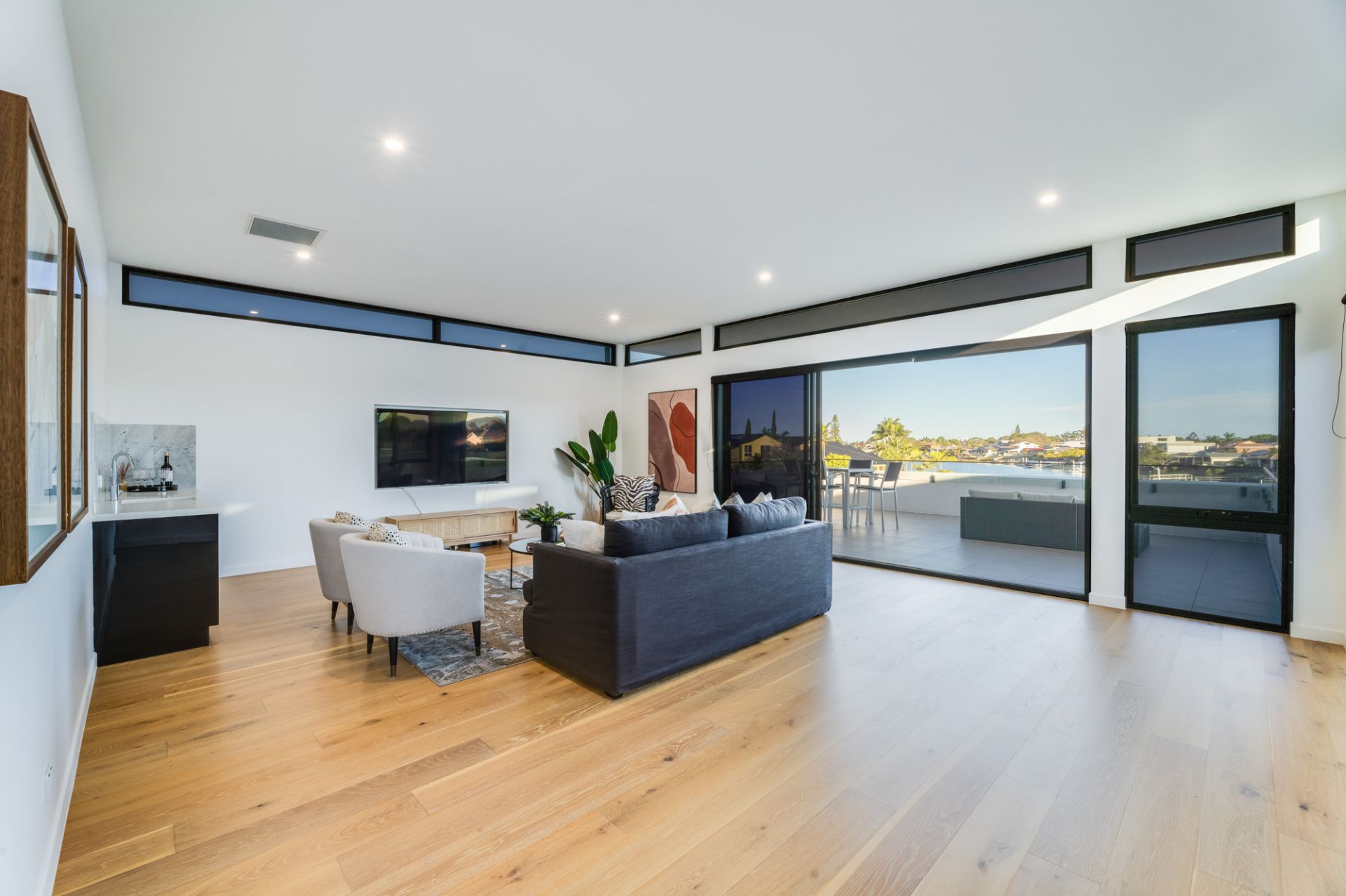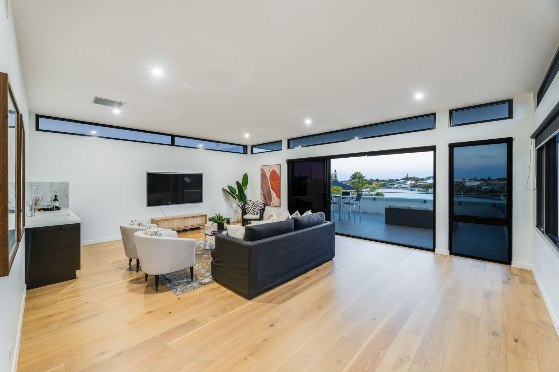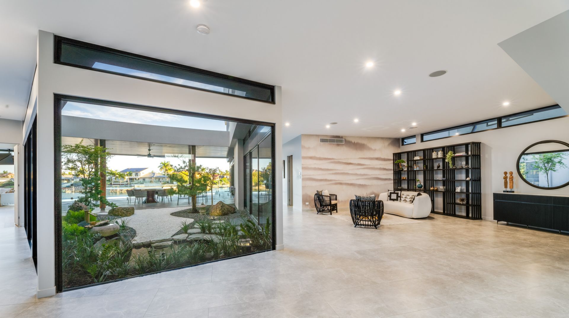 Upon entry, a crystal chandelier in the foyer hangs through a lofty 6.5-meter void, framing lingering water views. The open plan billiards room, adorned with newly installed tile flooring and a striking stone and mica feature wall, flows effortlessly to a granite bar with an integrated fridge.