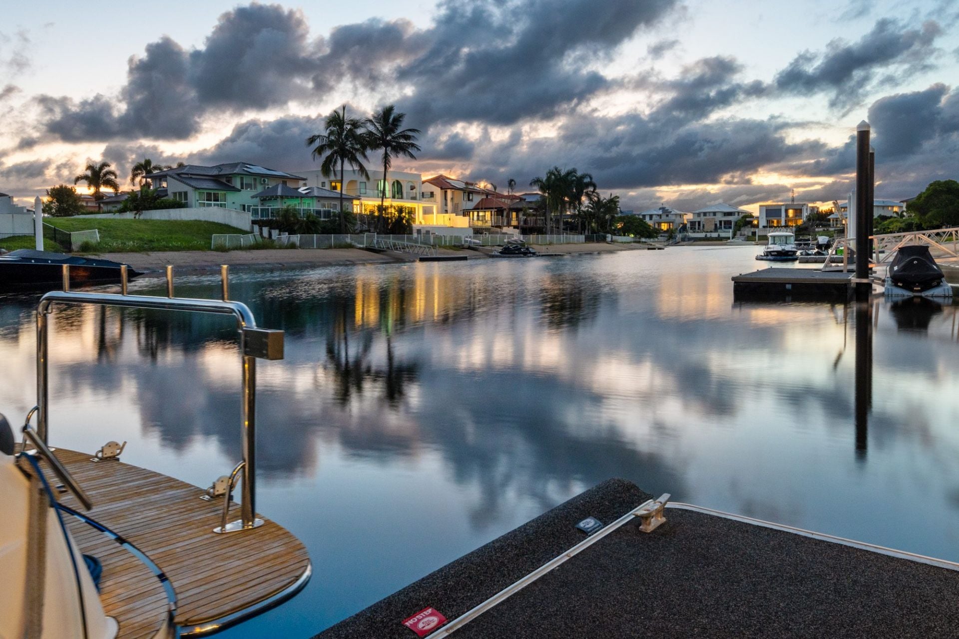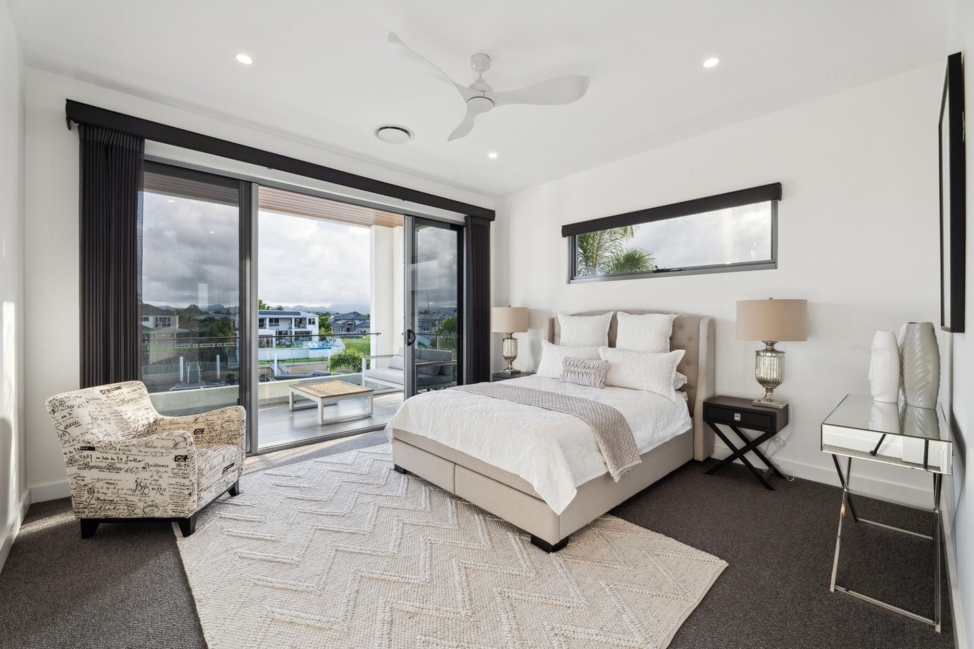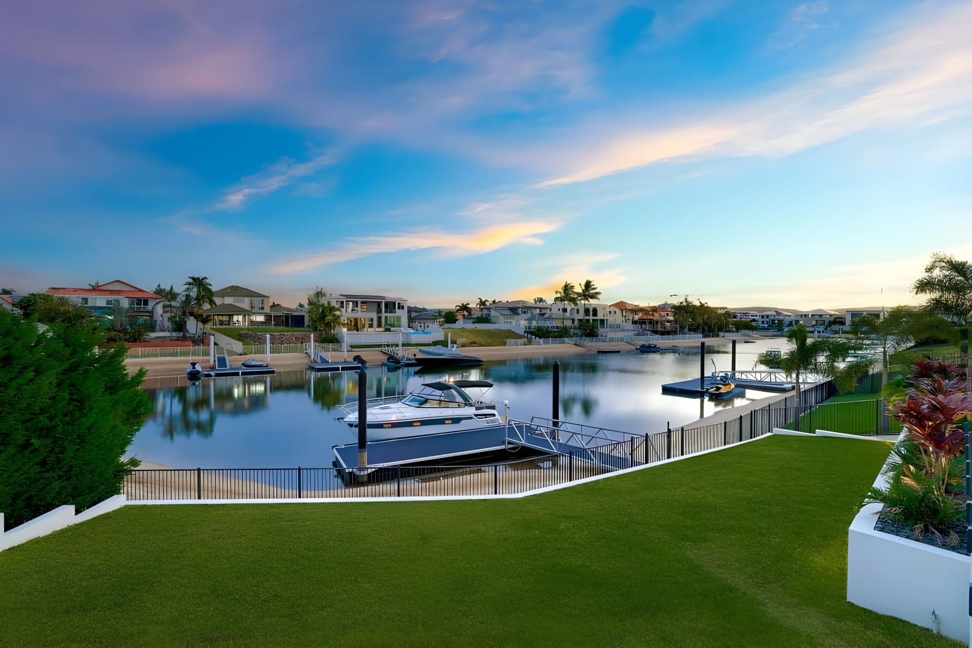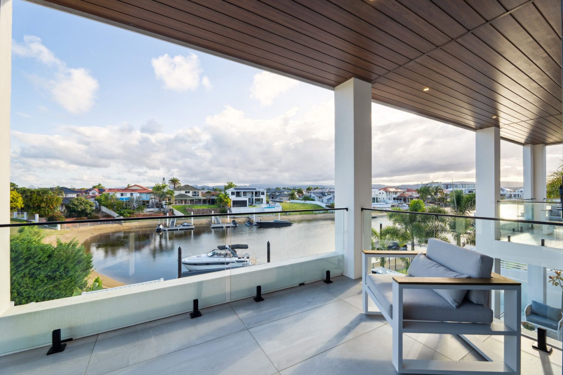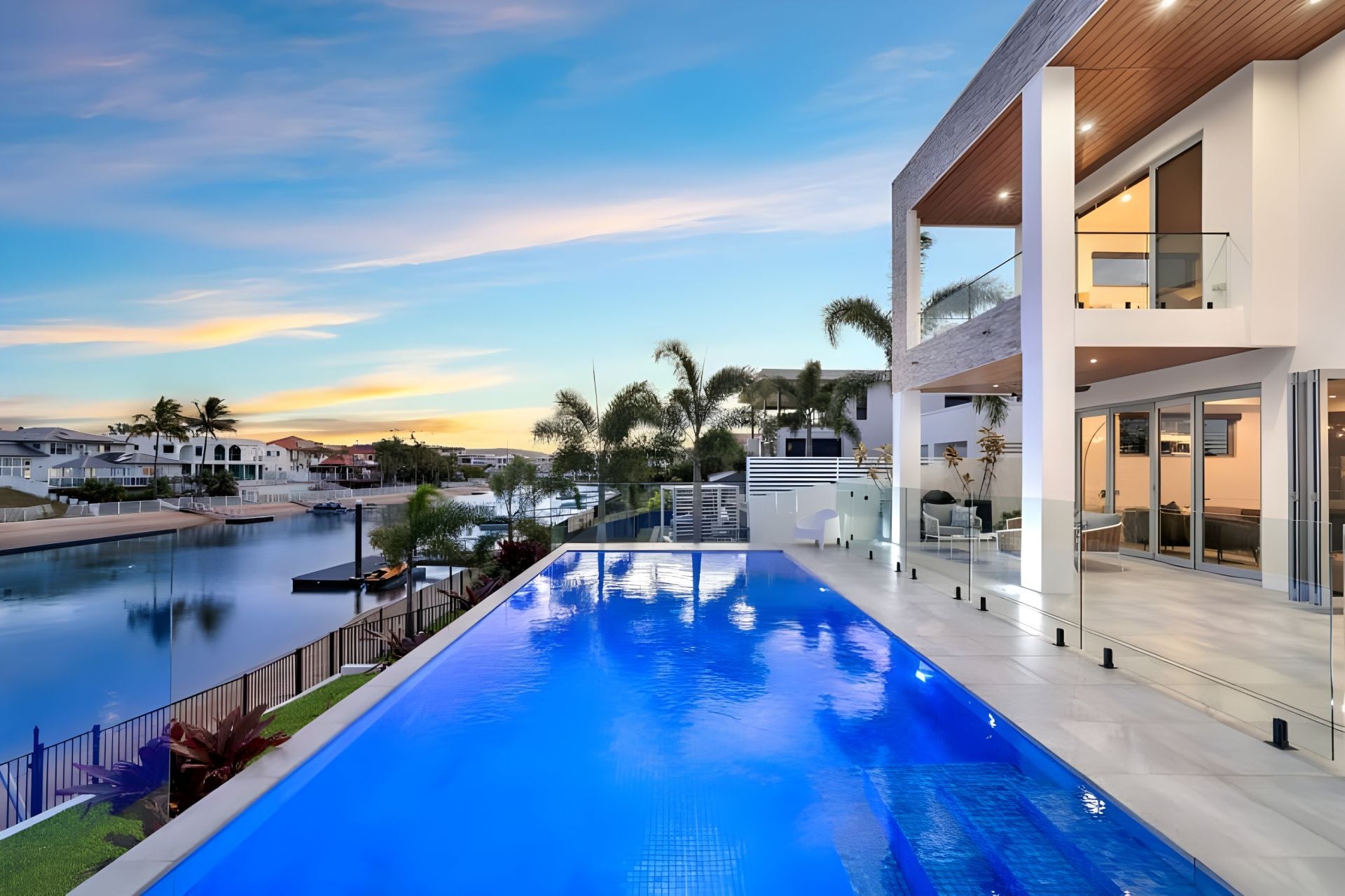 • Three additional upper-level bedrooms with walk-in robes and fully tiled ensuites with shower, vanity, and toilet; two with canal-facing balconies