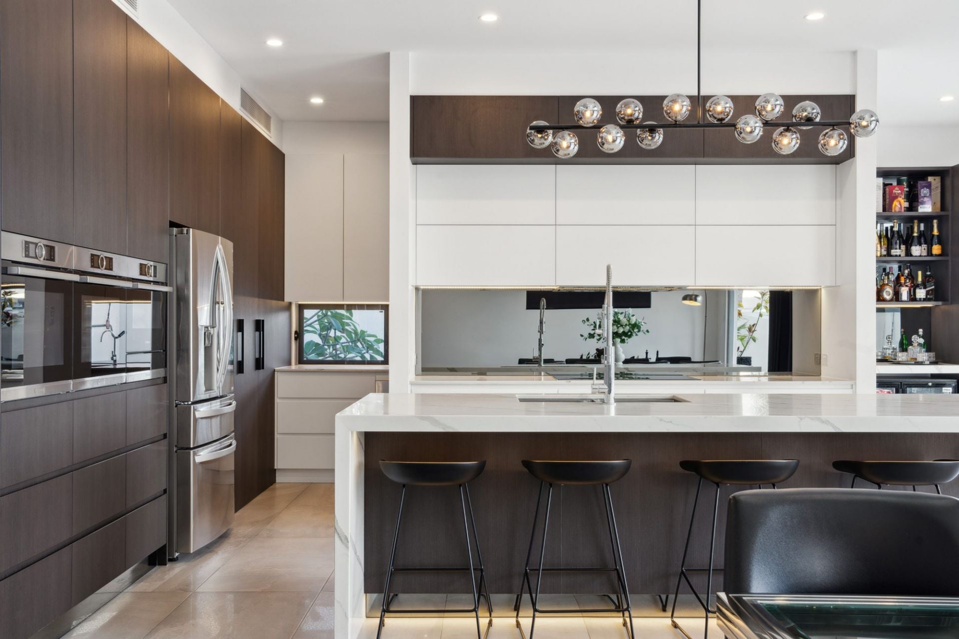 • Built-in bar with Calacatta marble countertop, triple wine fridge; Bosch built-in coffee machine