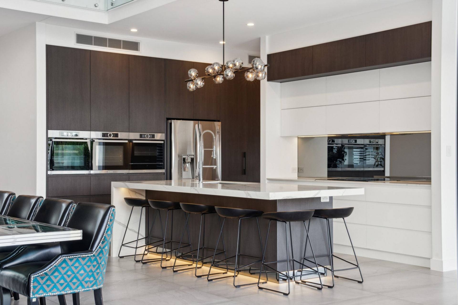 • Chef's kitchen with 3m* waterfall island topped with thick engineered Calacatta marble; top-of-the-line Bosch appliances including induction stovetop and three steam and combination ovens with plate warmer, integrated dishwasher; soft-close cabinetry and pendant lighting