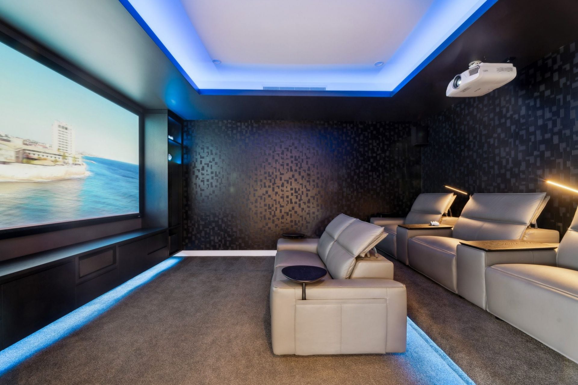 • Large media room with built-in leather recliner seating; Epson projector, Klipsch sound system