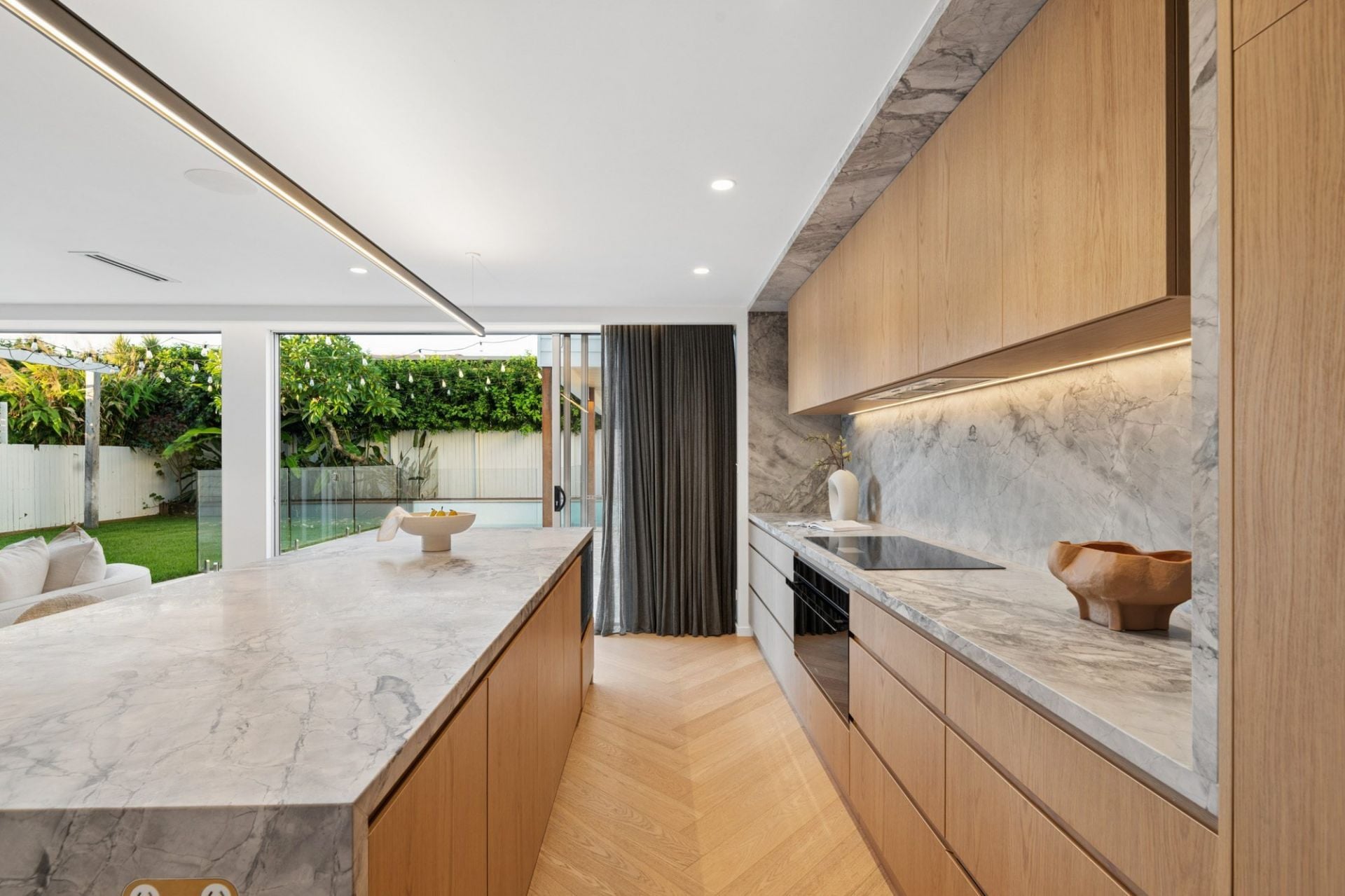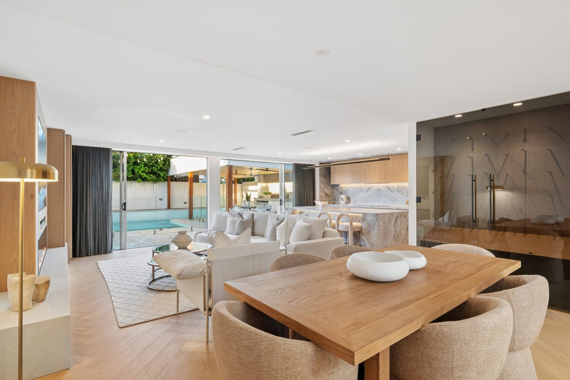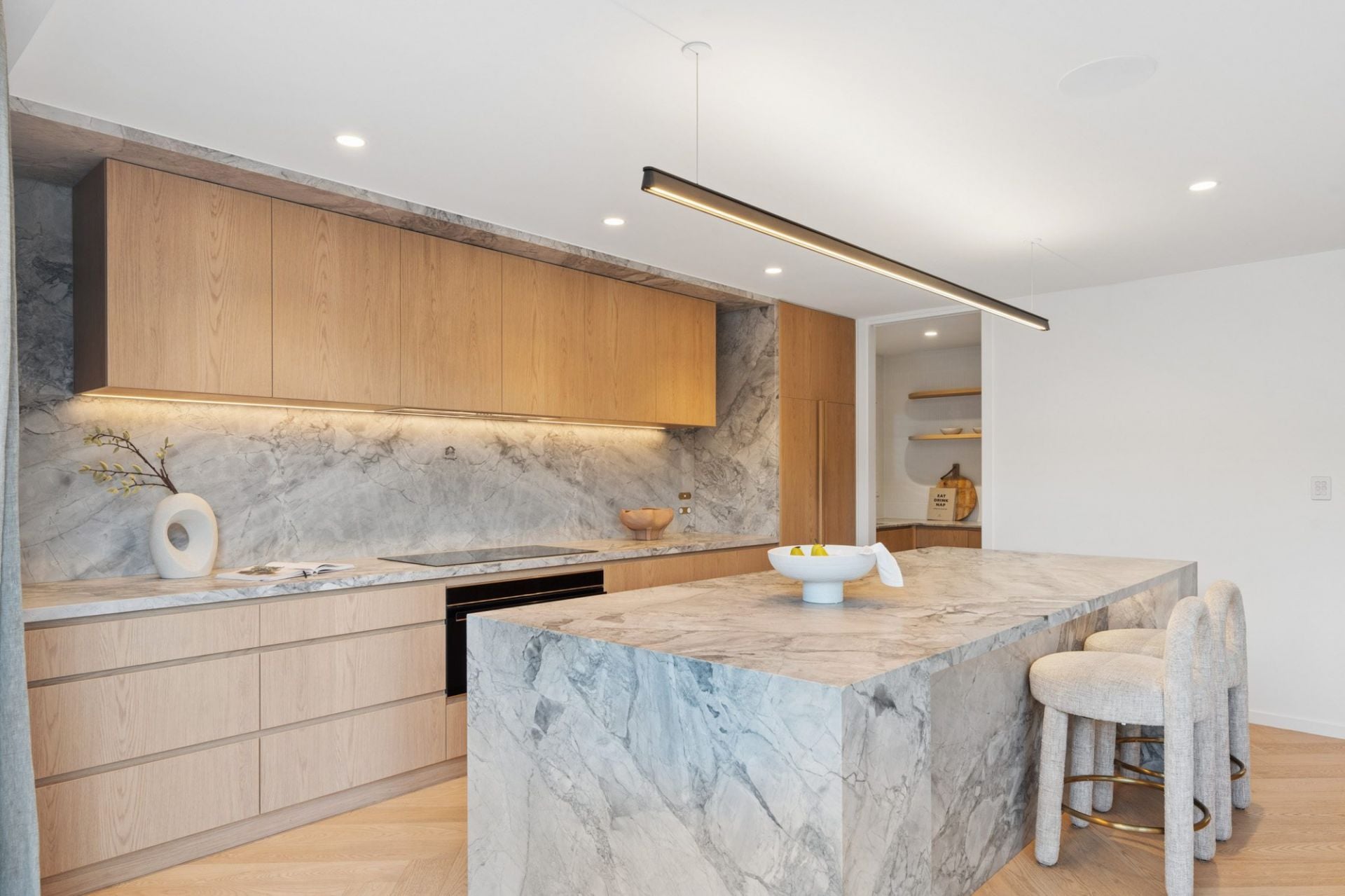 The ground level is centred around a stunning open-plan living and dining domain, seamlessly connected to the outdoors via expansive floor-to-ceiling glass doors. A designer kitchen anchors the space, complete with a waterfall stone island, premium appliances, and a fully appointed butler's pantry with integrated perfectly suited for entertaining.