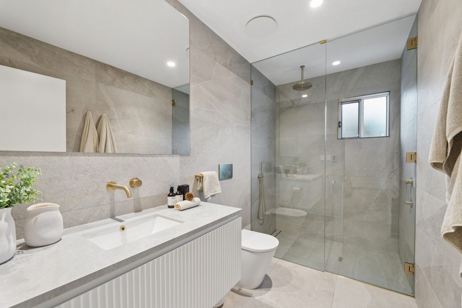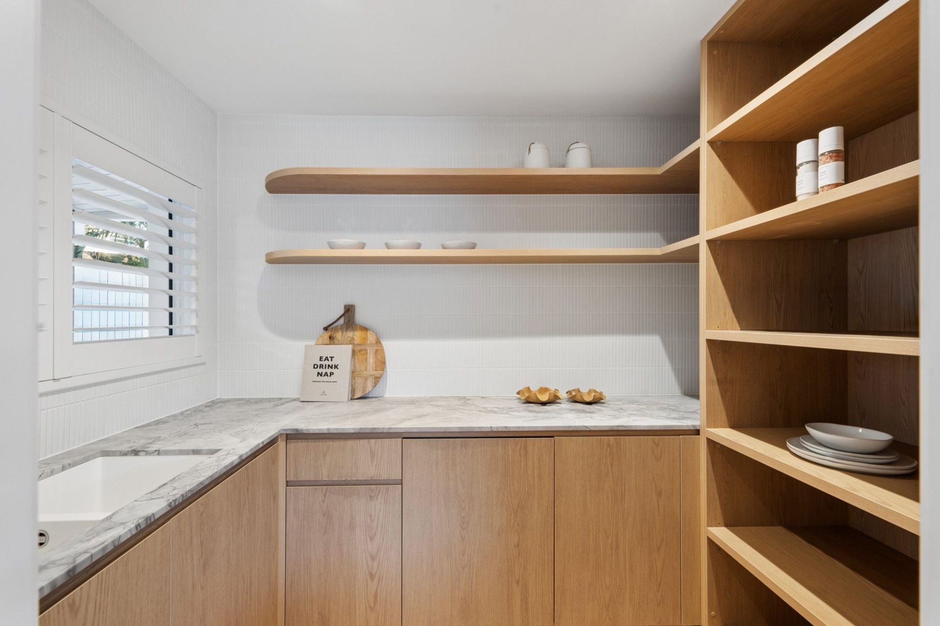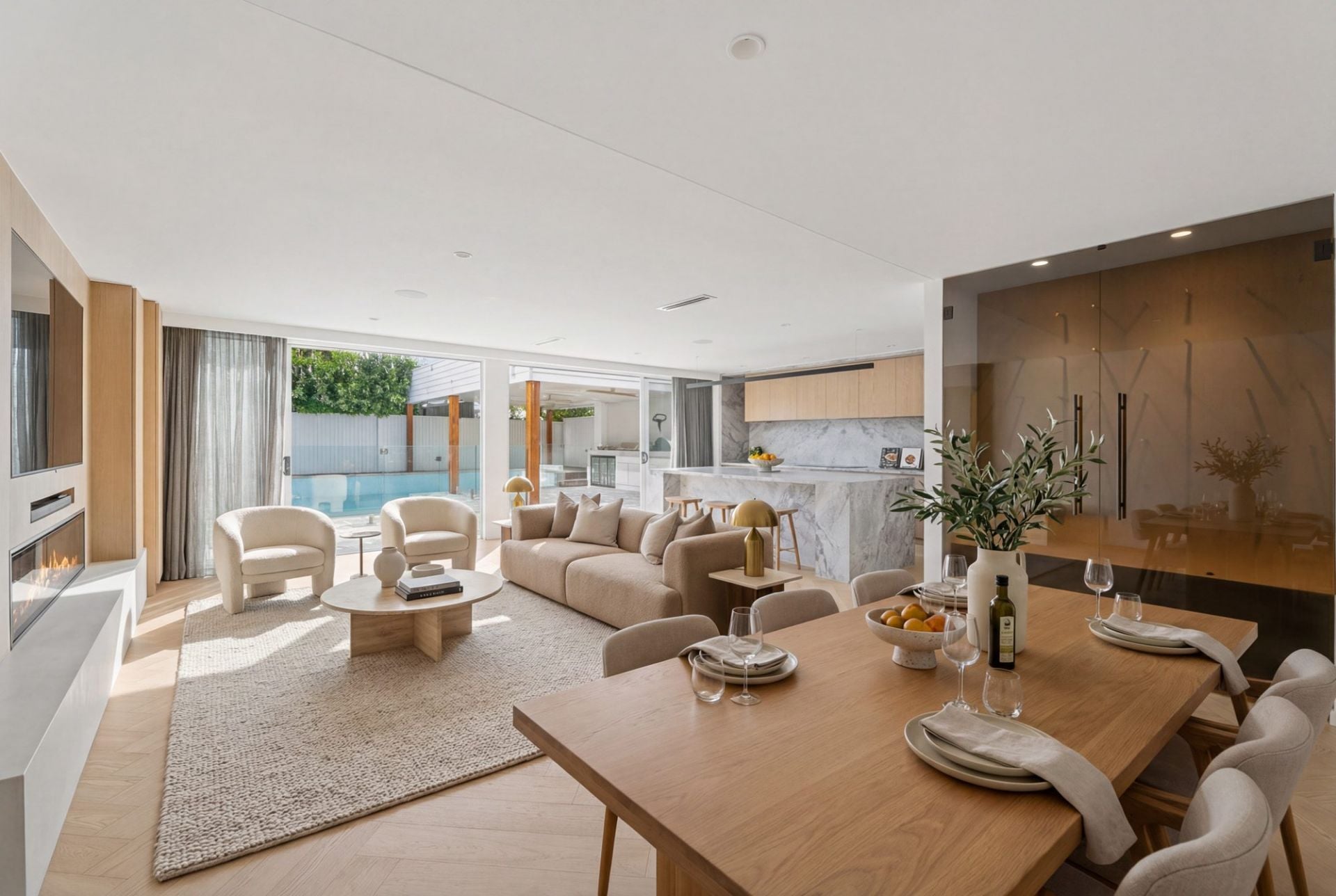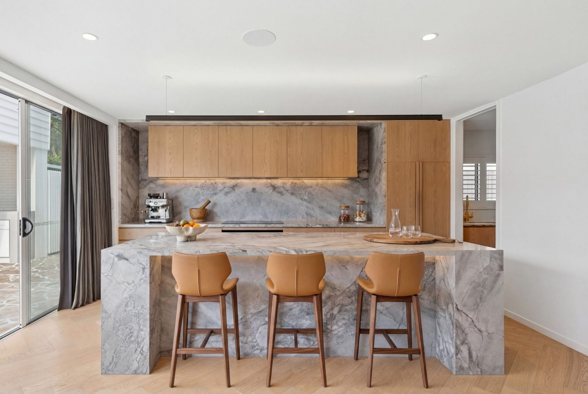 The ground level is centred around a stunning open-plan living and dining domain, seamlessly connected to the outdoors via expansive floor-to-ceiling glass doors. A designer kitchen anchors the space, complete with a waterfall stone island, premium appliances, and a fully appointed butler's pantry with integrated perfectly suited for entertaining.