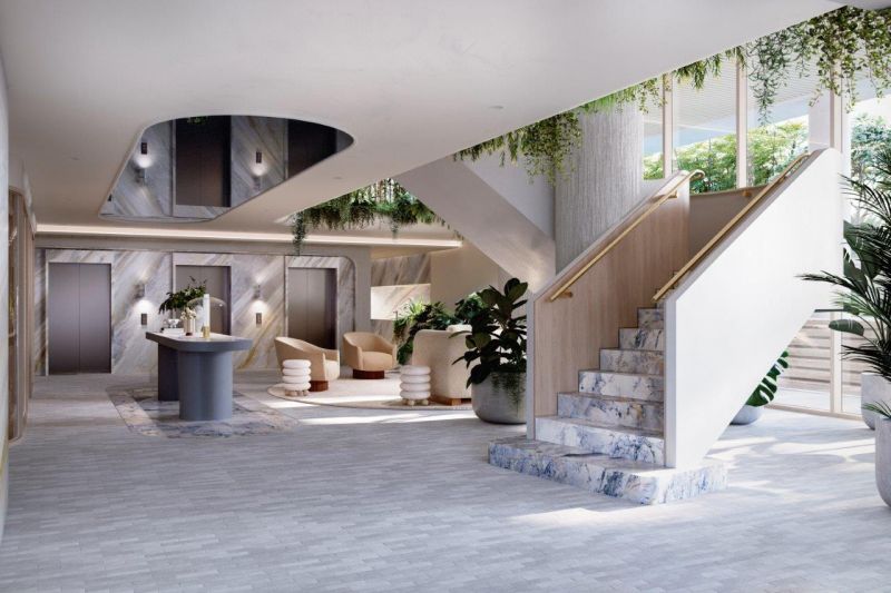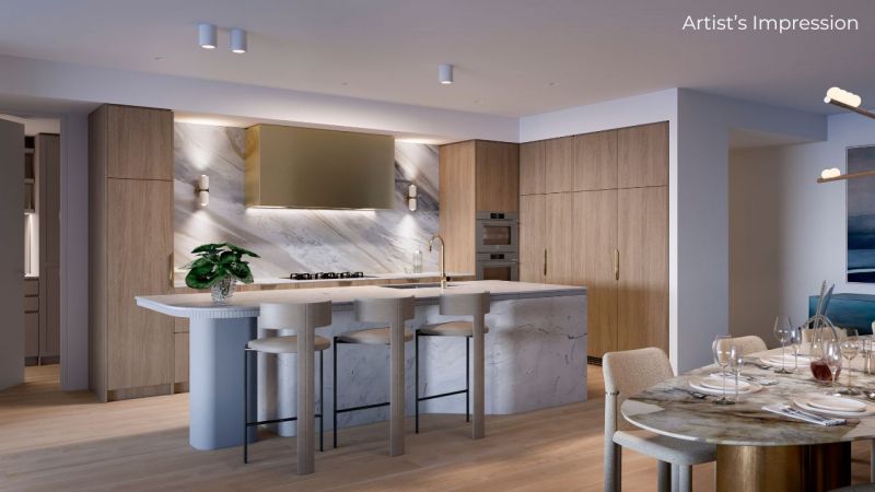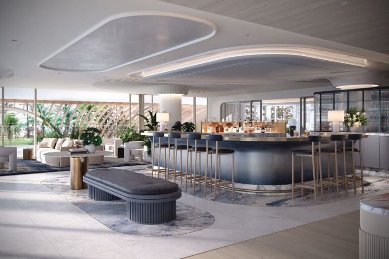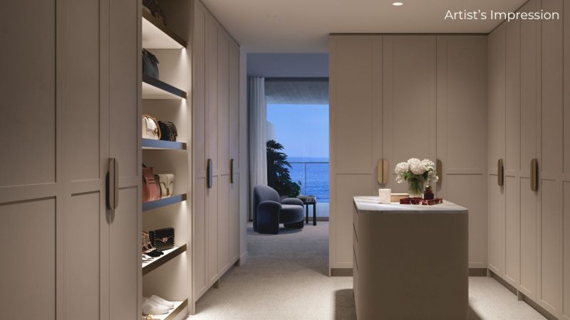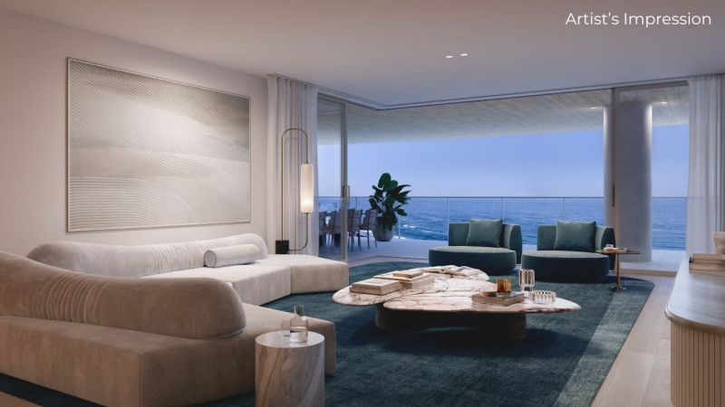 This north-facing residence spans 314 square meters* and rivals the size of a standalone home, providing a truly immersive oceanfront experience. Offering uninterrupted views of the ocean stretching to the city skyline the design thoughtfully reflects the undulating ocean and sunlit seas of the area. Curated by MIM Design, the timeless aesthetic harmonizes with the natural tones and color palette of North Burleigh. The interior features bespoke cabinetry with gentle curves and a grand lobby entrance with sophisticated ceiling details, echoing the flow of the ocean.