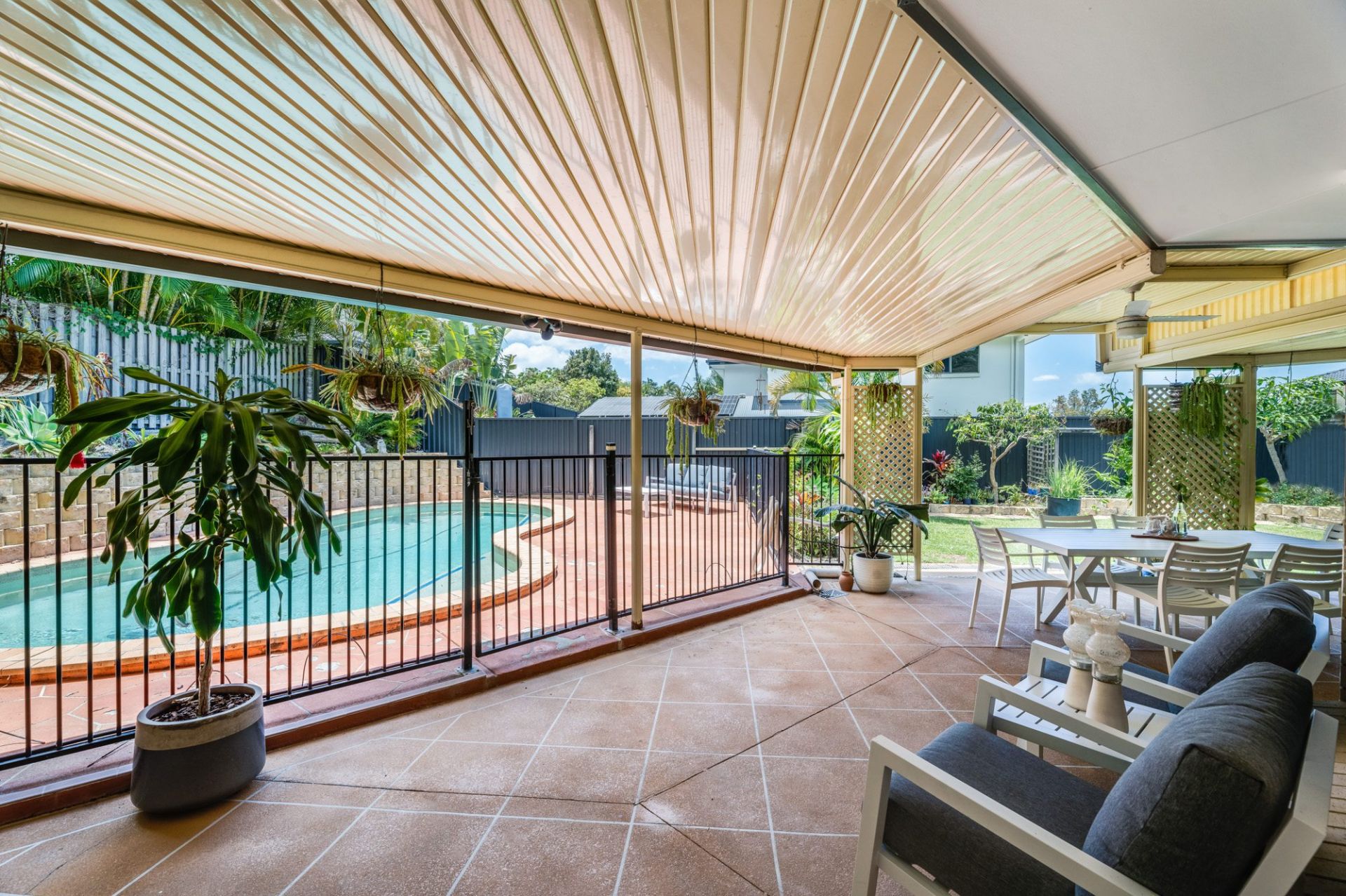 Outside, flowing on from the entertainment area, there is a large sparkling in ground pool and the gardens are lined with a number of beautiful palms. With plenty of flat lawn for the kids to run around on, this home really does tick all the boxes!