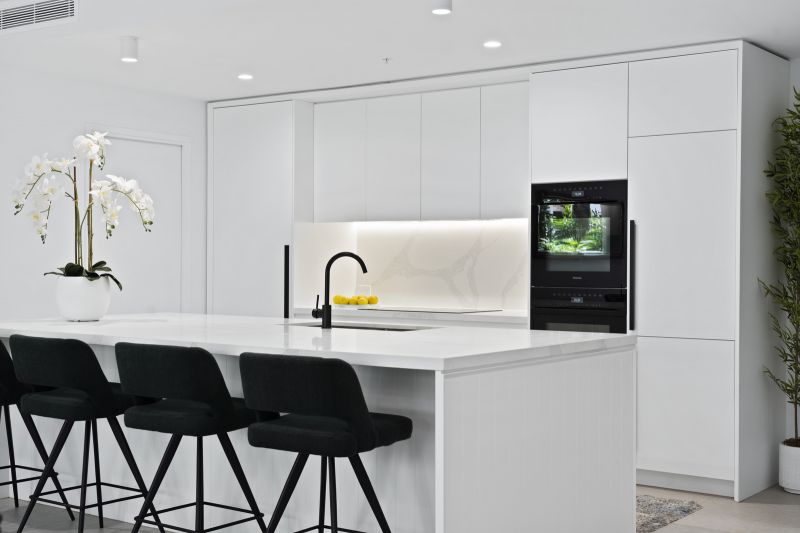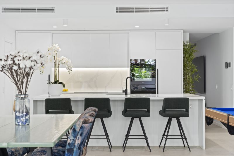 The gourmet kitchen is a chef's delight, showcasing an oversized elegant benchtop that not only offers ample preparation space but also serves as a gathering point for family occasions. High-end Miele appliances, including an integrated fridge, freezer, and dishwasher, ensures a sophisticated culinary experience, while the abundant cabinetry provides ample storage.