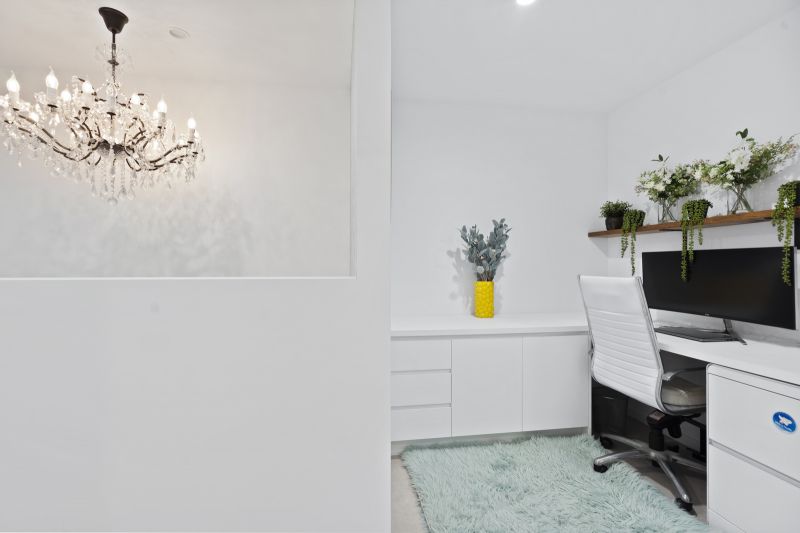 • Well-appointed study nook with a built-in desk and cabinetry, perfect for remote work or study