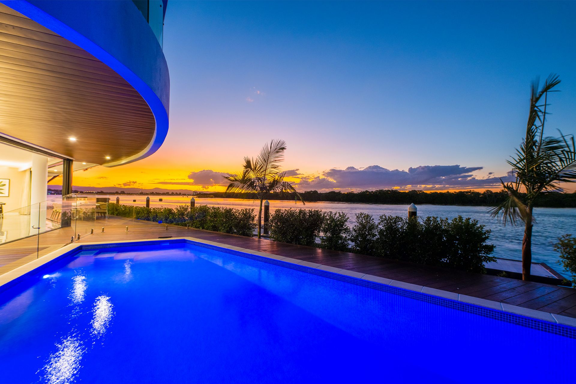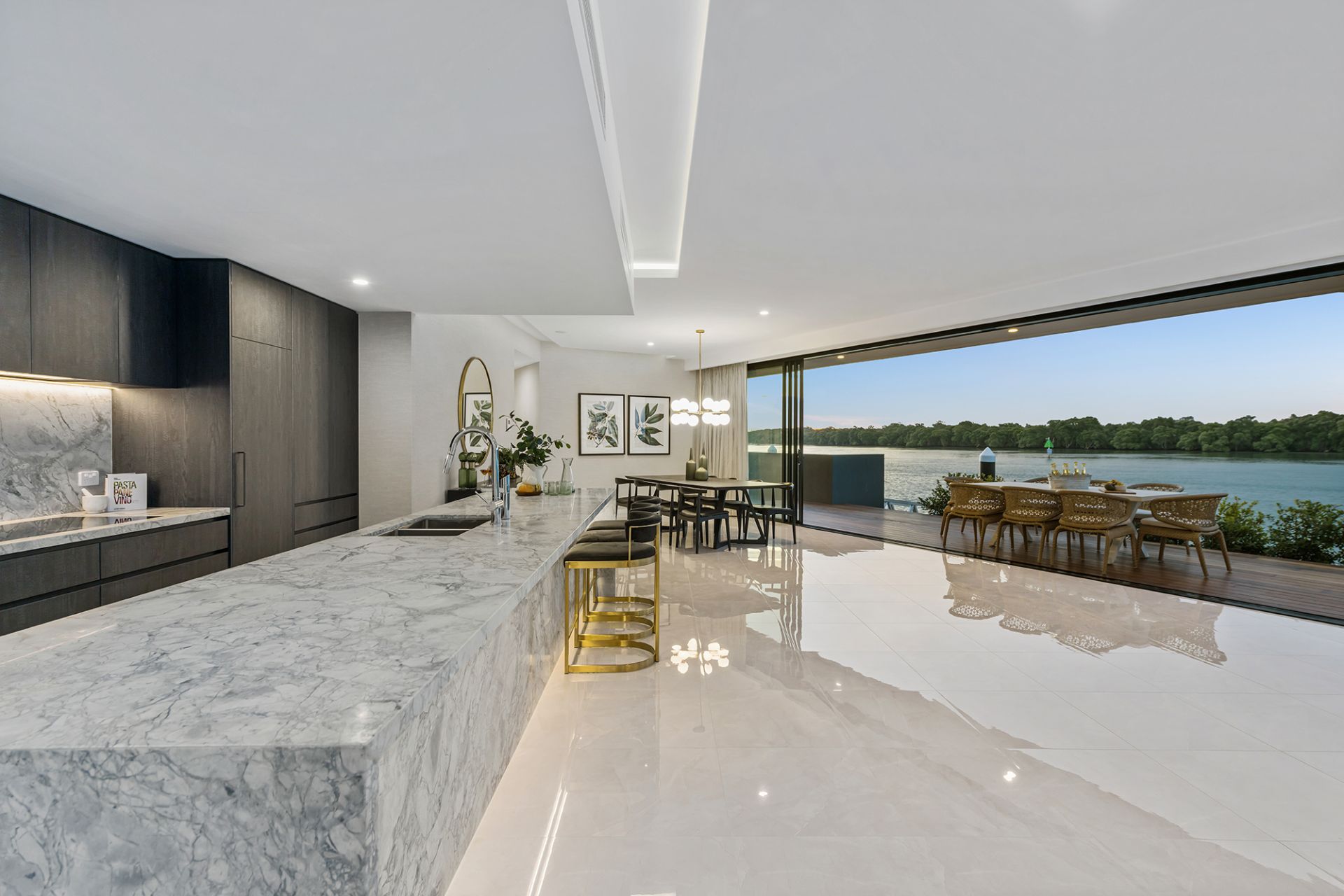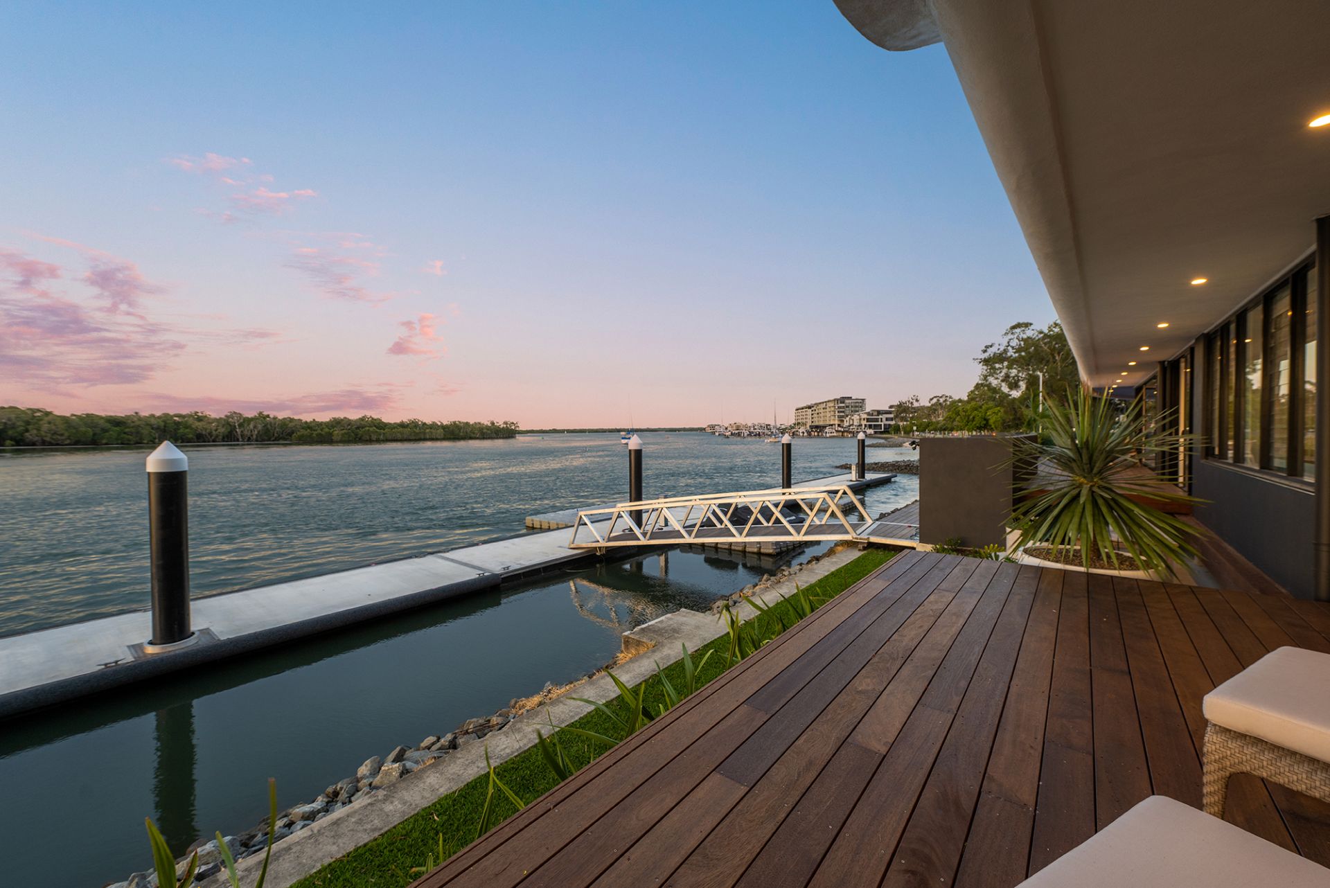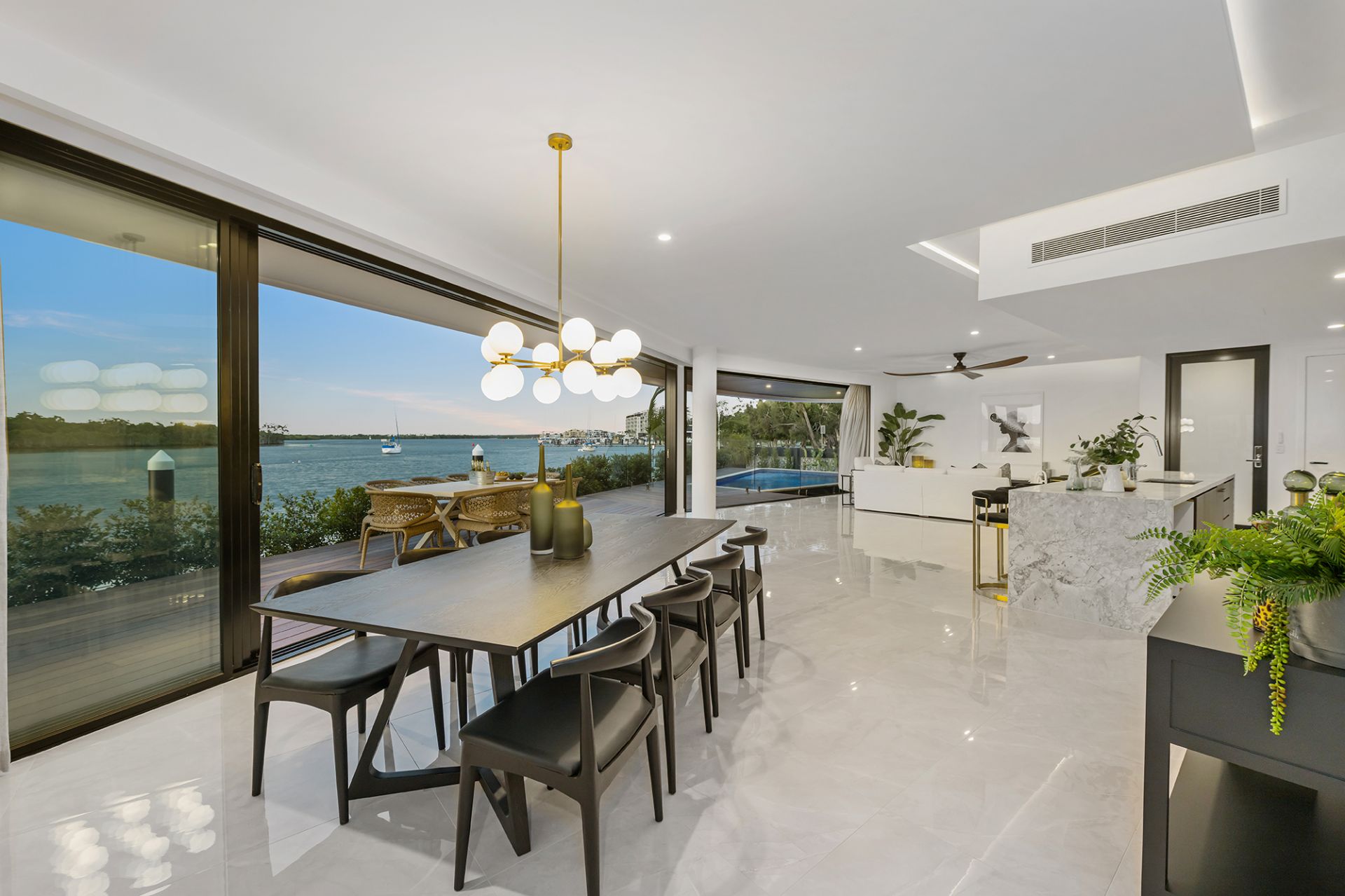 - Sprawling alfresco deck offering stunning views of the wide waterways and complemented by a pristine, fully tiled swimming pool