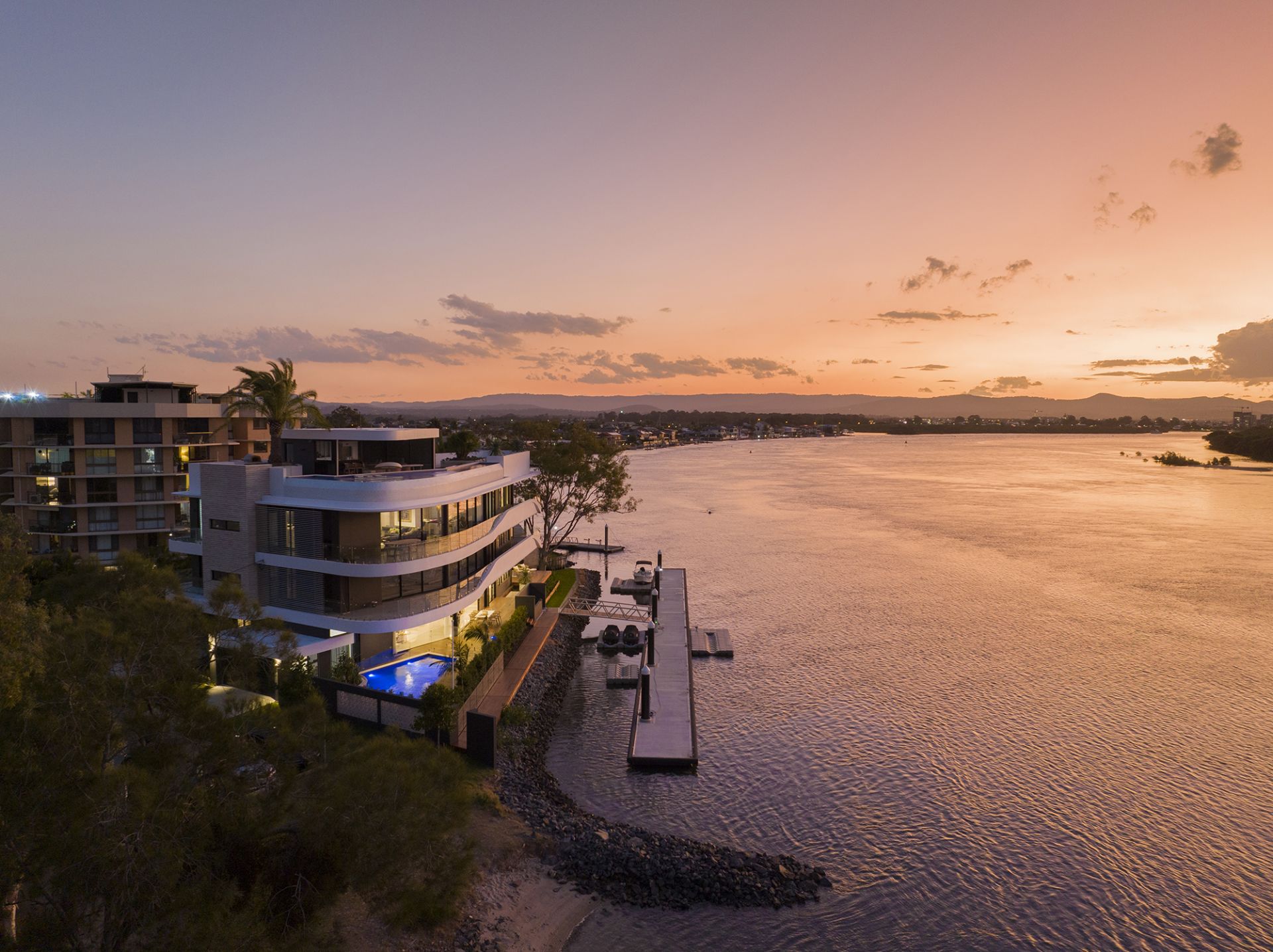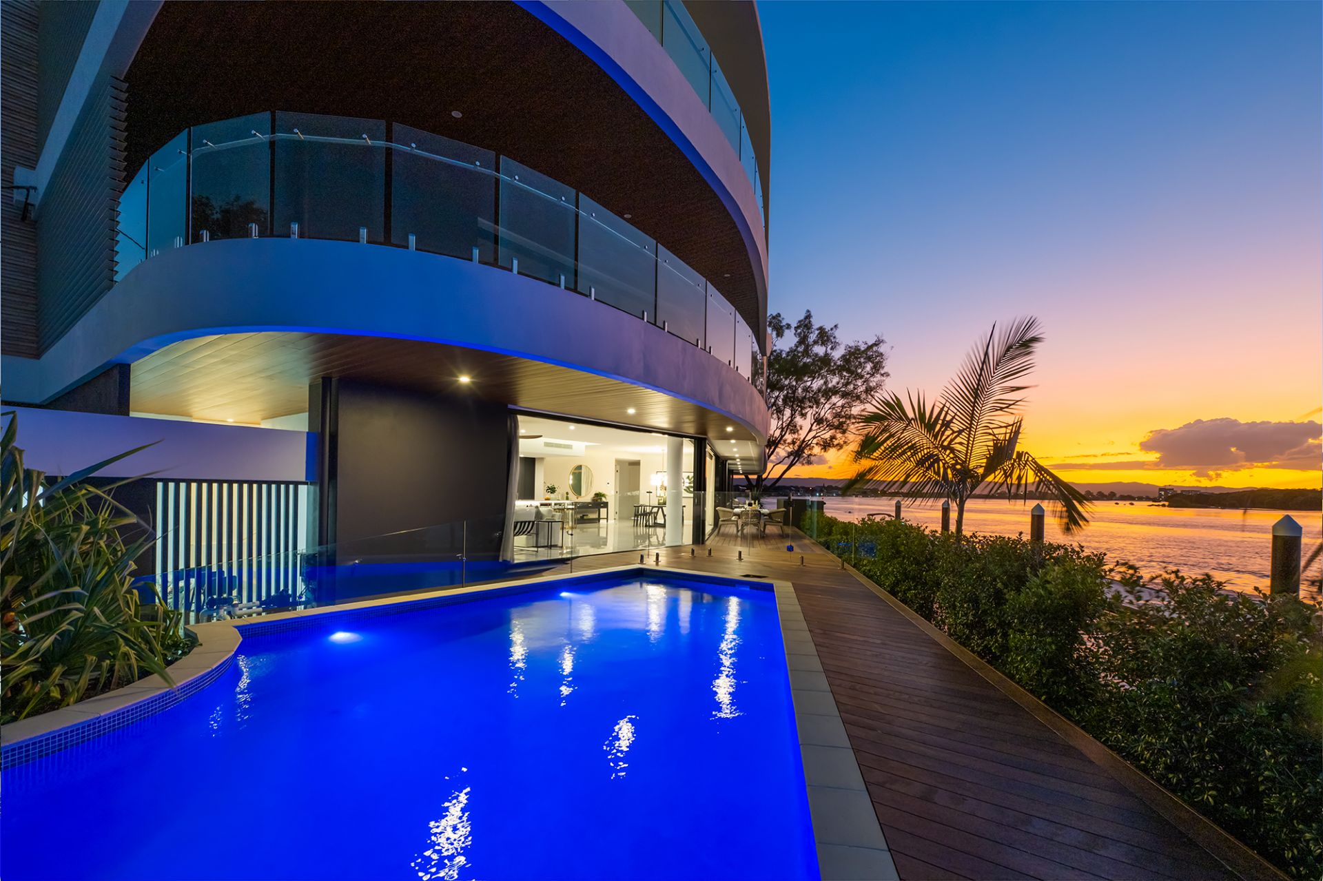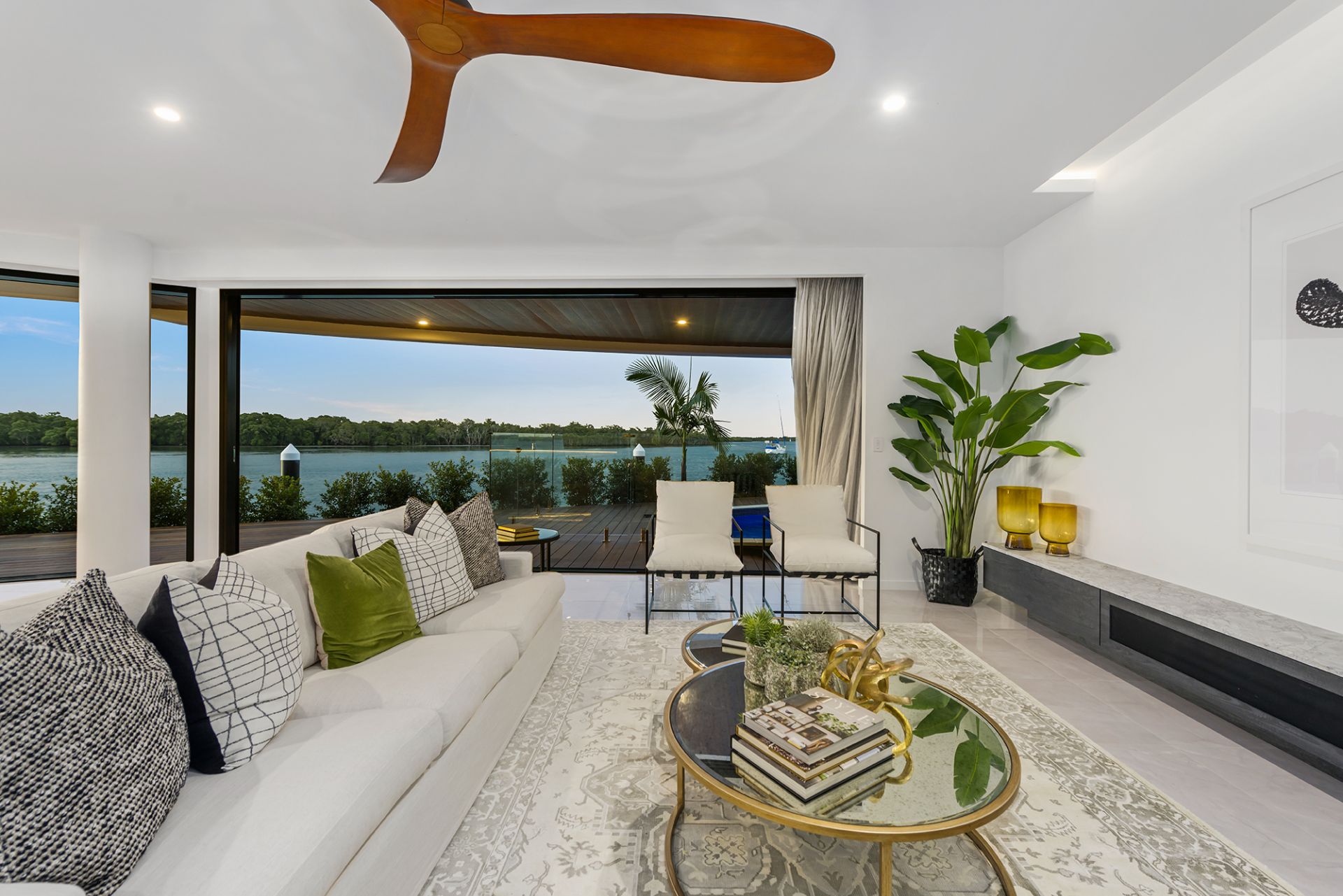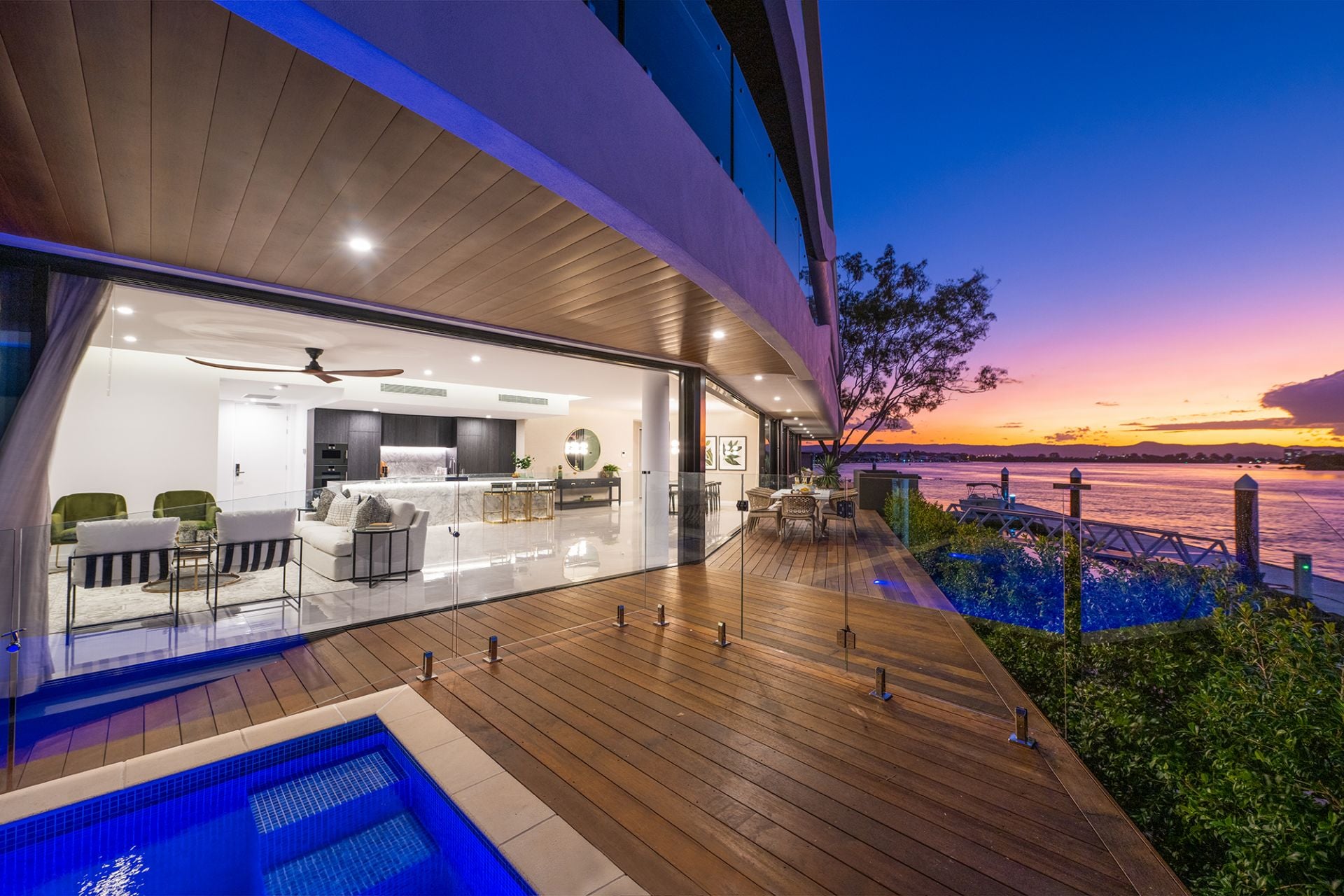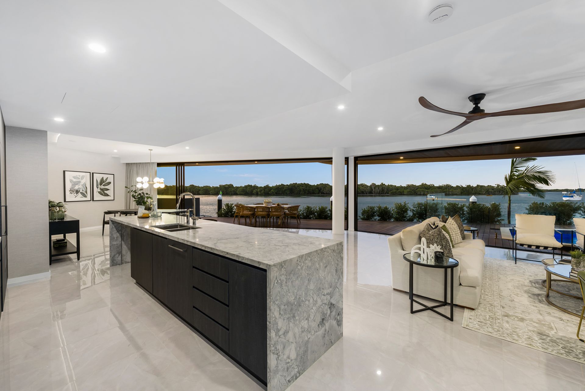 - Sprawling alfresco deck offering stunning views of the wide waterways and complemented by a pristine, fully tiled swimming pool