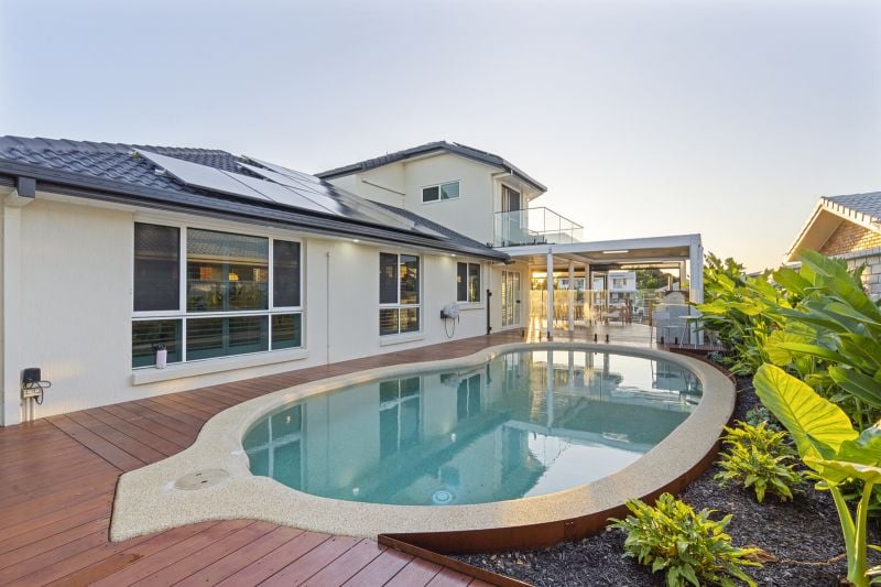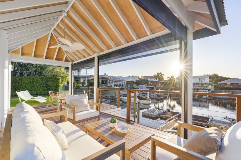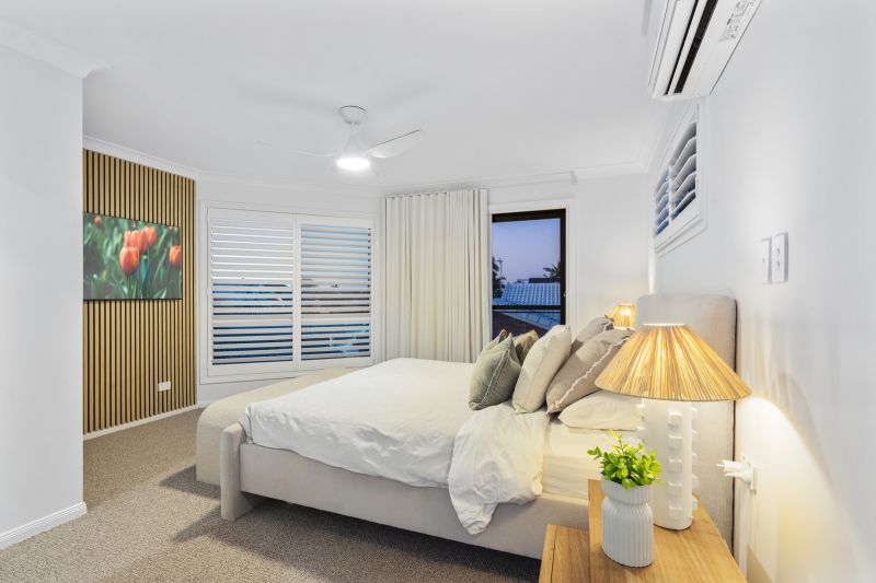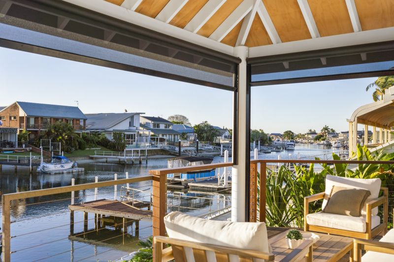 Designed for year-round entertaining, the home opens to multiple outdoor living spaces including an outdoor kitchen, private pool area and peaceful waterfront alfresco zones. Boaties will love the 5m* powered pontoon with water connection, offering easy Broadwater access for weekend cruising, fishing or exploring. The top-floor master suite provides a private retreat with its own balcony capturing tranquil water and hinterland views, a serene escape at the end of each day.