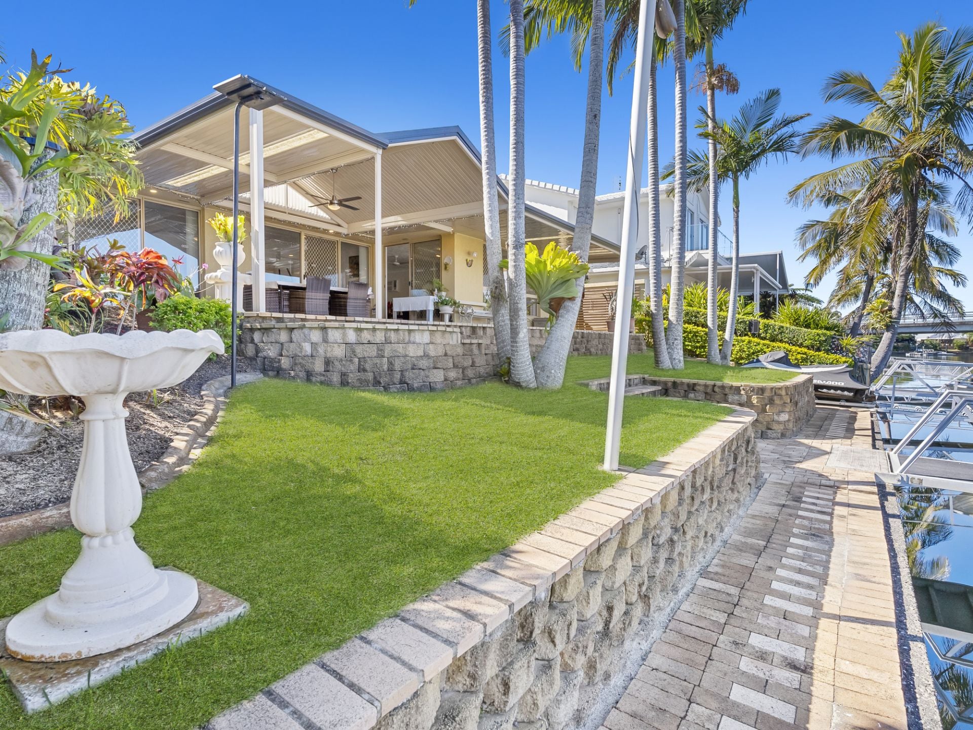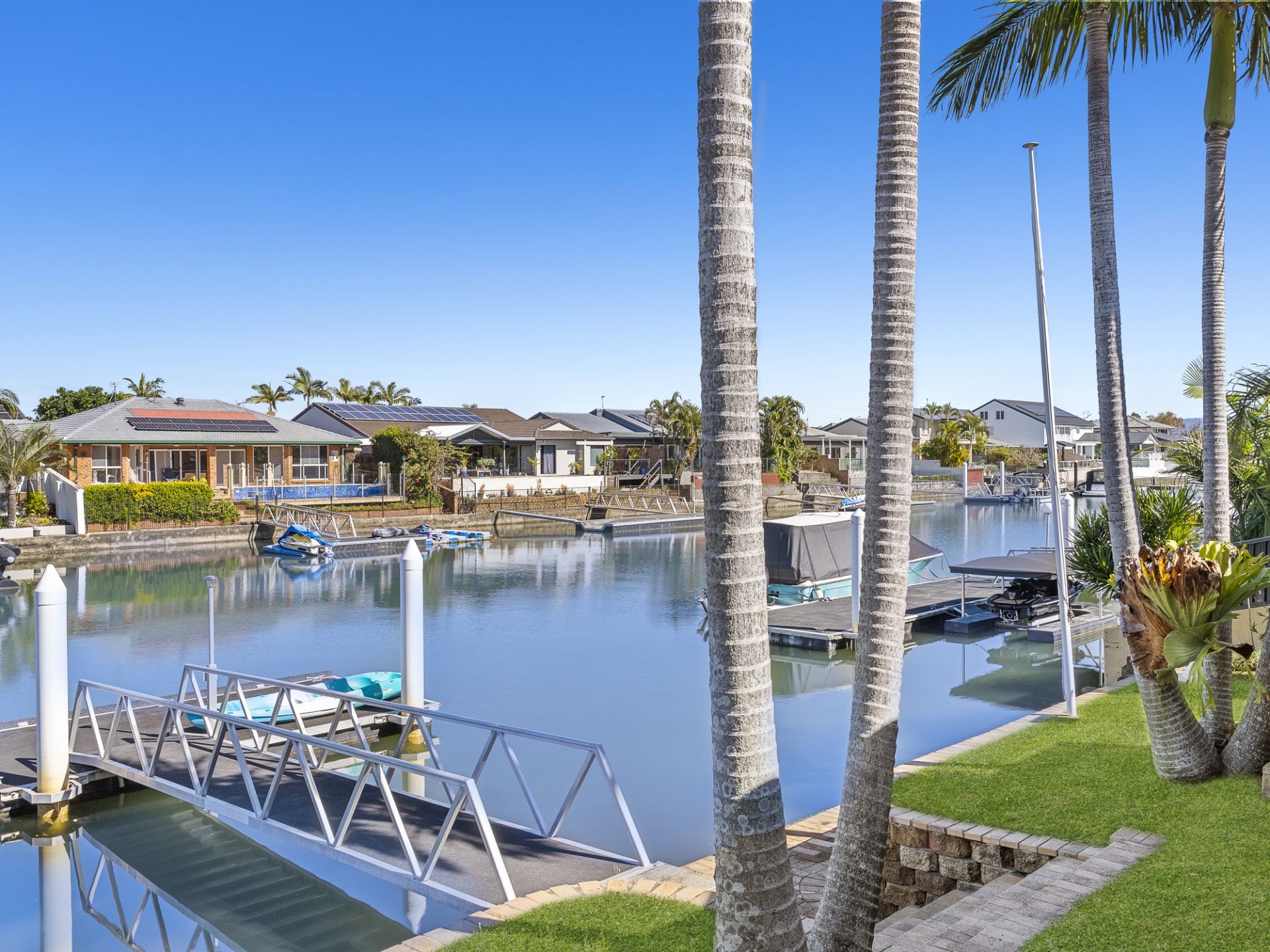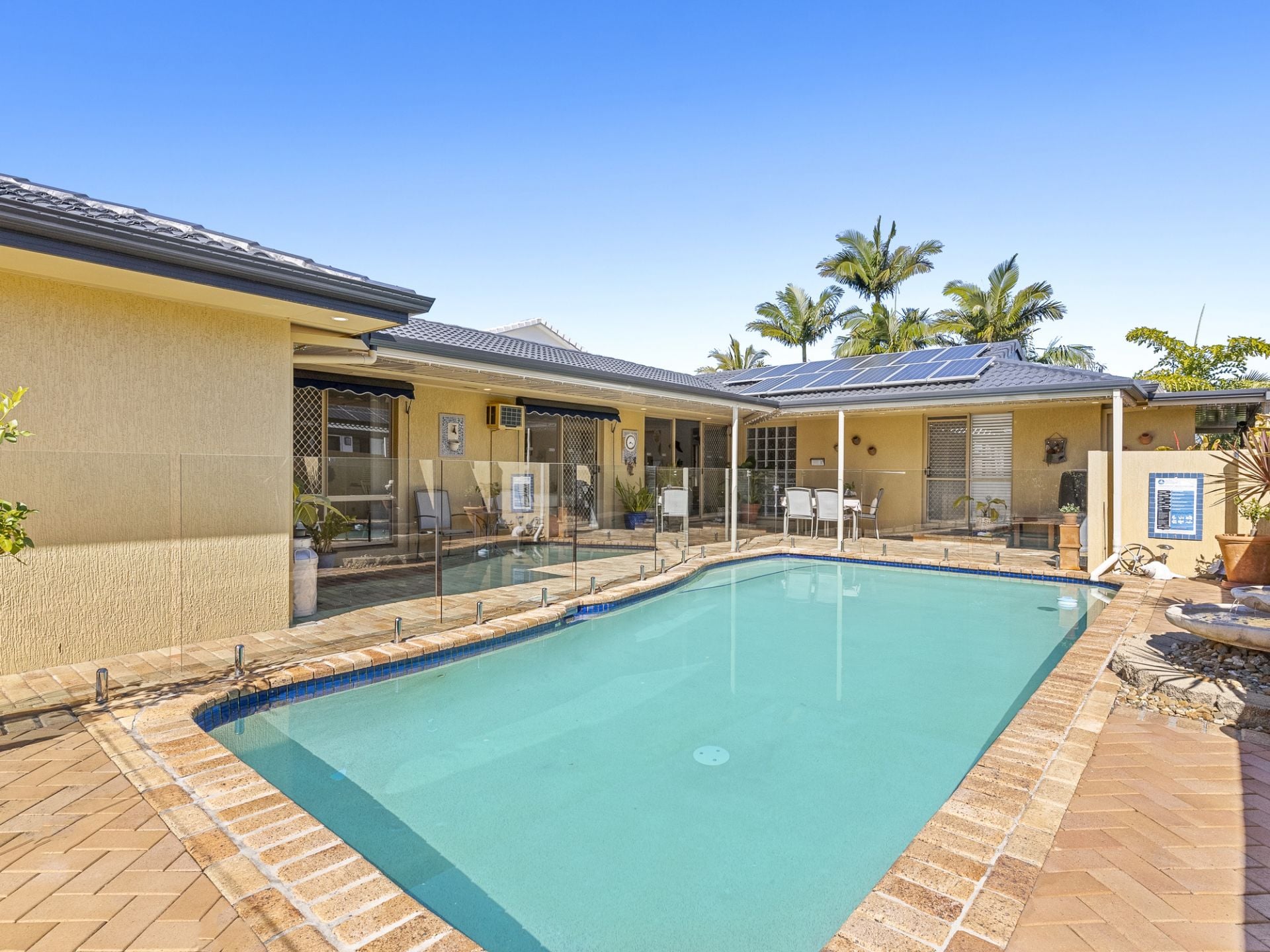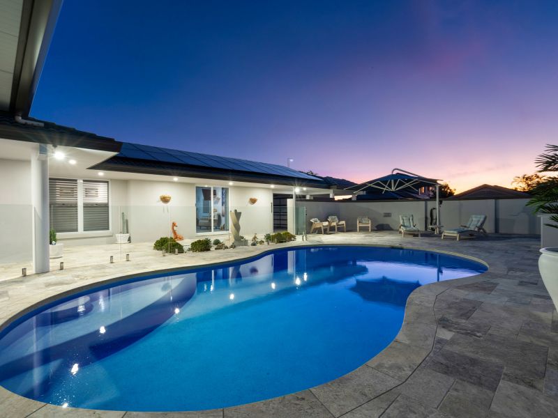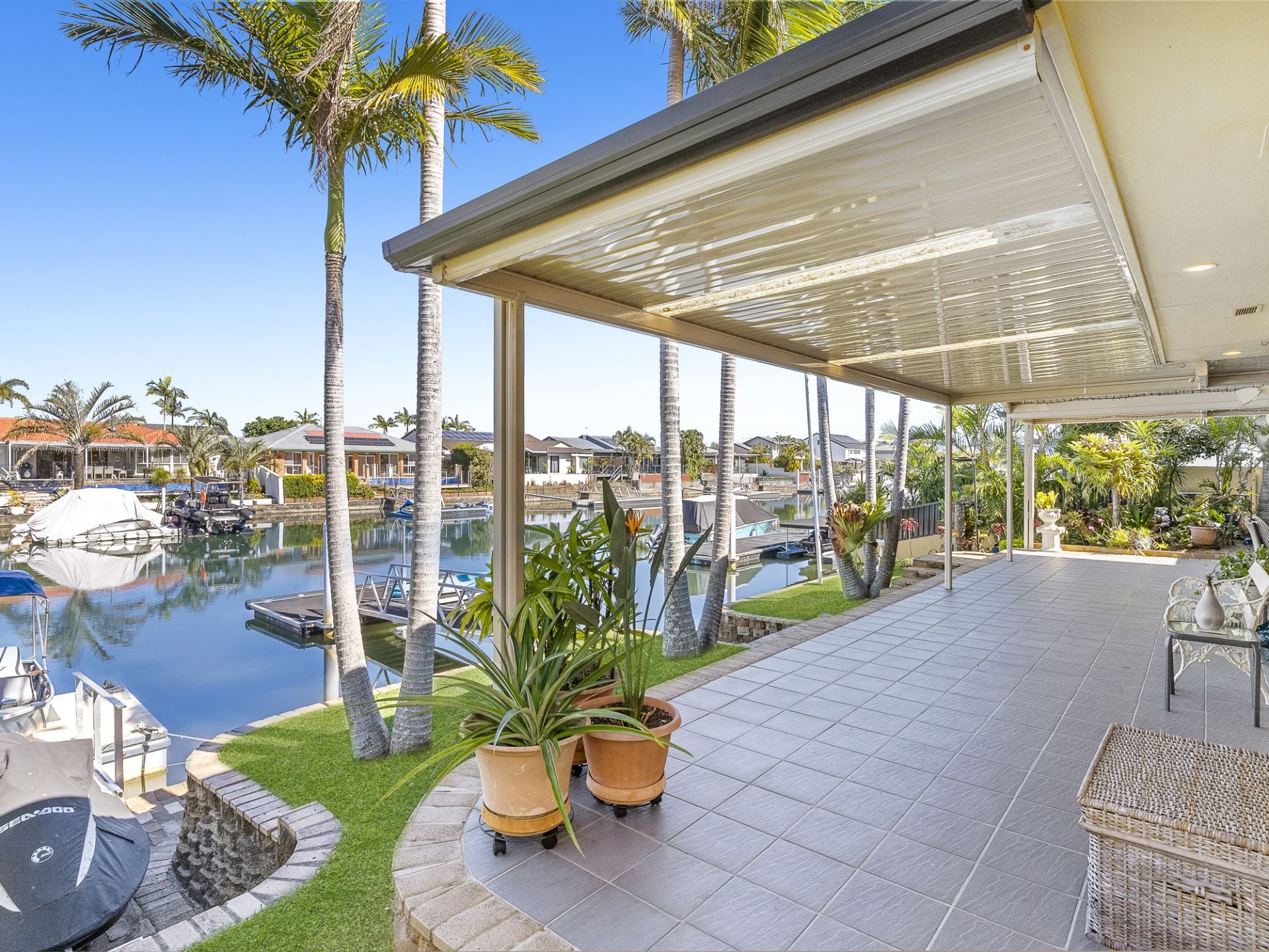 Outside, the home continues to impress. A sun-drenched north-facing courtyard features a private swimming pool, perfectly positioned for year-round enjoyment. This is a home made for entertaining, where indoor spaces seamlessly connect to outdoor living, allowing you to host unforgettable gatherings with ease. And when the mood strikes to take to the water, your own floating pontoon and private boat ramp await-offering instant access to the waterway for boating, fishing, or simply enjoying the coastal breeze.