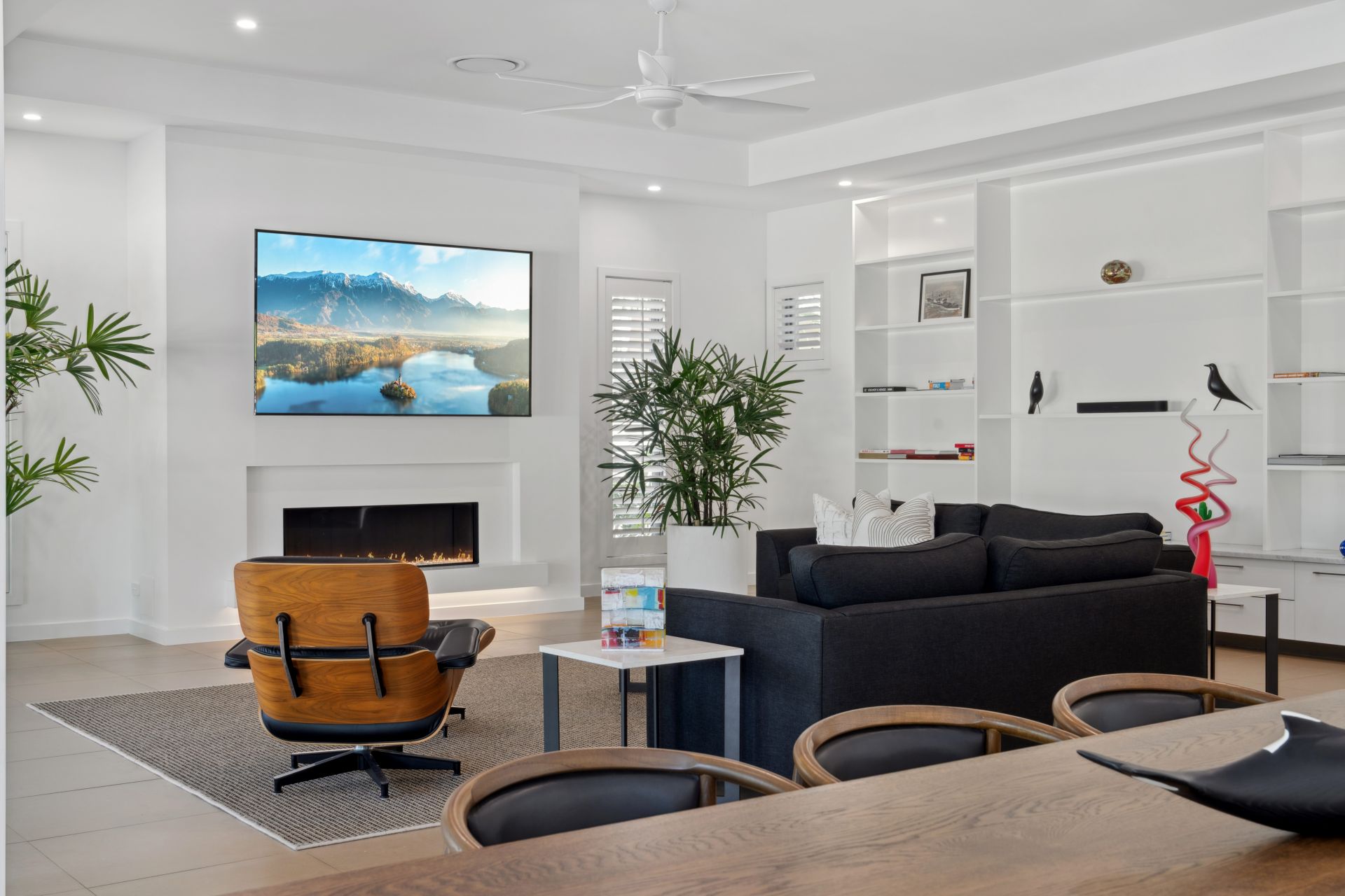 Contemporary Design: Open-concept living with soaring ceilings, accessible corridors, and an Escea gas fireplace, creating a sense of light and space.