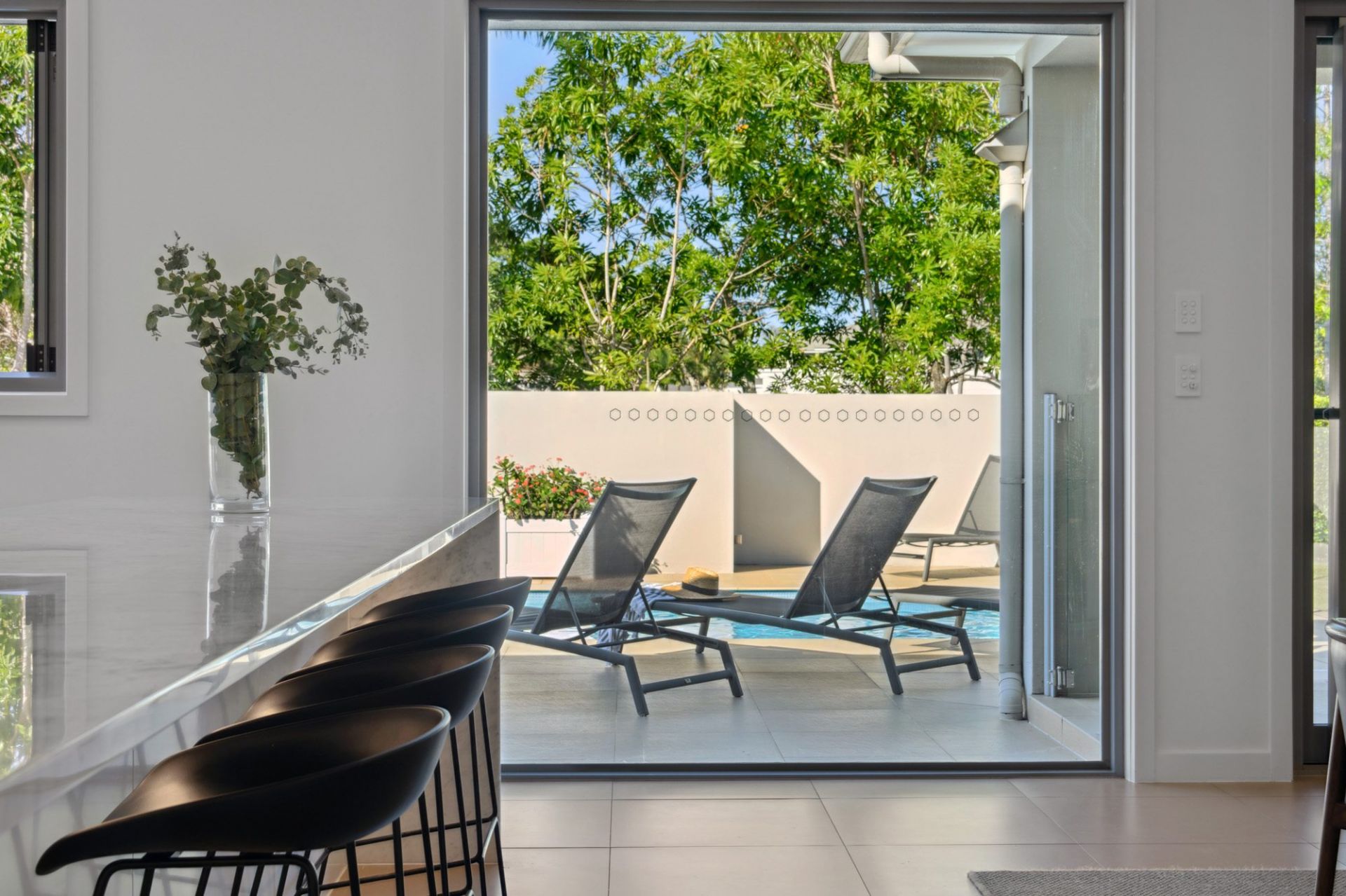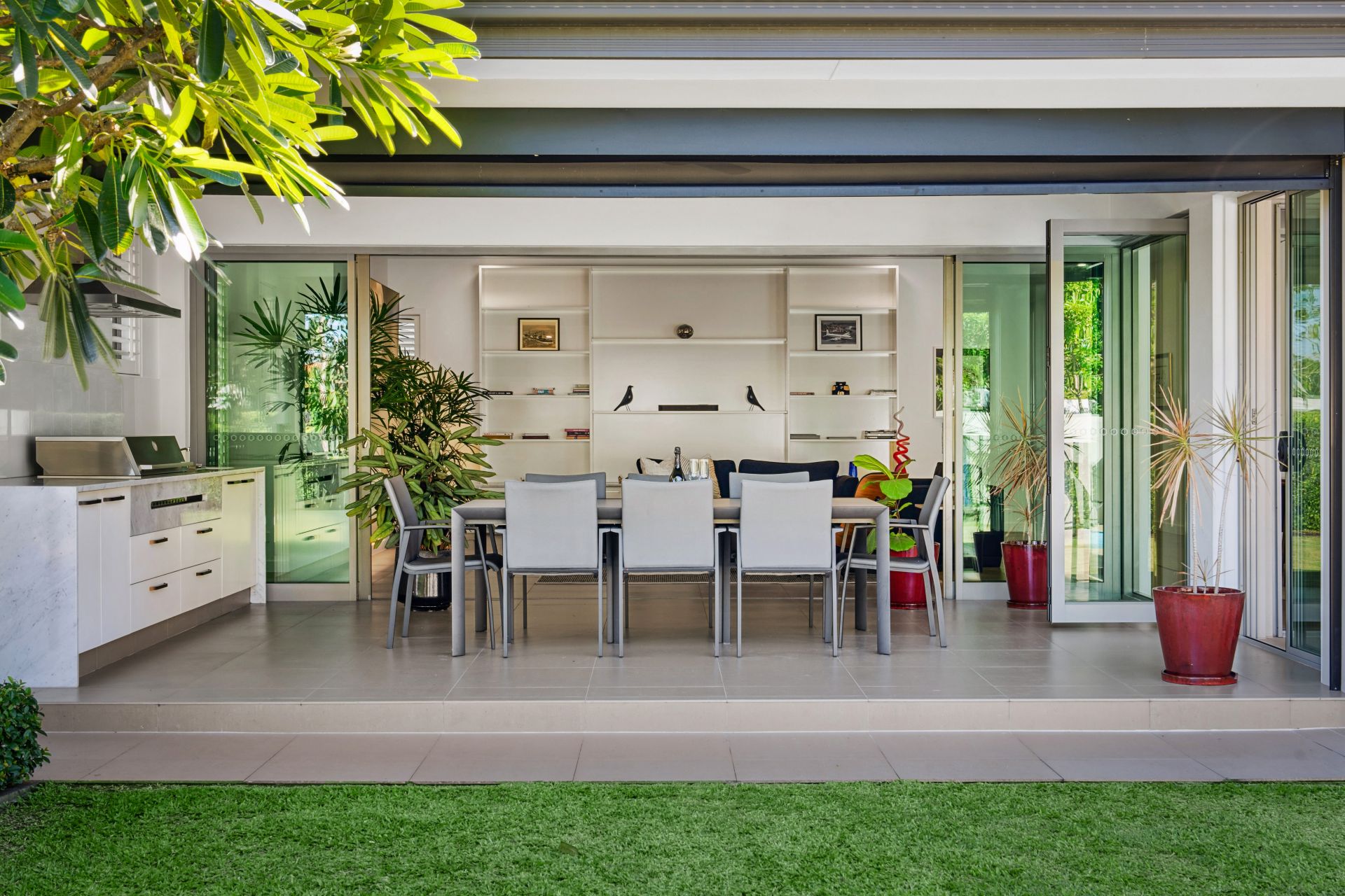 Outdoor Entertaining: Screened alfresco living room with built-in BBQ kitchen, stovetop, and plumbed water – all overlooking the sparkling resort-style pool.