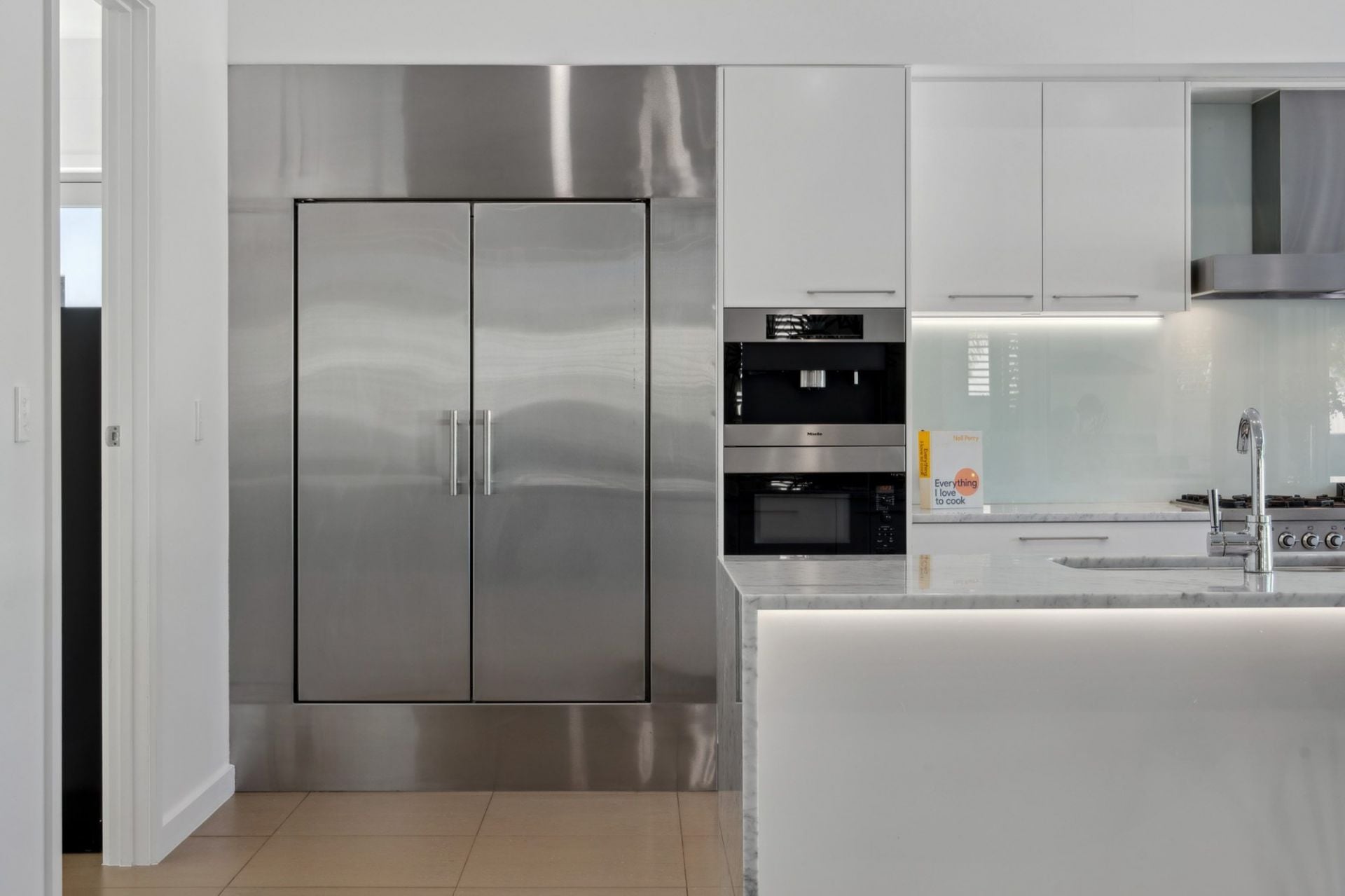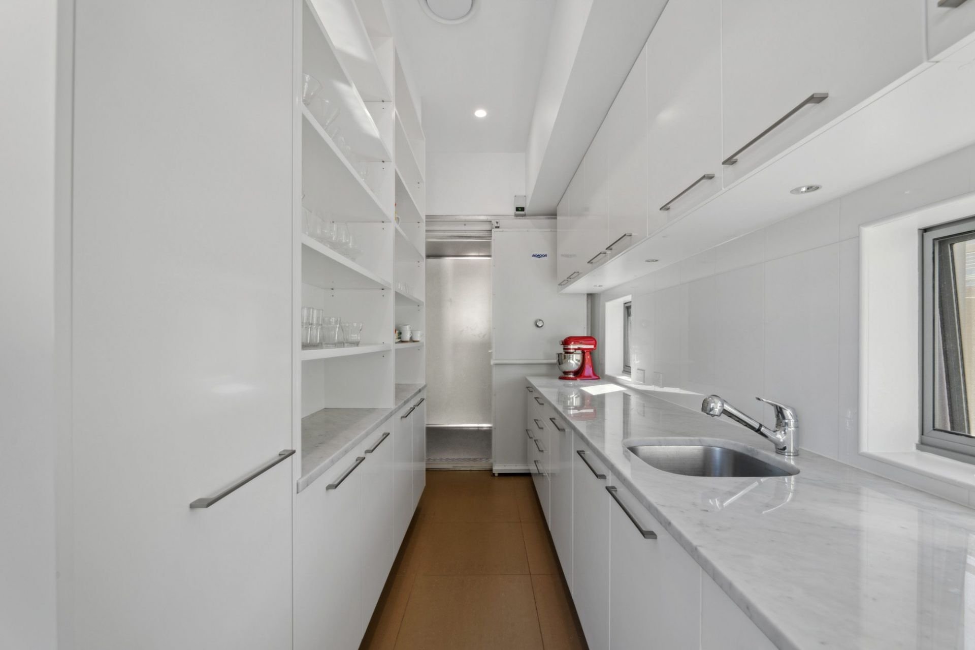 Chef's Kitchen: A luxury kitchen, a culinary dream featuring stone benchtops, an expansive butler's pantry, and premium appliances, including an Ilve stainless steel 6-burner with teppanyaki cooktop, dual ovens, and twin dishwashers. The kitchen is further enhanced by a large double-door front acess professional-grade with a rear walk-in fridge, with space for an additional fridge, - ideal for those who love to entertain.