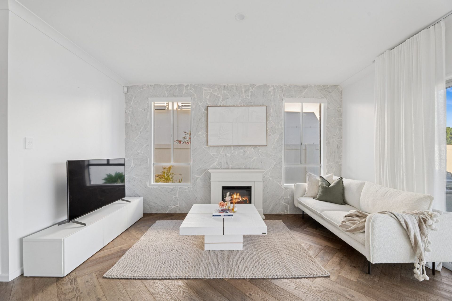 - Striking French oak herringbone timber flooring and plush bedroom carpets