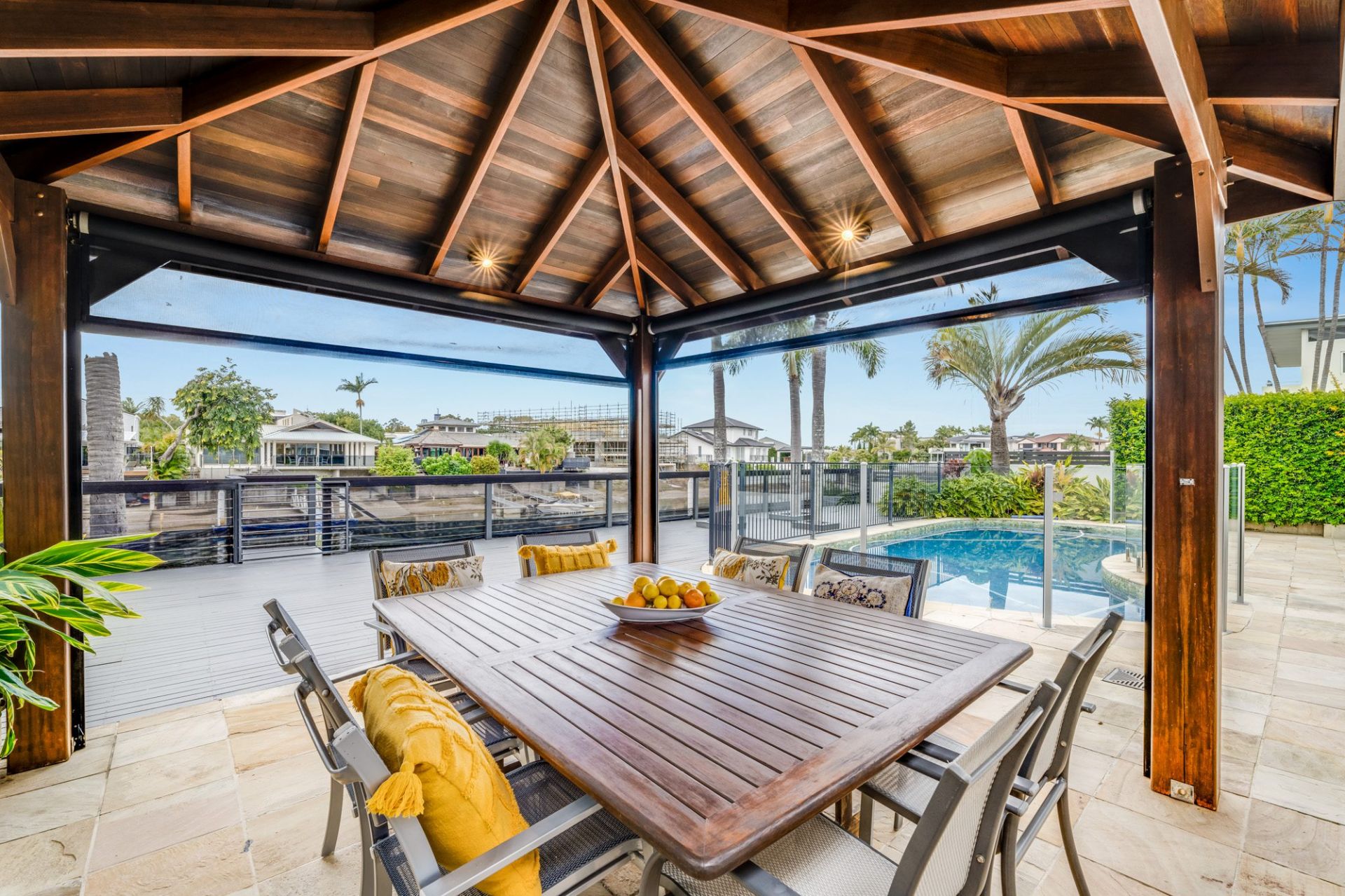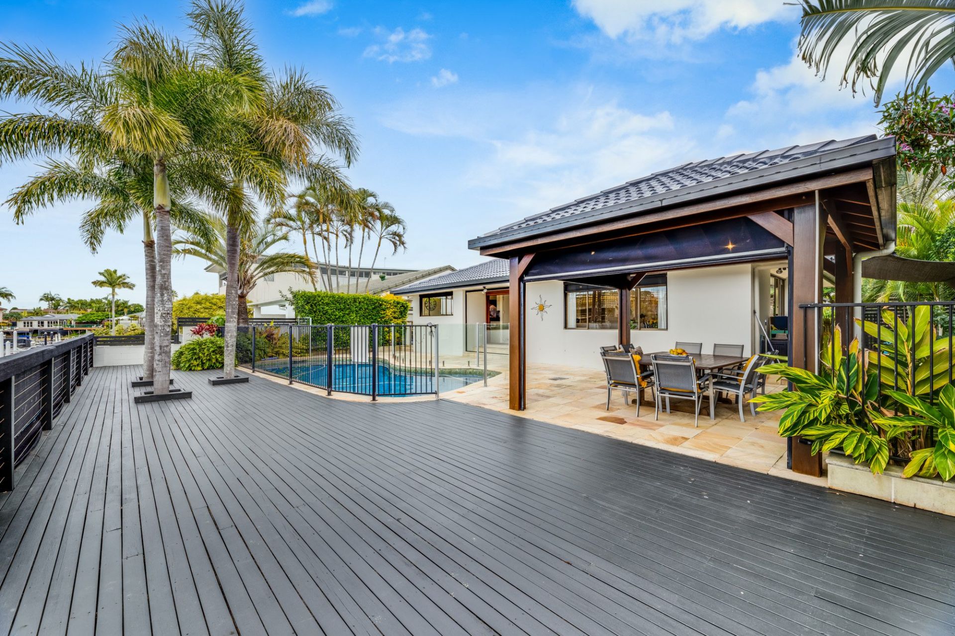Outside is a long Swimming Pool on the waterside, with a gorgeous sheltered tropical outdoor dining. Alfresco here captures the morning sunshine; entertain on the sandstone pavers, with a setting of Surfers paradise as the backdrop, making use of a vast timber deck.