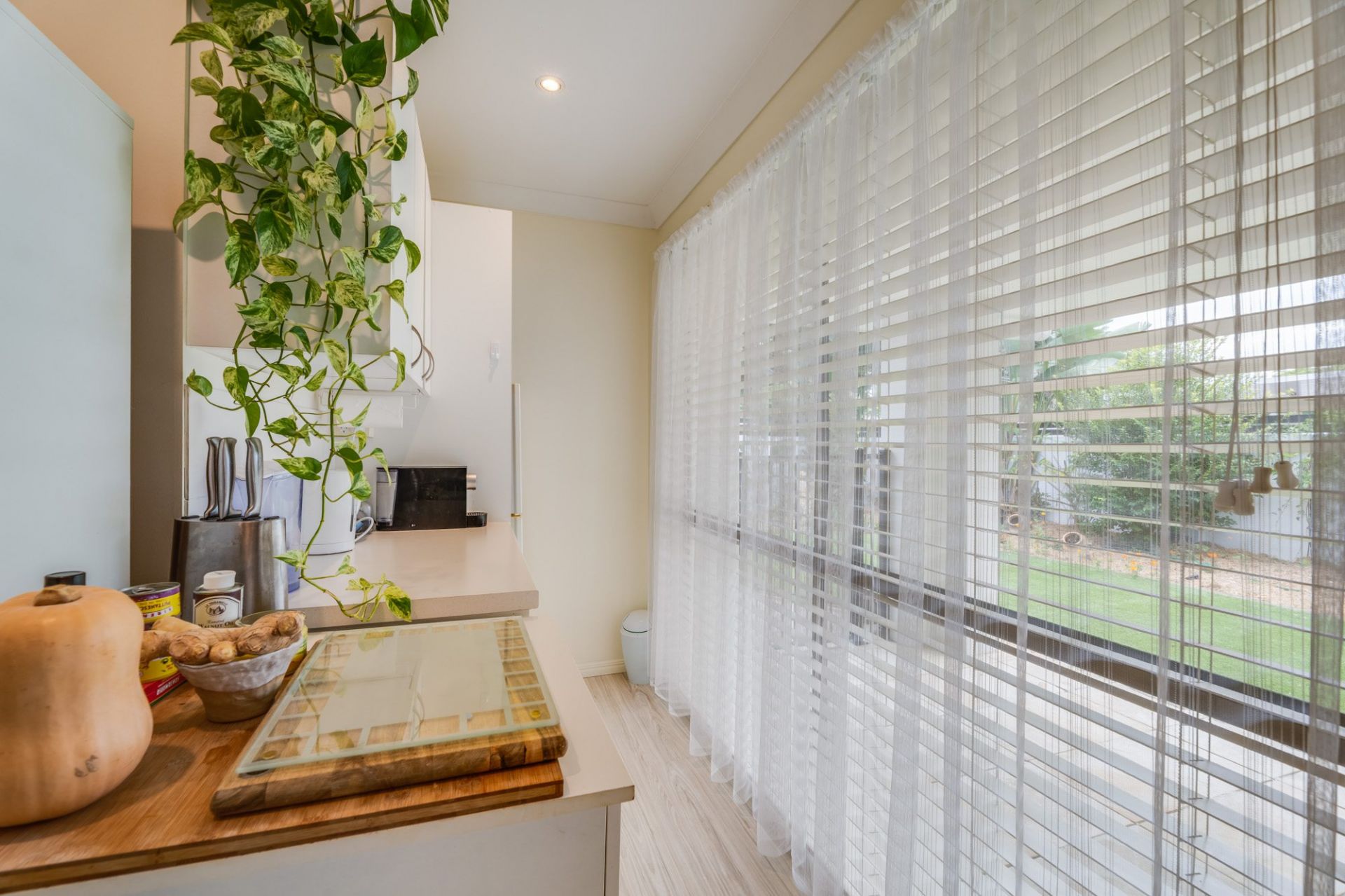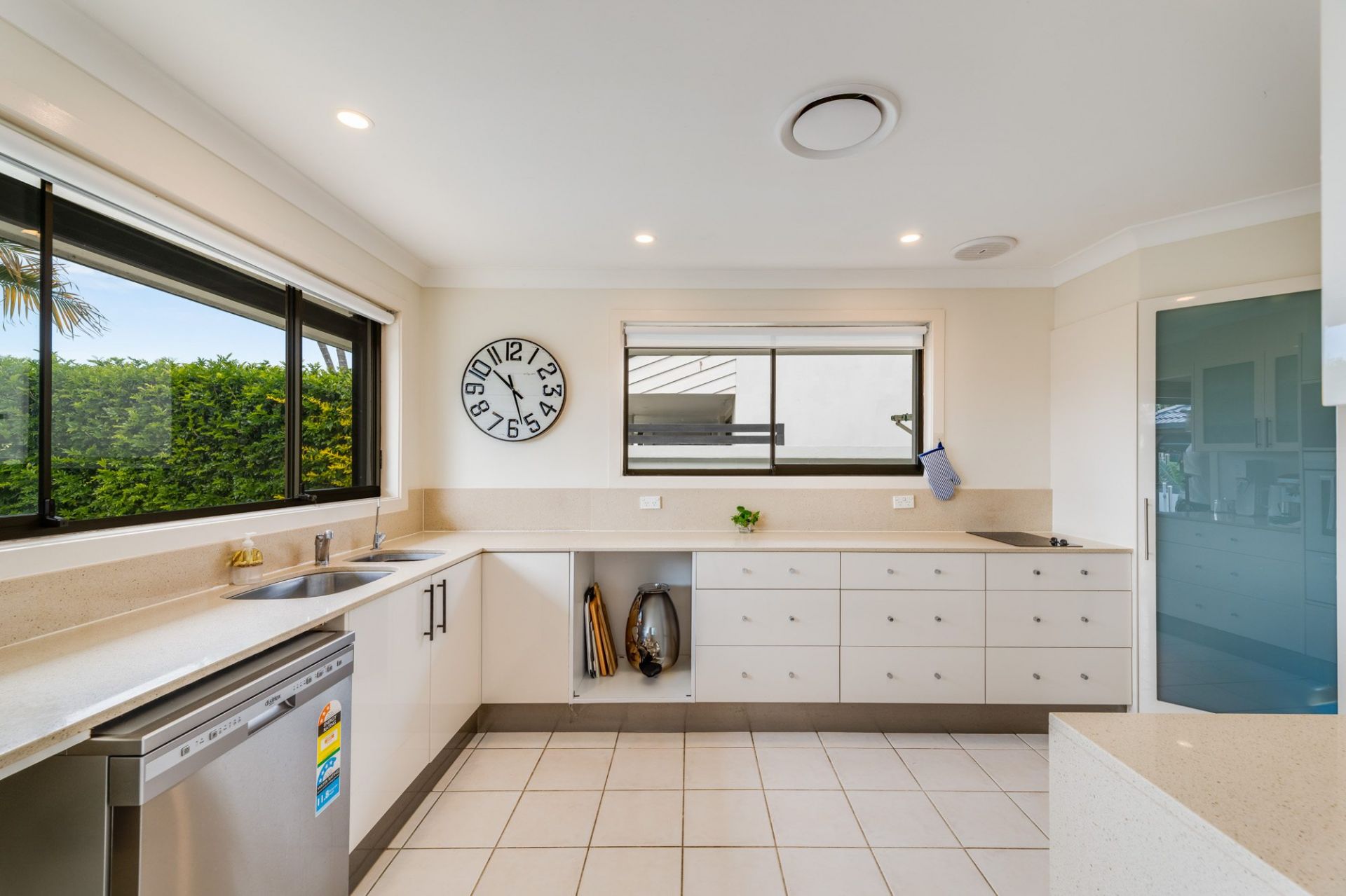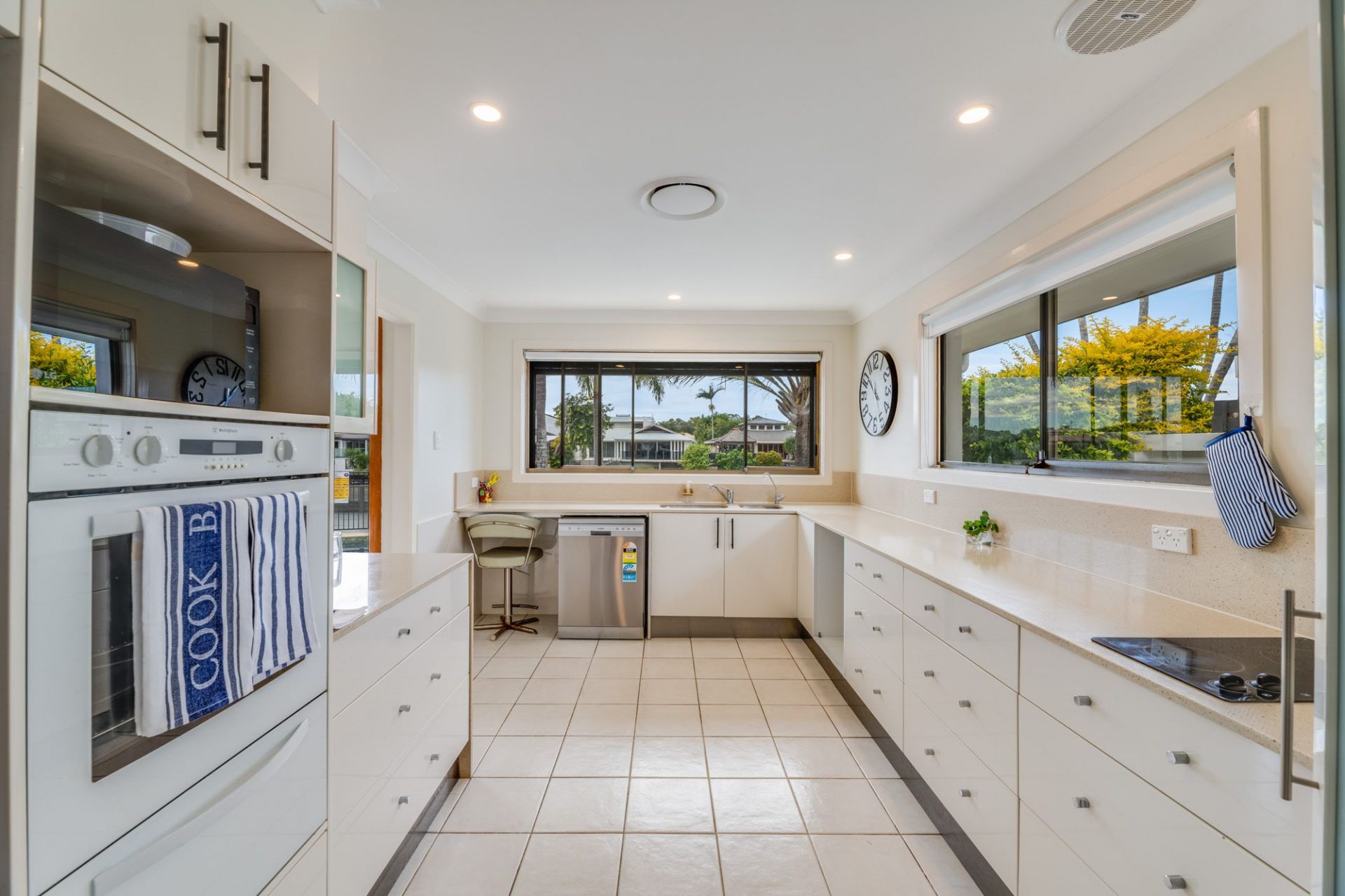 The light filled kitchen has banks of drawers, filtered water supply, modern wall appliances with views over the pool and a wide window – which can easily be turned into a servery for the entertainment area.