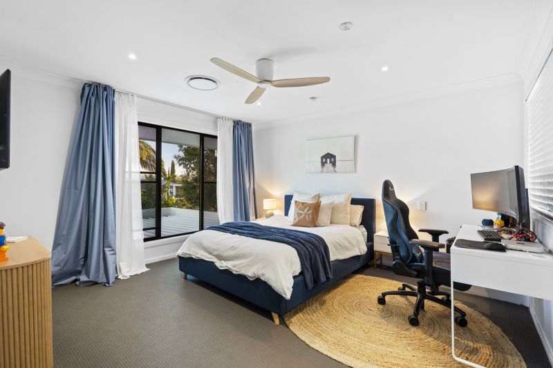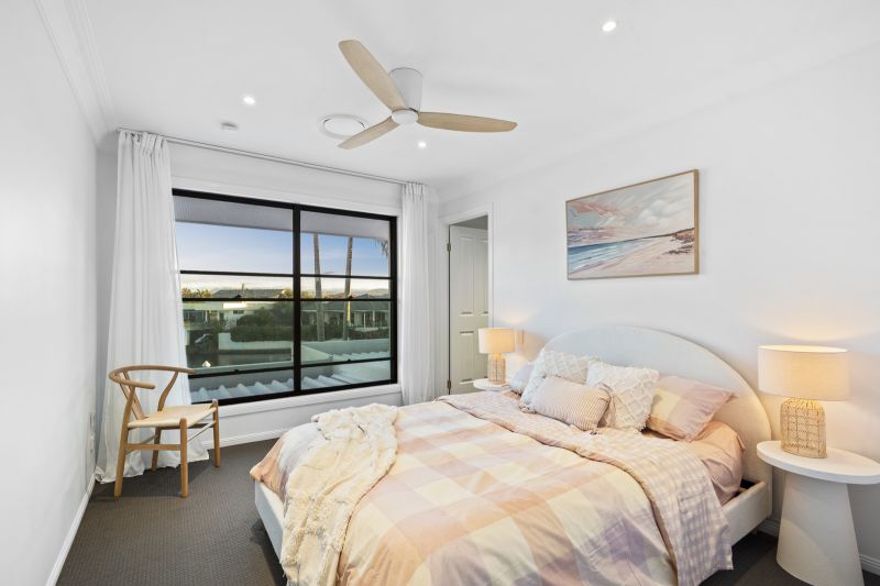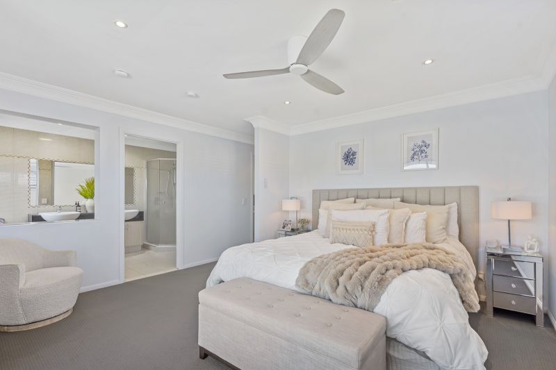 Upstairs, an open study nook flows to three generously proportioned bedrooms, all with walk-in robes and stunning water views. Two bedrooms share a well-appointed two-way bathroom, while the grand master retreat boasts a deluxe spa ensuite and an expansive walk-in robe – your own private escape.