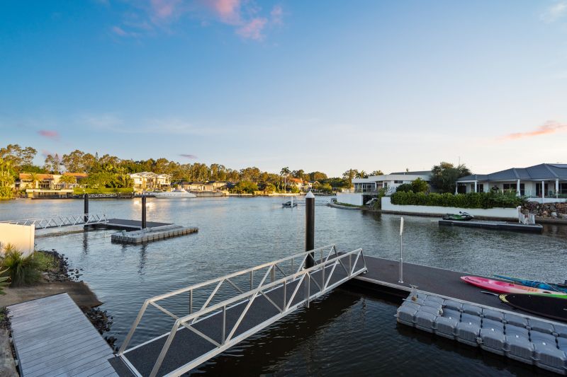 The covered alfresco deck-complete with built-in wet bar and dual fridges-overlooks the tranquil water and opens onto a series of outdoor indulgences: multiple sunbathing decks, a serene hot tub, a pebbled fire-pit retreat, and a waterfront dining terrace with astroturf underfoot. Completing this entertainer's haven is a private pontoon and concrete boat ramp, ensuring seamless access to the waterways just metres from the Main River.