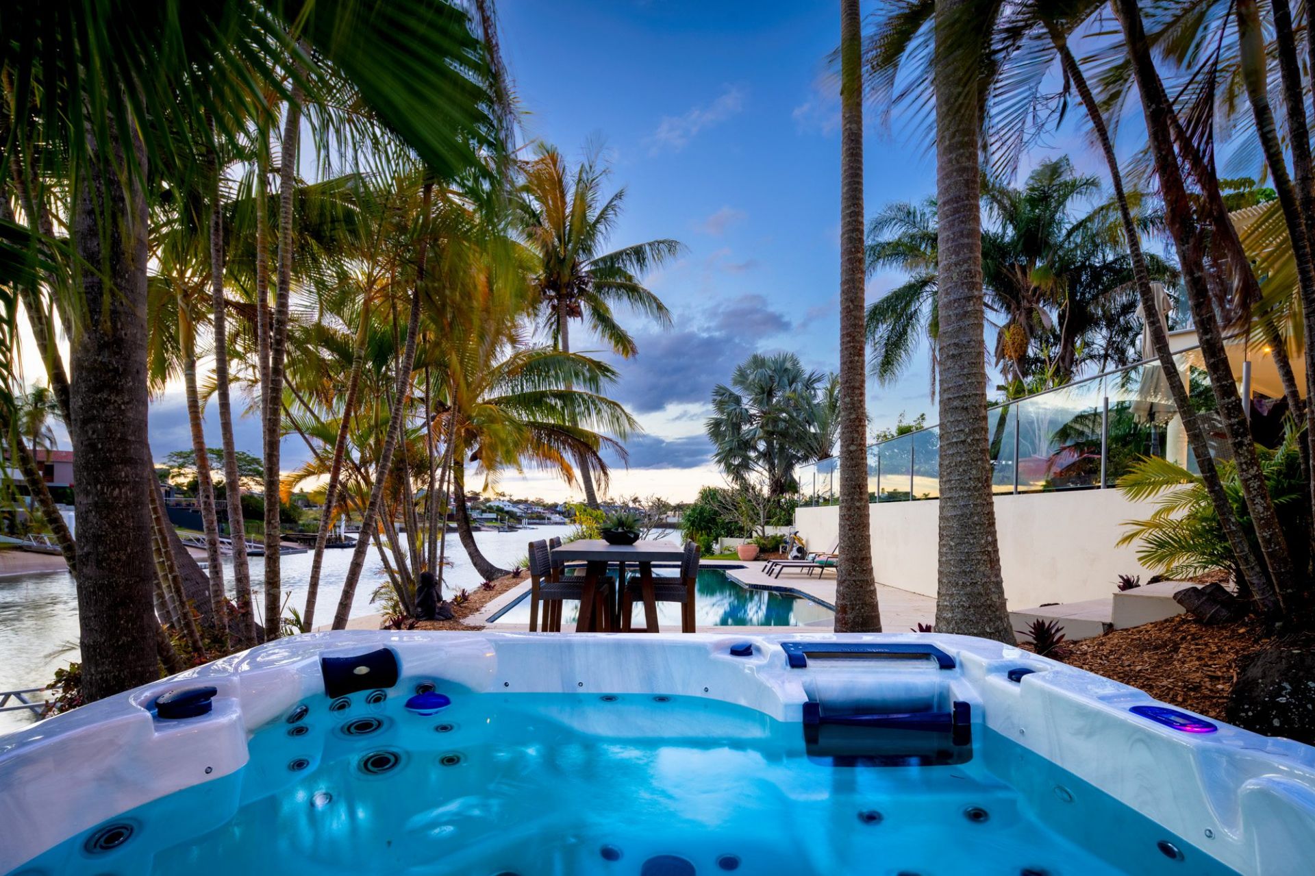 • Sparkling pool, hot tub spa, and tropical gardens set against the panoramic canal backdrop