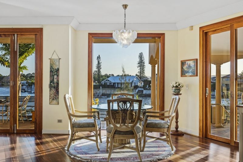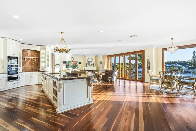 At the heart of the home lies an ornate designer kitchen - beautifully appointed with bespoke detailing, premium finishes, and high-end timber flooring that adds warmth and sophistication throughout. The seamless indoor-outdoor transition leads to a superb entertaining terrace, resort-style pool, spa and private pontoon, where endless days on the water await.