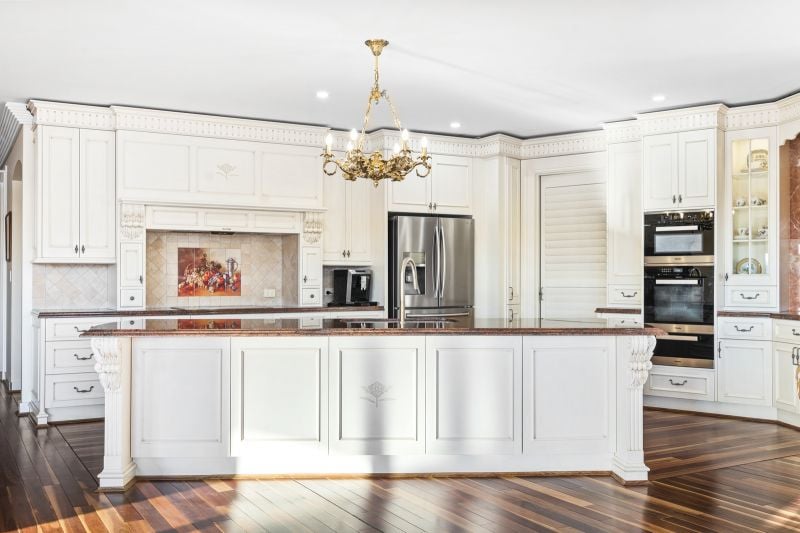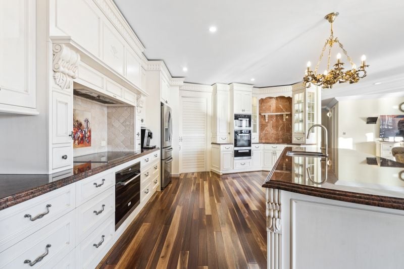 • Ornate designer kitchen with bespoke detailing, premium finishes, and high-end timber flooring