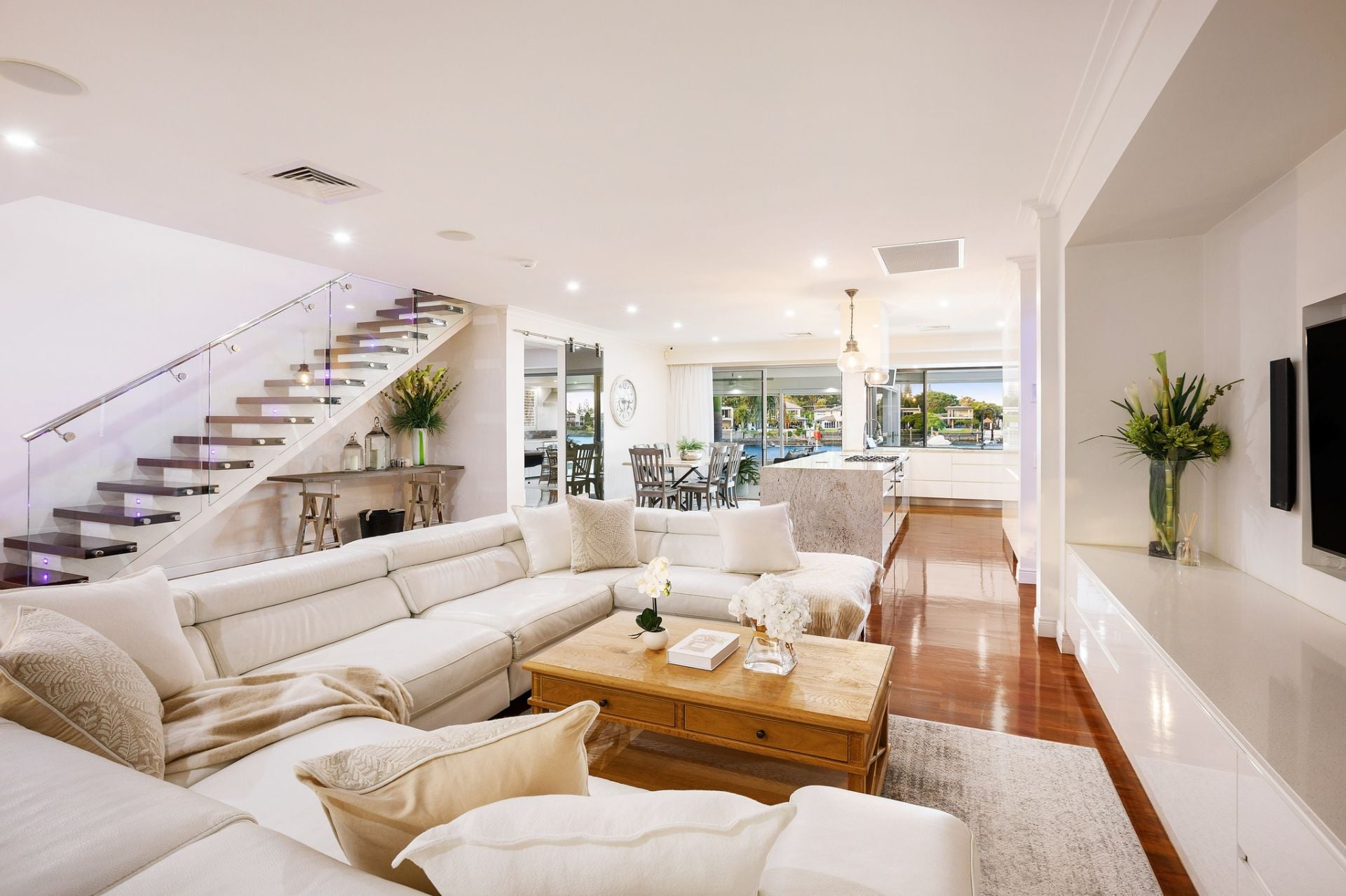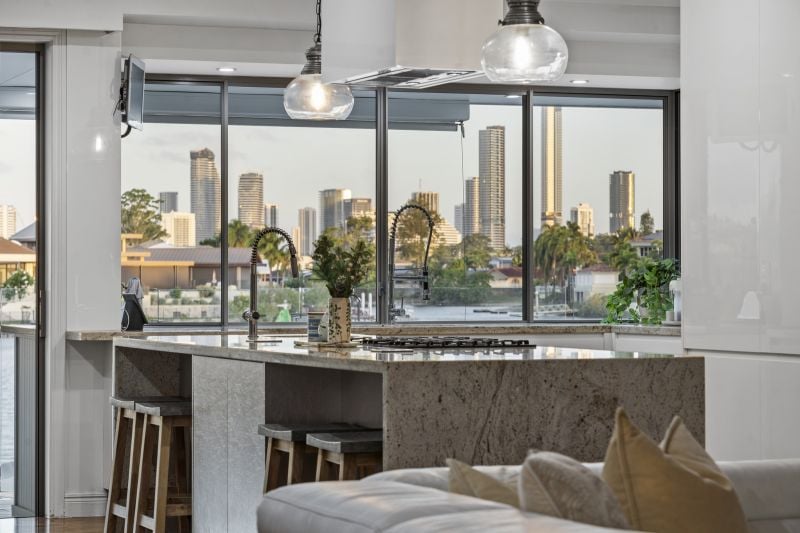 Formal occasions are effortlessly hosted in the elegant living room, while the expansive open-plan living, dining and kitchen zone forms the vibrant heart of the home. Bathed in natural light and framed by water vistas, this space flows seamlessly outdoors via servery windows and expansive sliding doors, creating a flawless indoor–outdoor connection.