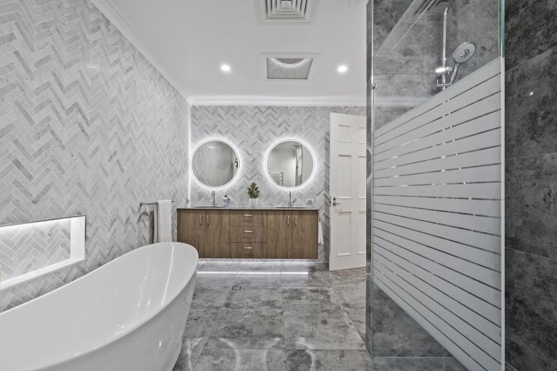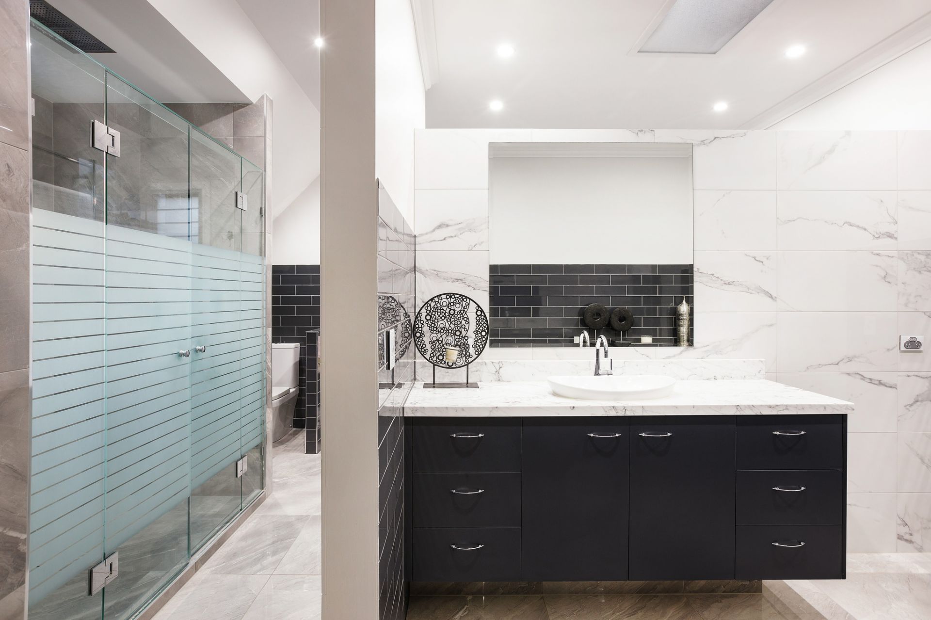 • Multiple designer bathrooms with floor-to-ceiling tiling