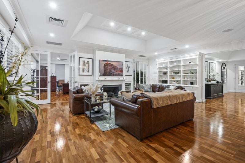 A flawless, no-expense-spared renovation has transformed the residence into a sophisticated yet welcoming sanctuary. The crisp white rendered façade sets the tone for the refined interiors, where rich timber flooring, premium natural stone, bespoke plaster detailing and elegant plantation shutters combine to create a timeless aesthetic of understated luxury.