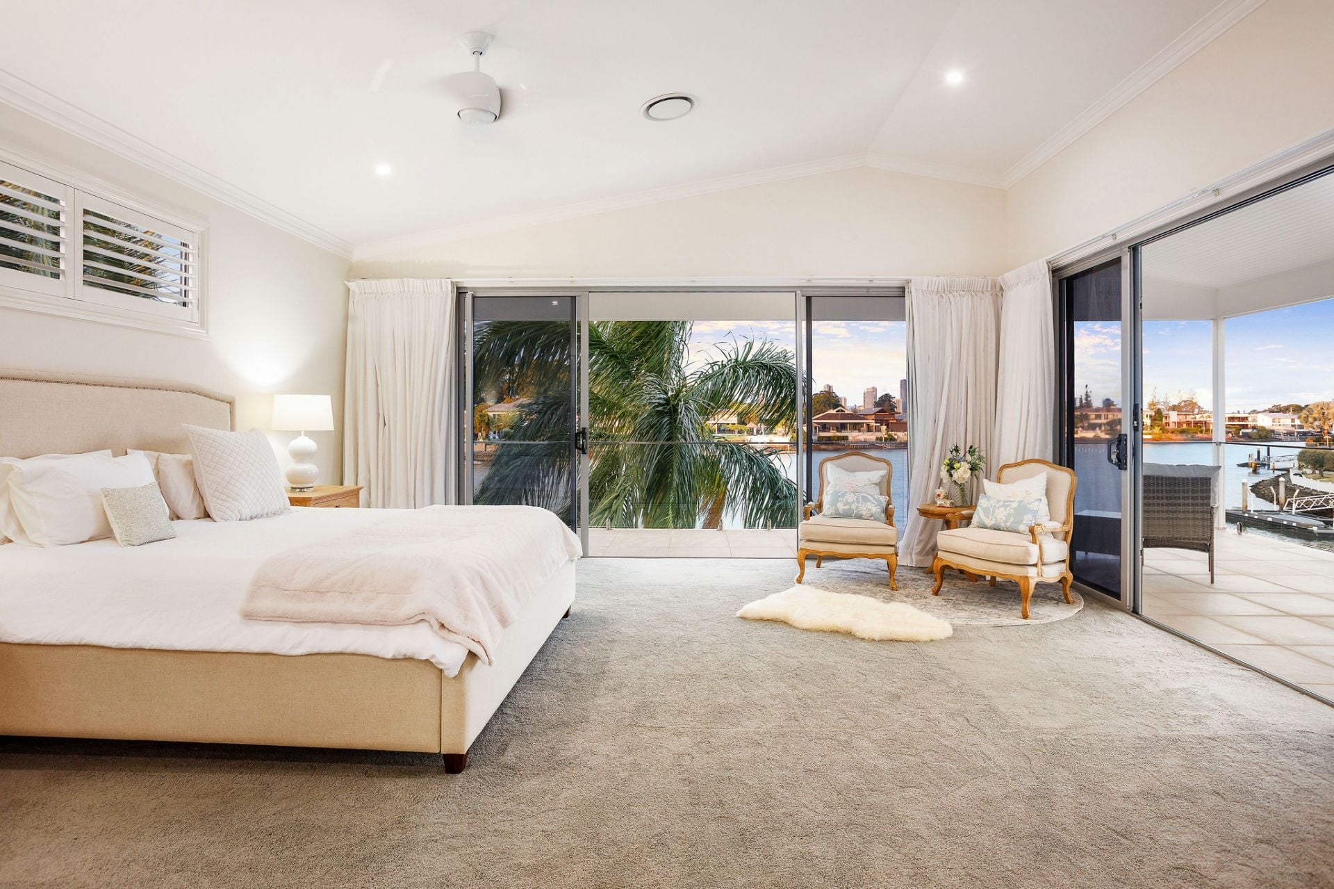 Occupying the entire upper level, the indulgent master retreat is a private haven of exceptional scale. Featuring dual walk-in robes, a lavish ensuite and a wraparound waterfront balcony, it offers a serene parents' sanctuary with uninterrupted river and skyline views. Three further bedrooms are positioned within a separate wing, each generously proportioned with walk-in robes and bathroom access, providing privacy and comfort for family and guests alike.