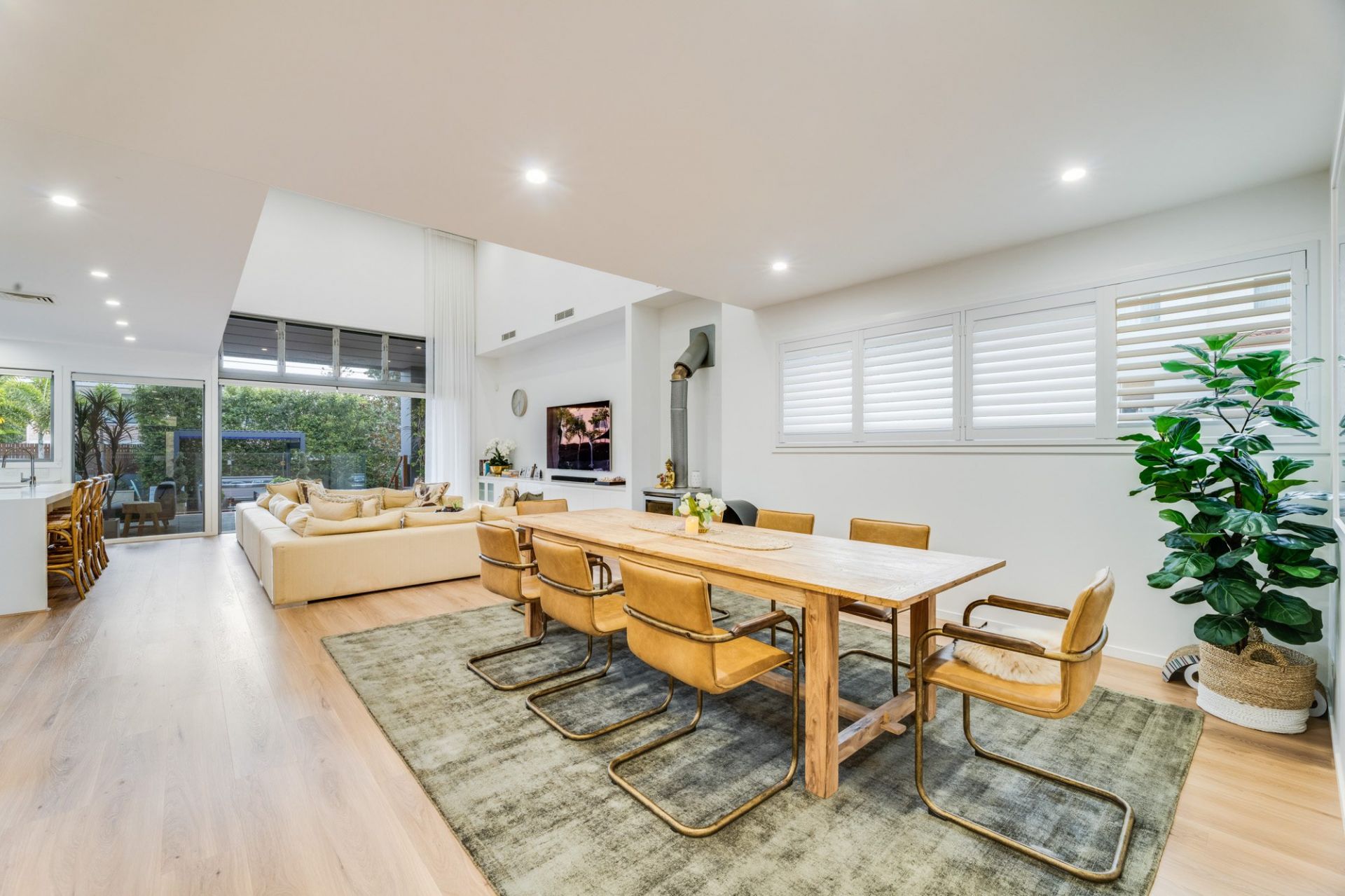 Spread across three meticulously designed levels including a basement, this exceptional home showcases premium ironbark hybrid flooring and a cozy combustion wood fire heater, adding warmth and charm to its sophisticated interiors. High ceilings and strategically placed louvred windows invite natural light and coastal breezes, enhancing the spaciousness of each room.