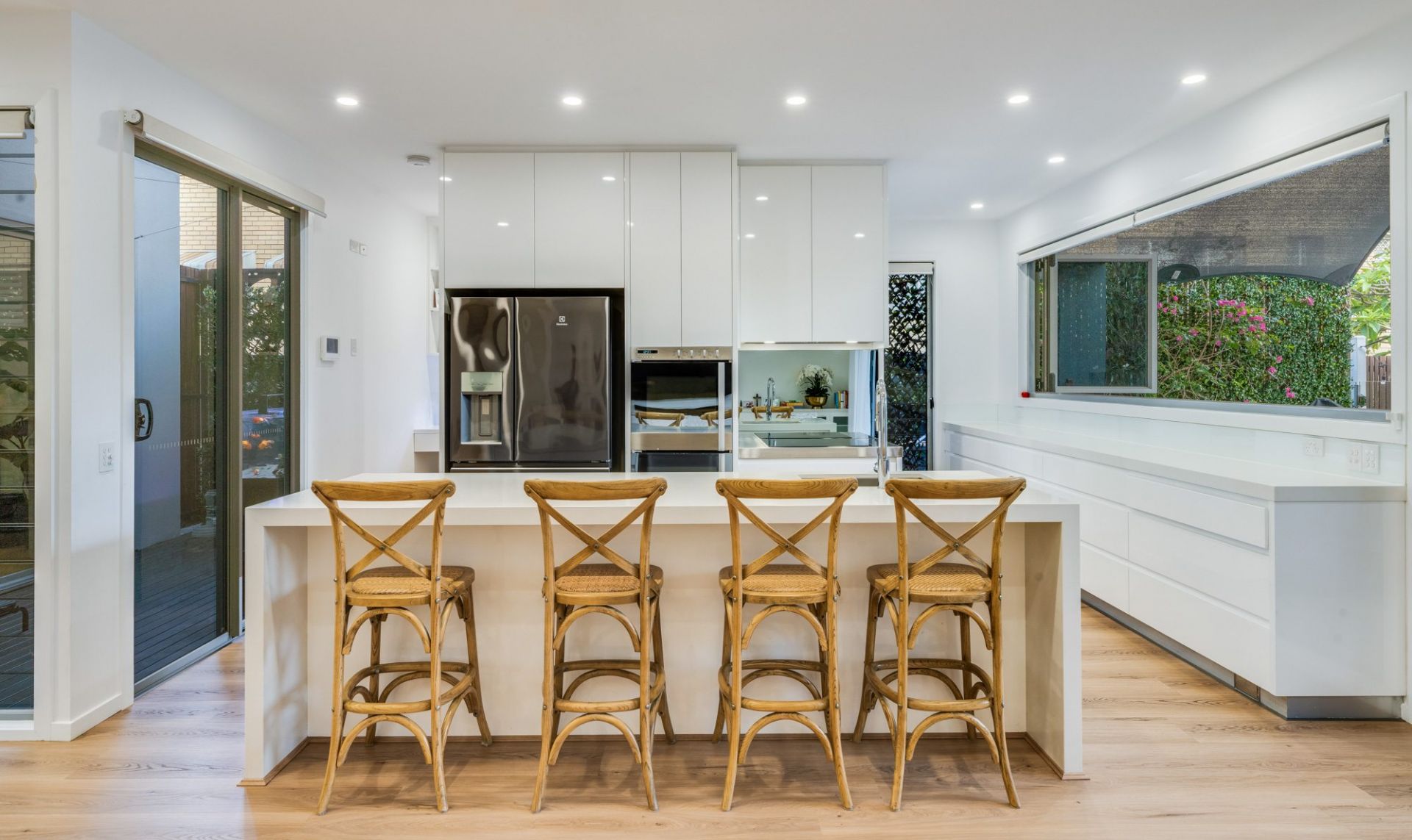 The gourmet kitchen is a chef's dream, boasting high-end appliances, a Miele induction cooktop, a vast Caesar Stone island with breakfast seating, a walk-through butler's pantry, a built-in study nook, and a convenient servery window that seamlessly connects to the outdoor entertaining areas.