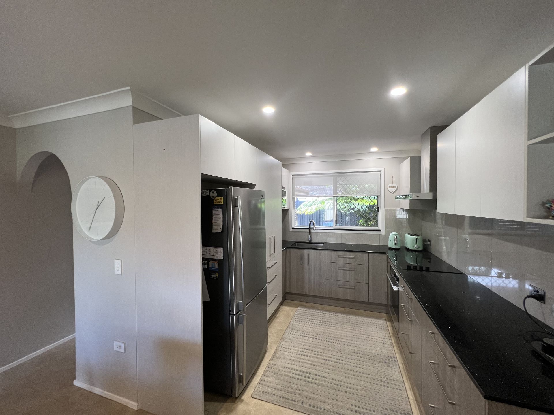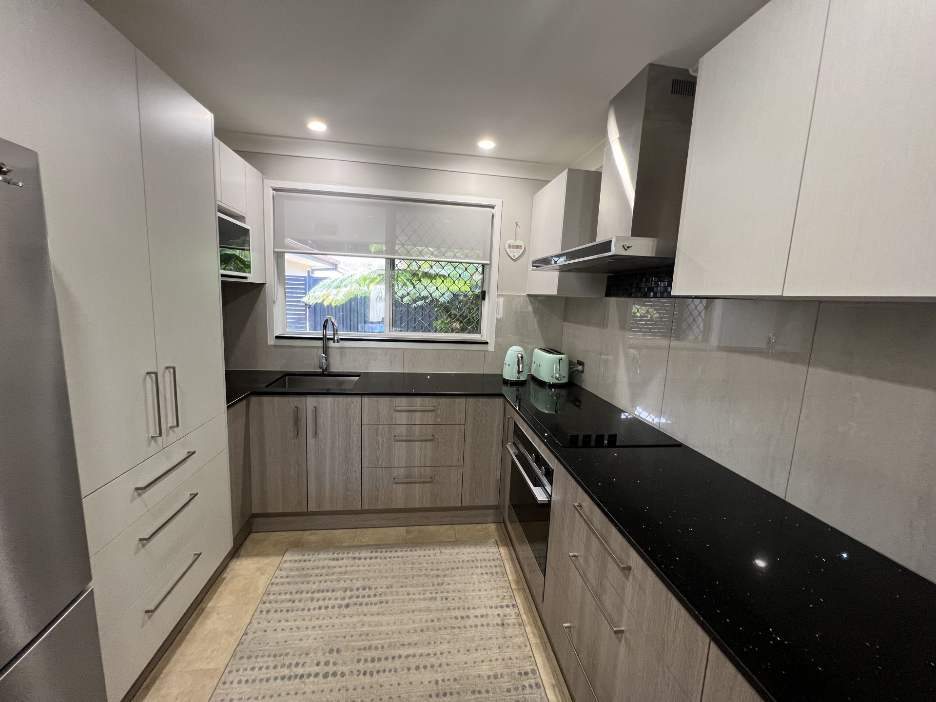 Renovated modern kitchen boasting Bosch electric cooktop, a high-end Fisher & Paykel oven, not to mention soft close draws and a granite bench top.