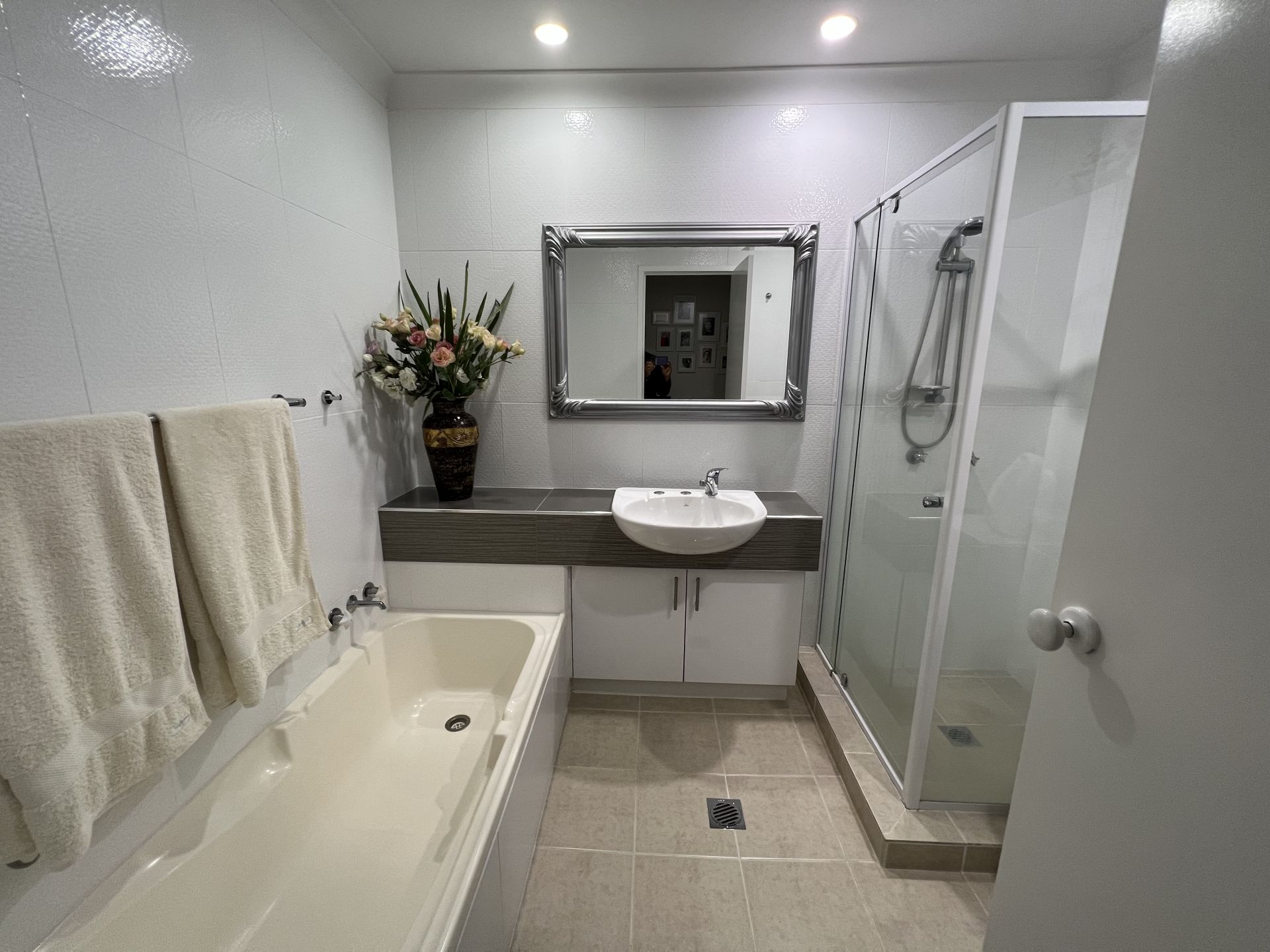 One generous sized bathroom includes a bath, shower and laundry and is fully tiled to the ceiling, with a seperate toilet.