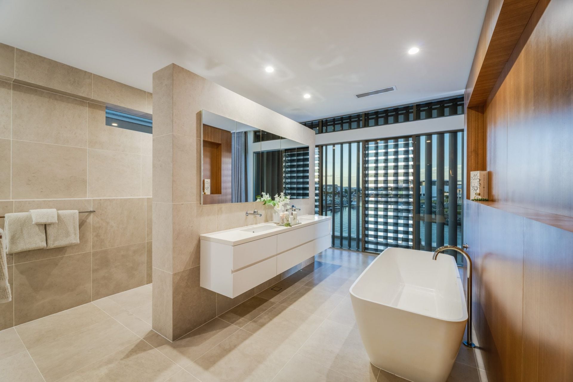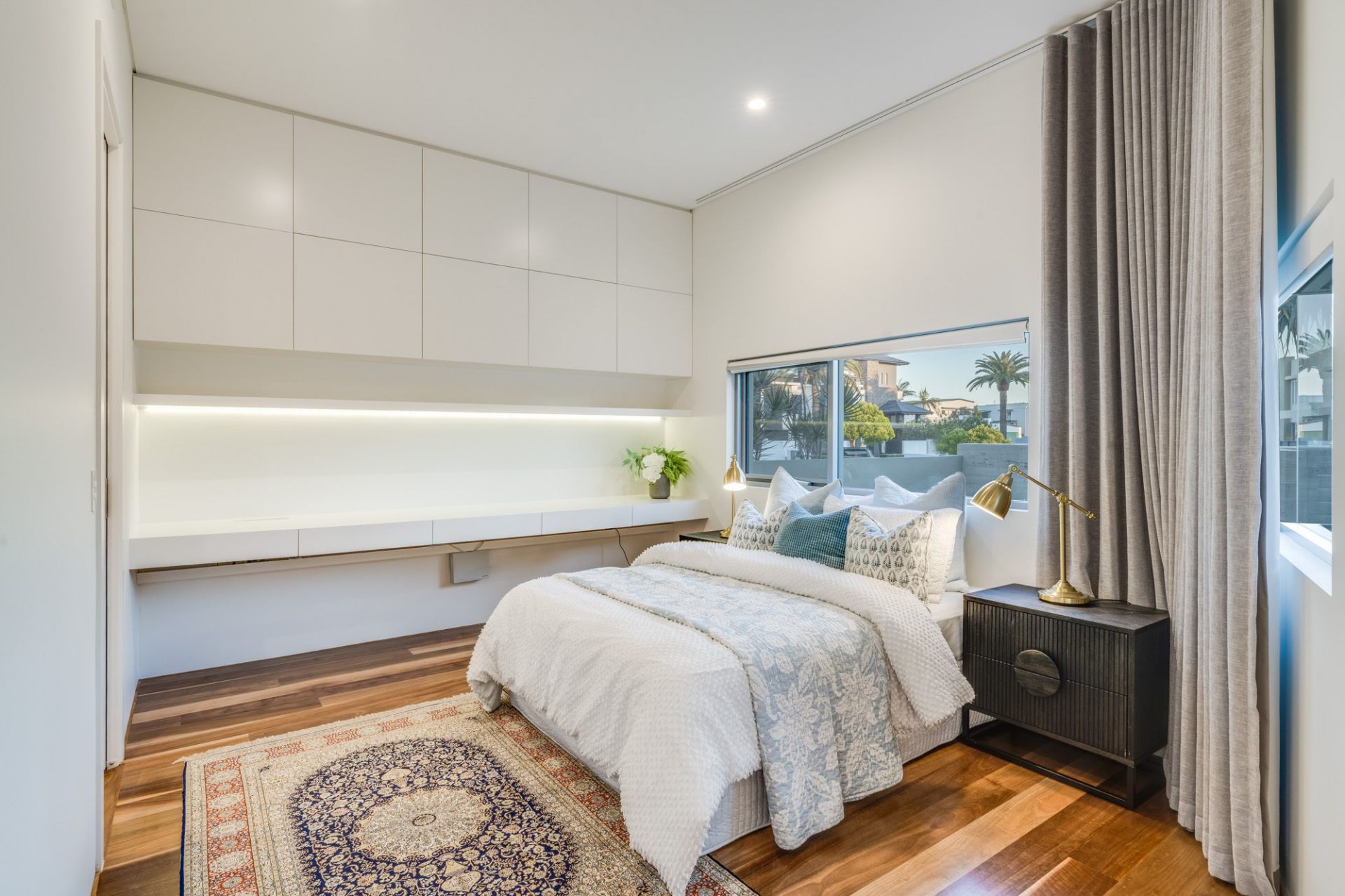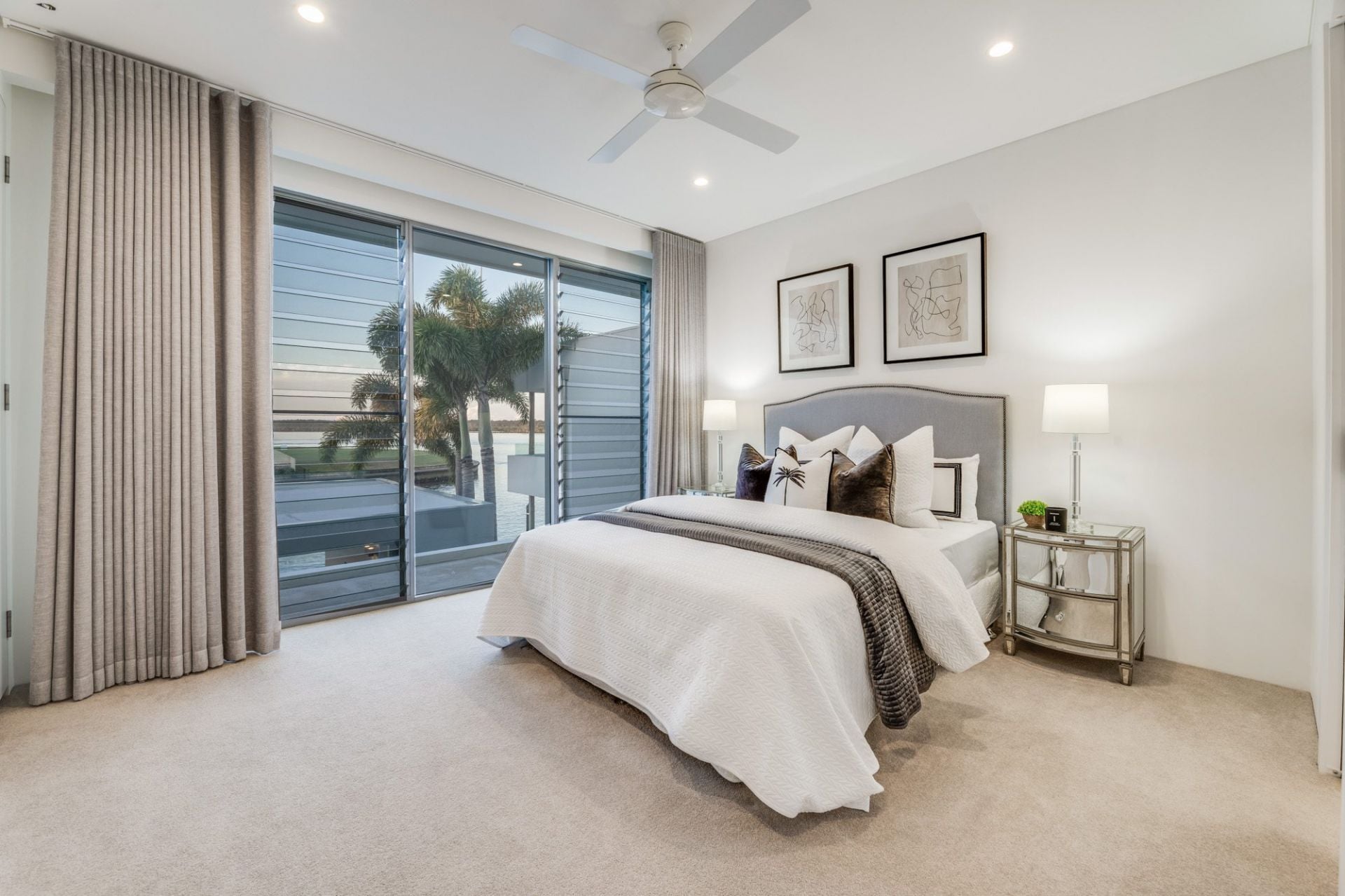 Accommodation comprises five bedrooms, four of which are on the upper level and are appointed with ensuites. The deluxe master features his/her resort style walk-in dressing room, luxurious full ensuite, free-standing bath, double shower, while opening to the north facing sunbathed balcony with stunning views including the spectacular wide water vistas. Providing tranquility and privacy. The en-suited guest bedroom is positioned for privacy to the front of the home.