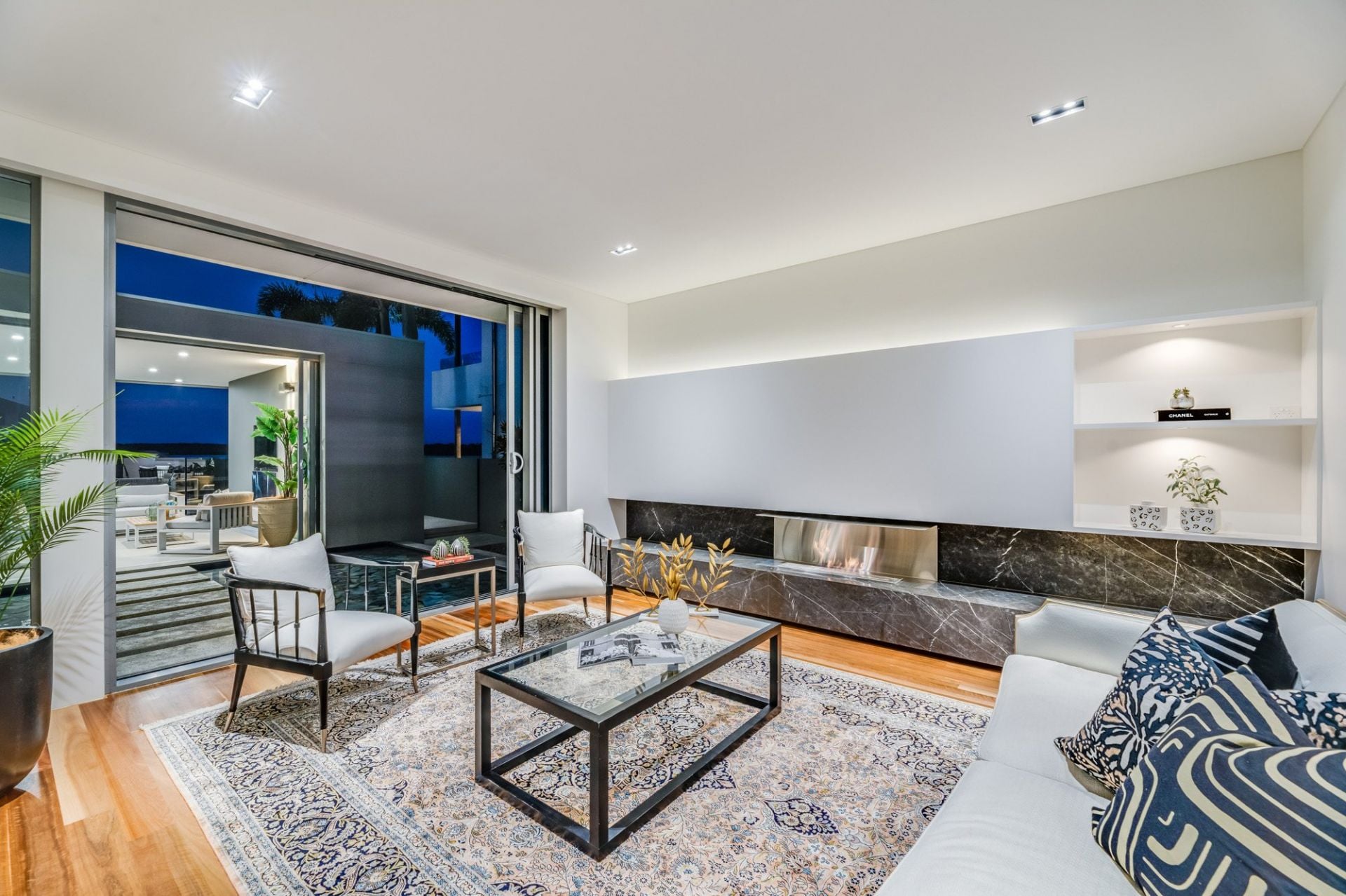 • Second formal sitting area with ethanol fireplace and custom cabinetry