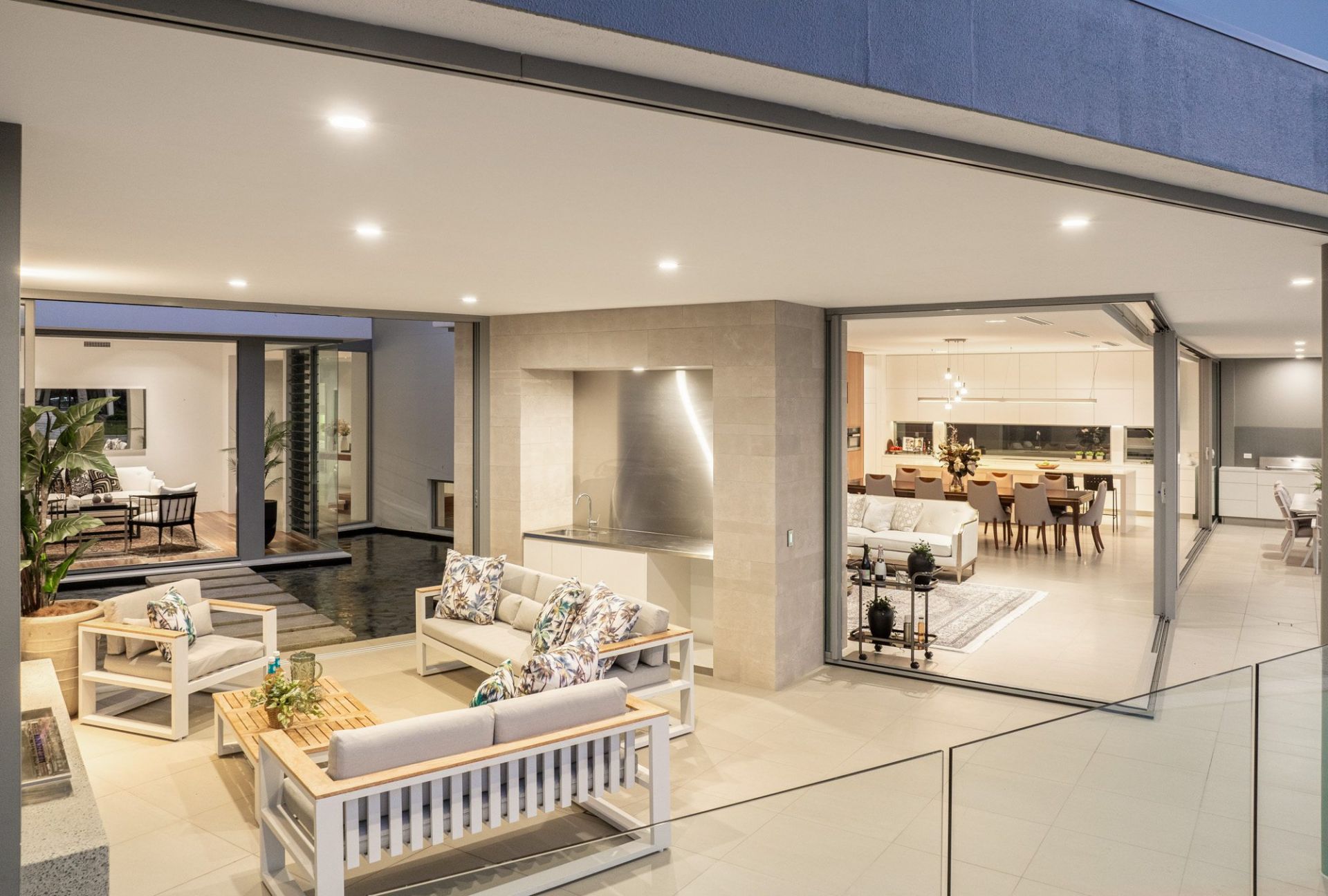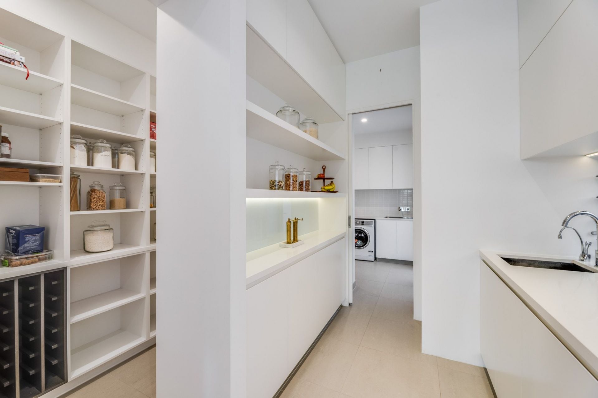 Acting as the social heart of the home is a simple yet luxurious state of the art living/dining space and visionary kitchen featuring stone island benchtops, bespoke cabinetry, Miele appliances including dual ovens, induction cooktop, integrated dishwashers and butler's pantry with separate sink and integrated fridge/freezers.