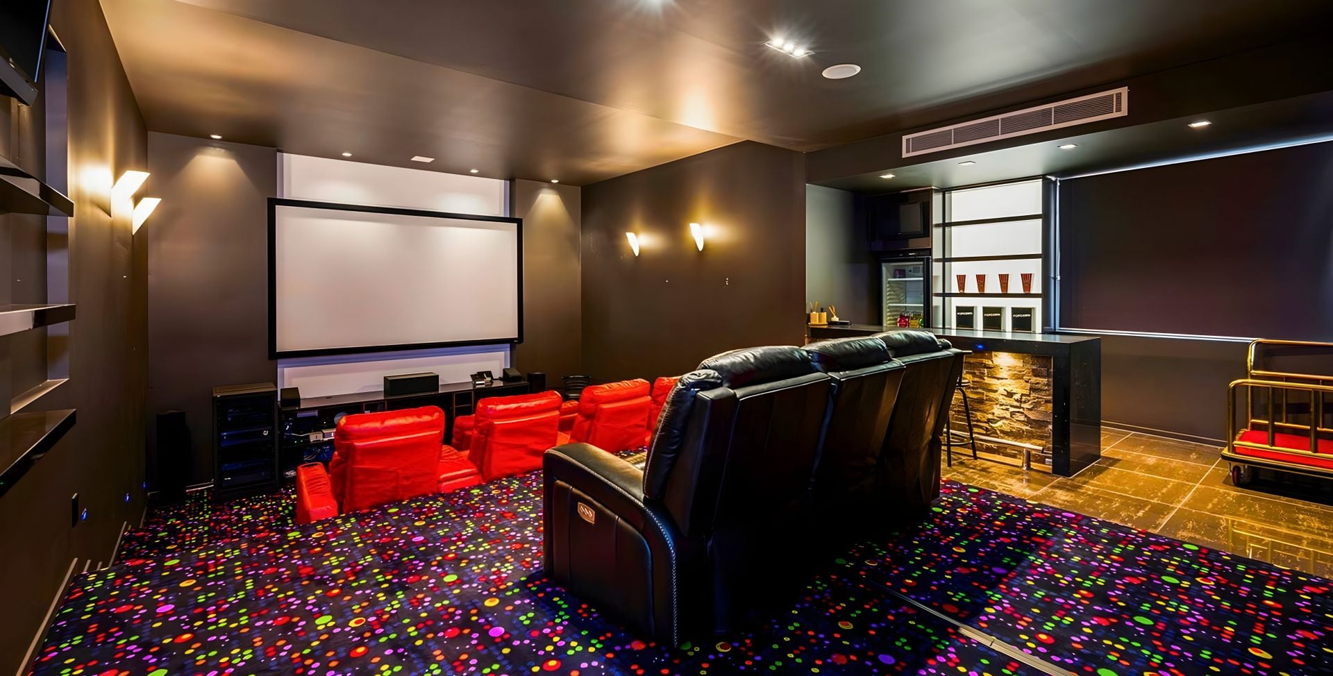 • Home cinema with premium tiered seating, surround sound, and a wet bar