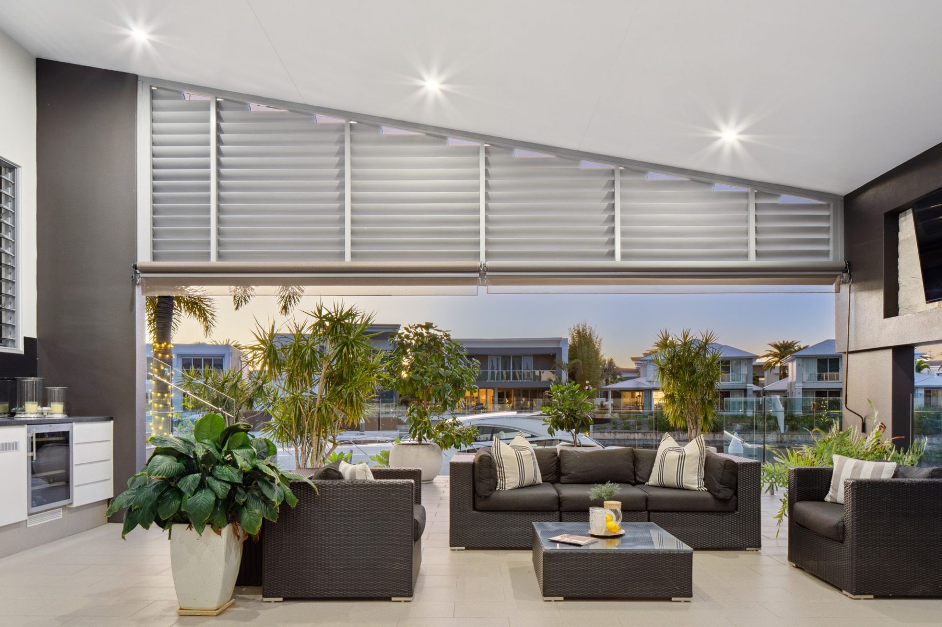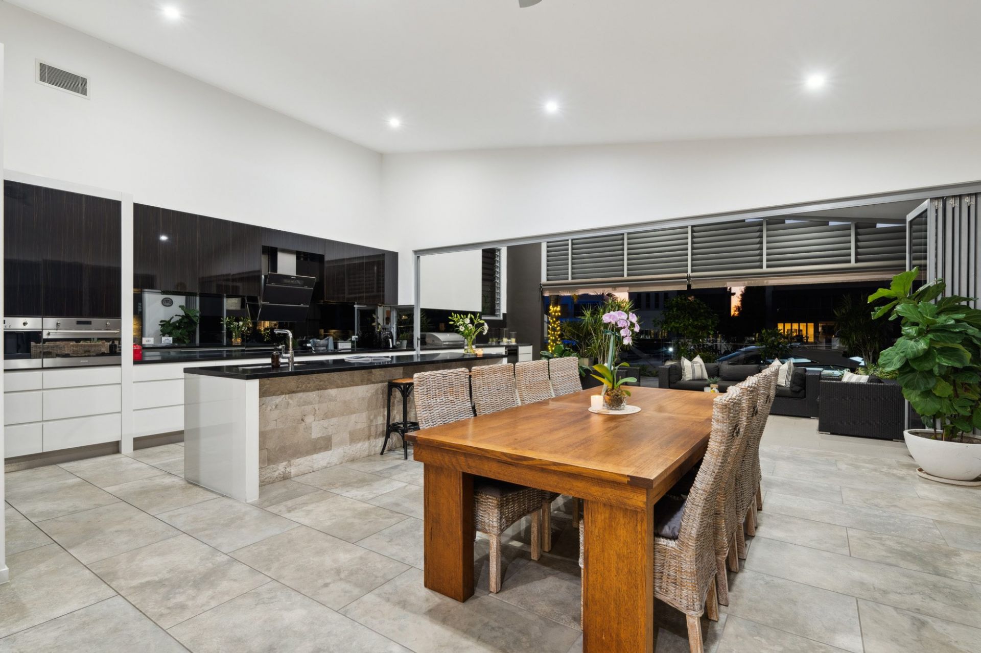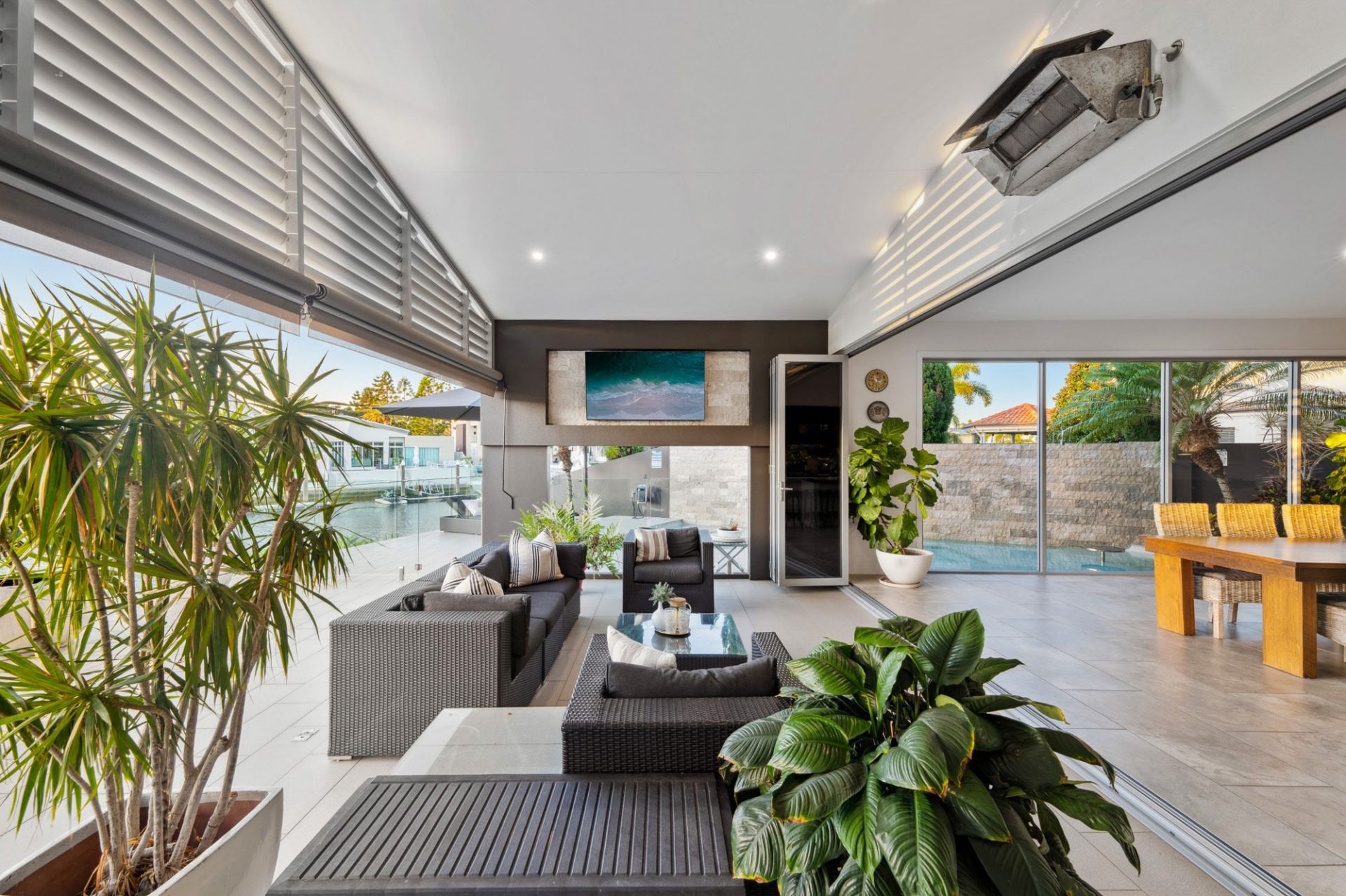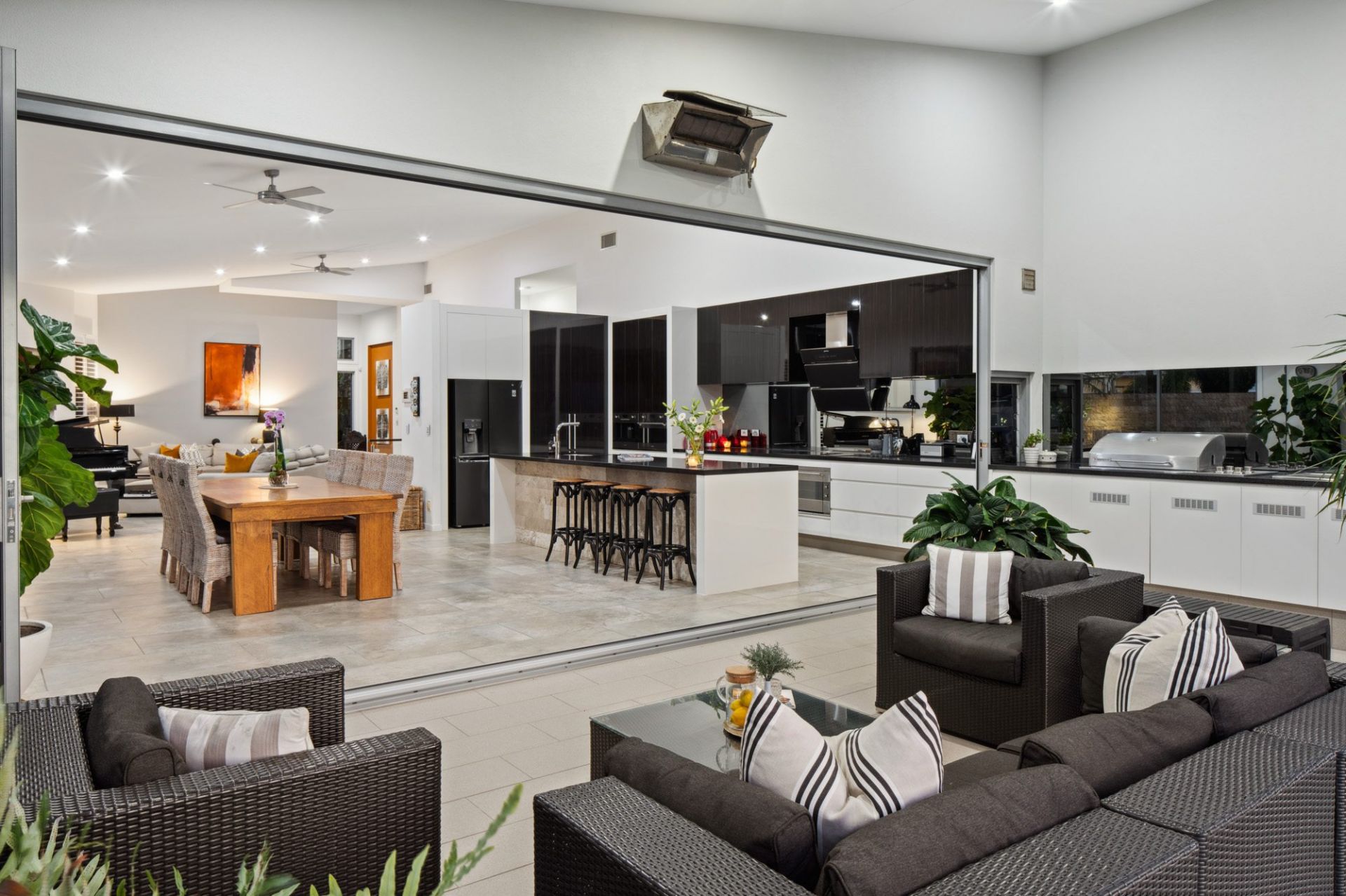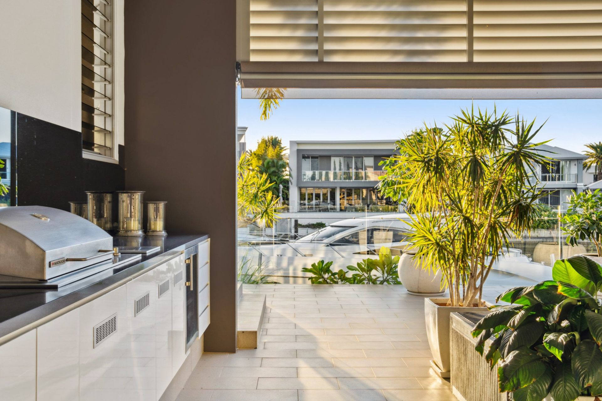 - Bifold doors opening to alfresco with built-in Matador BBQ, teppanyaki grill, bar fridge, gas heater, and cafe blinds