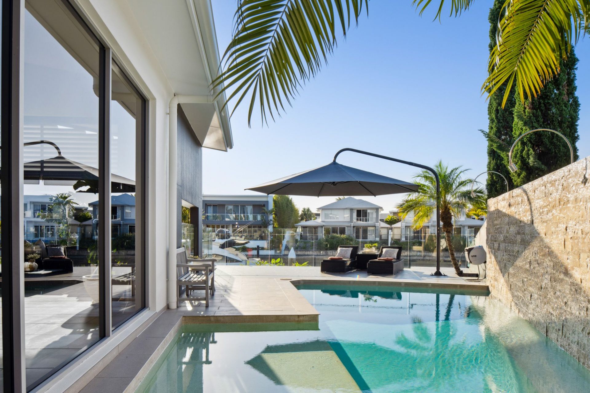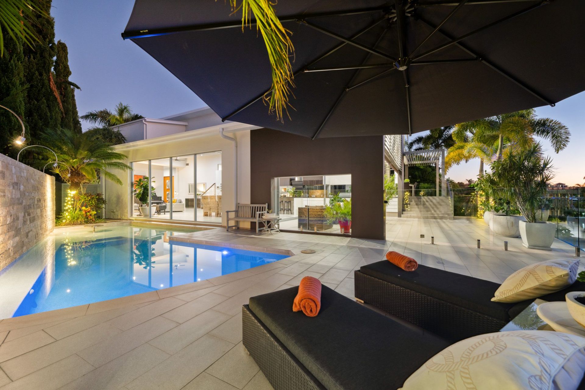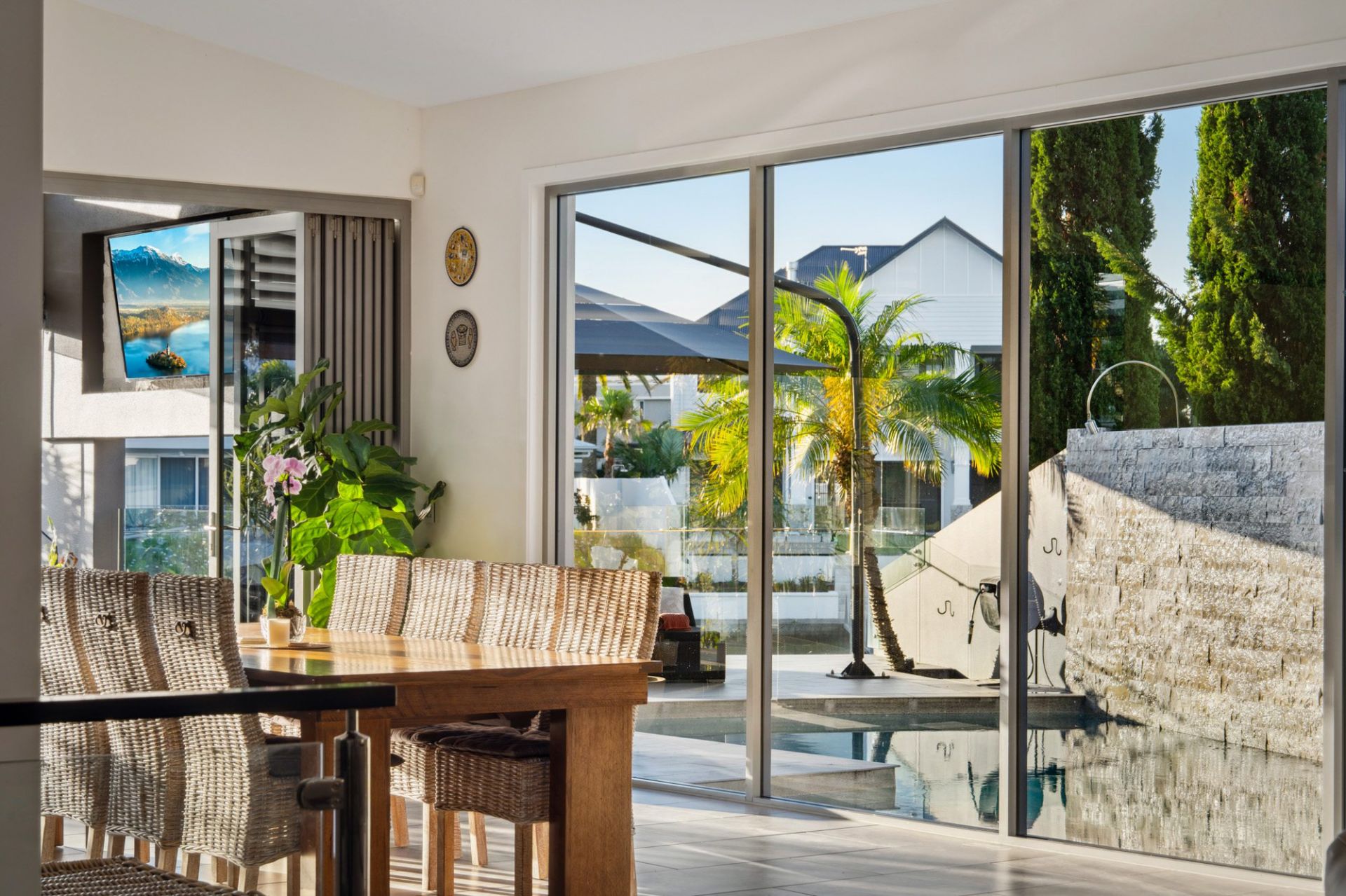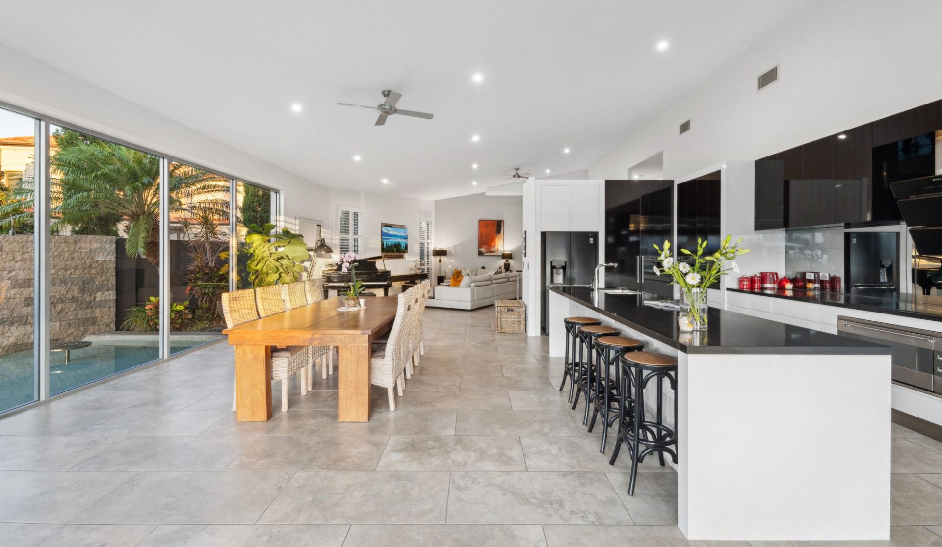 - Expansive open-plan living with north-facing glass wall overlooking pool, and an abundance of natural light