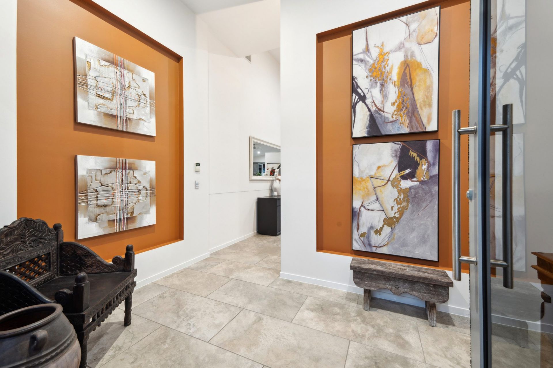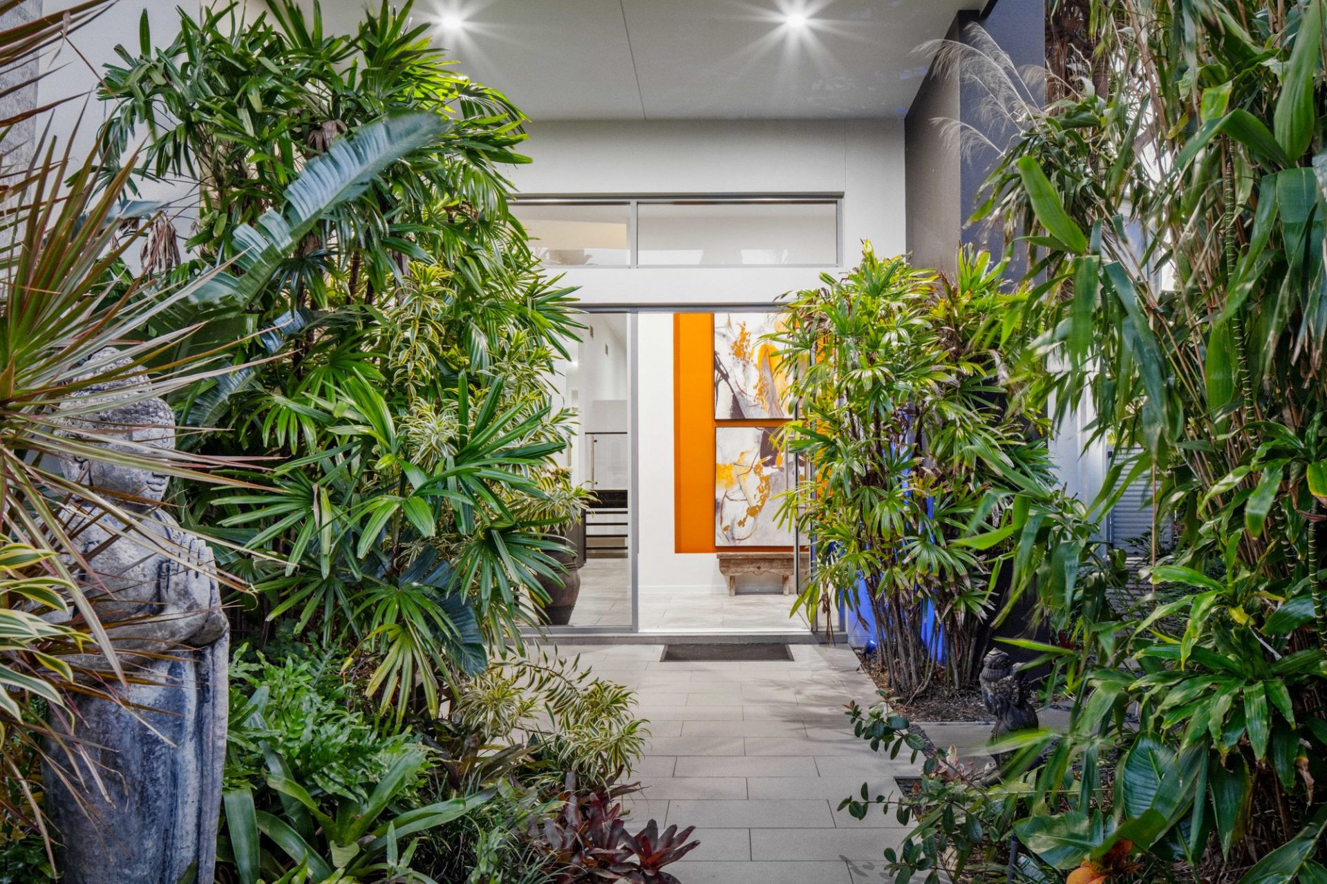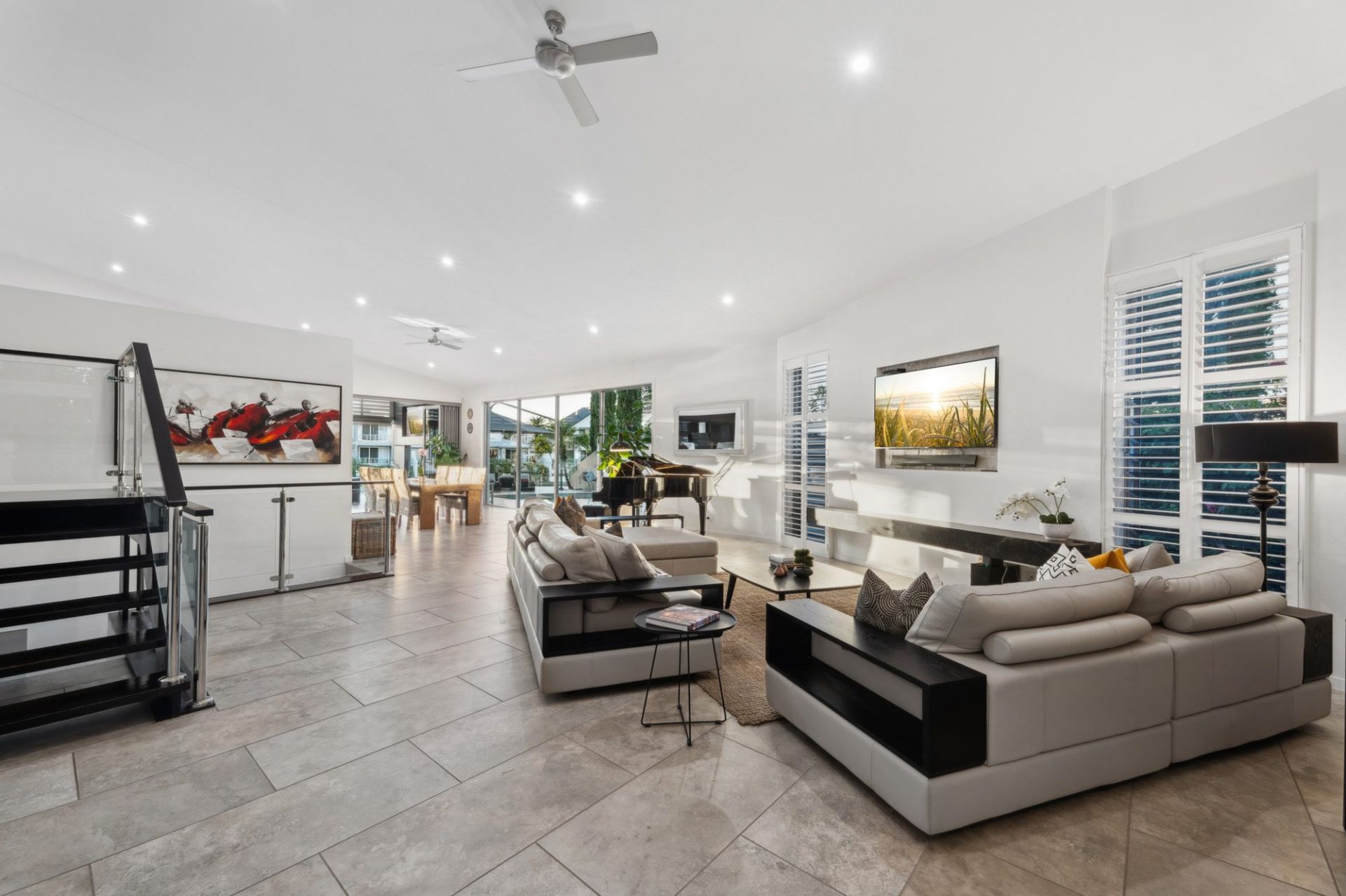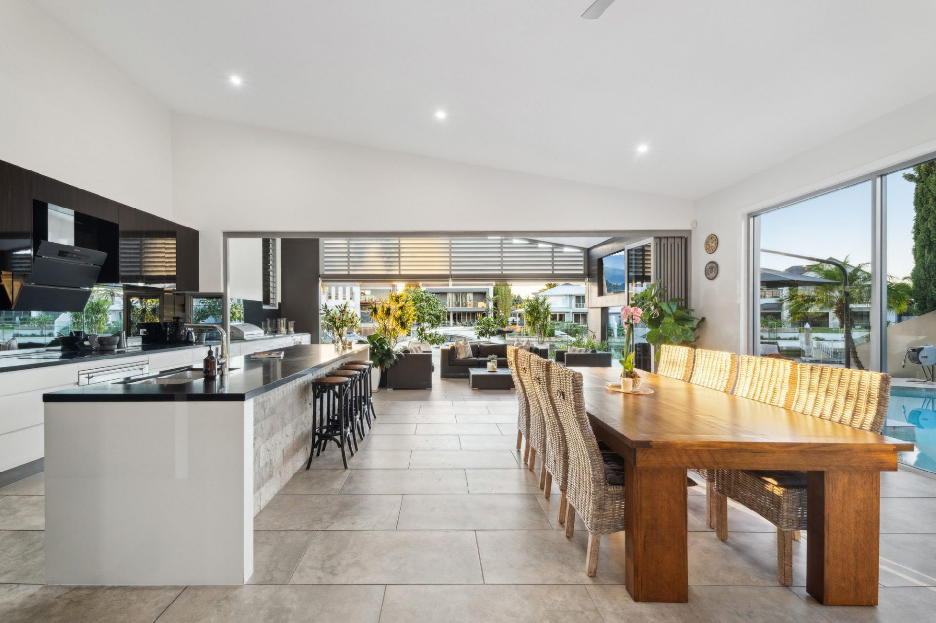 - Expansive open-plan living with north-facing glass wall overlooking pool, and an abundance of natural light