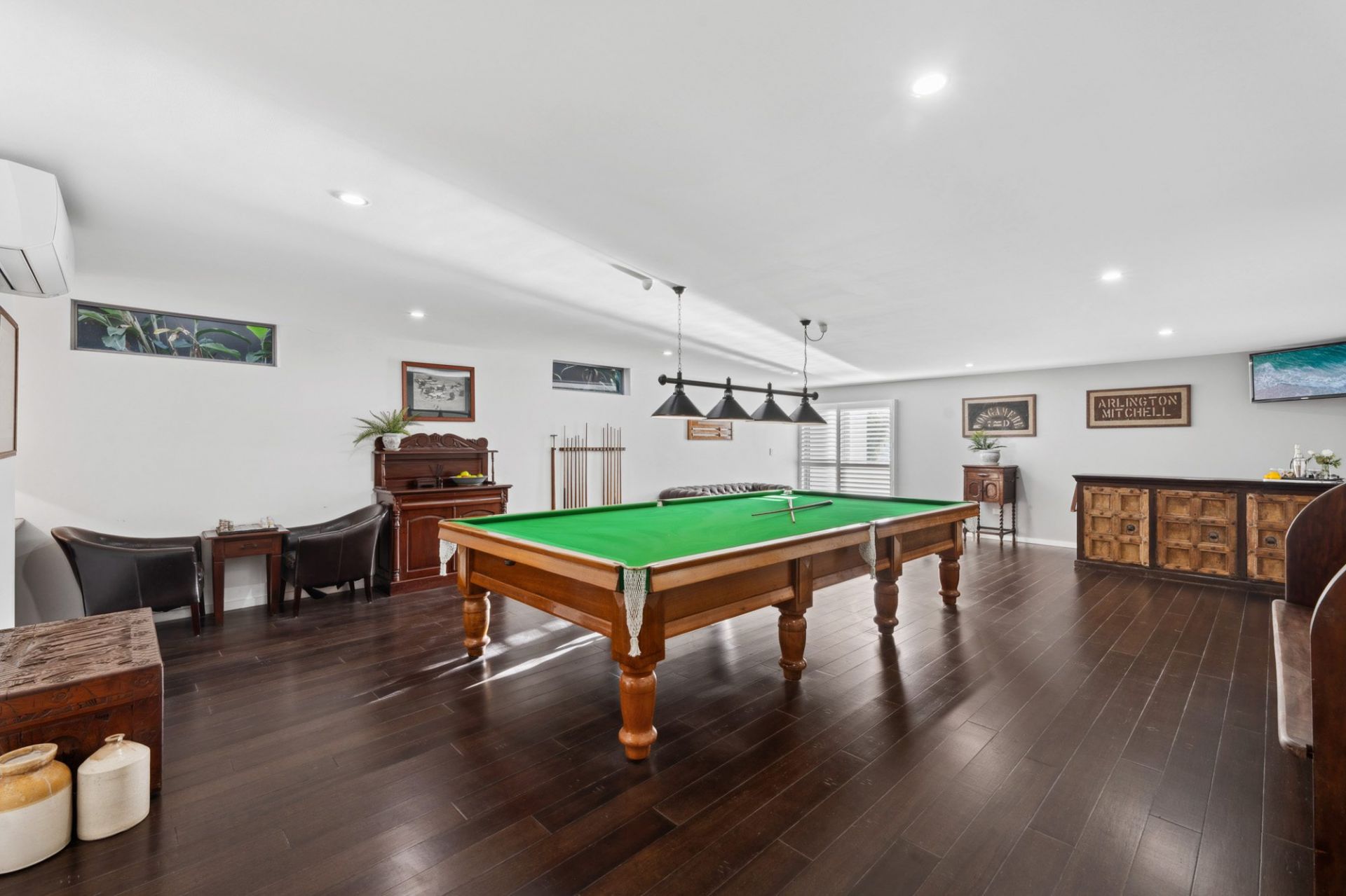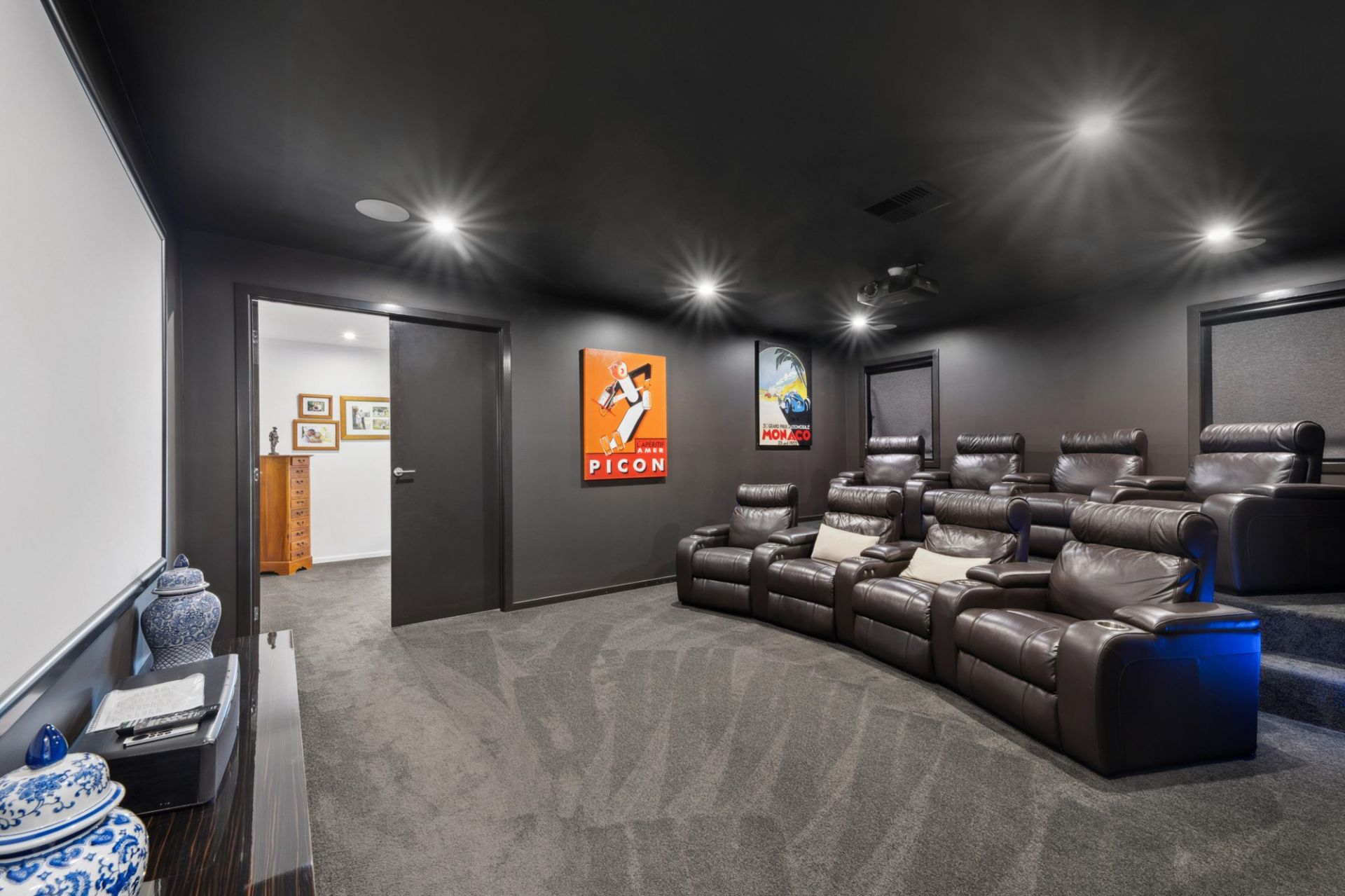 - Home theatre with tiered seating, premium sound system, and basement games room