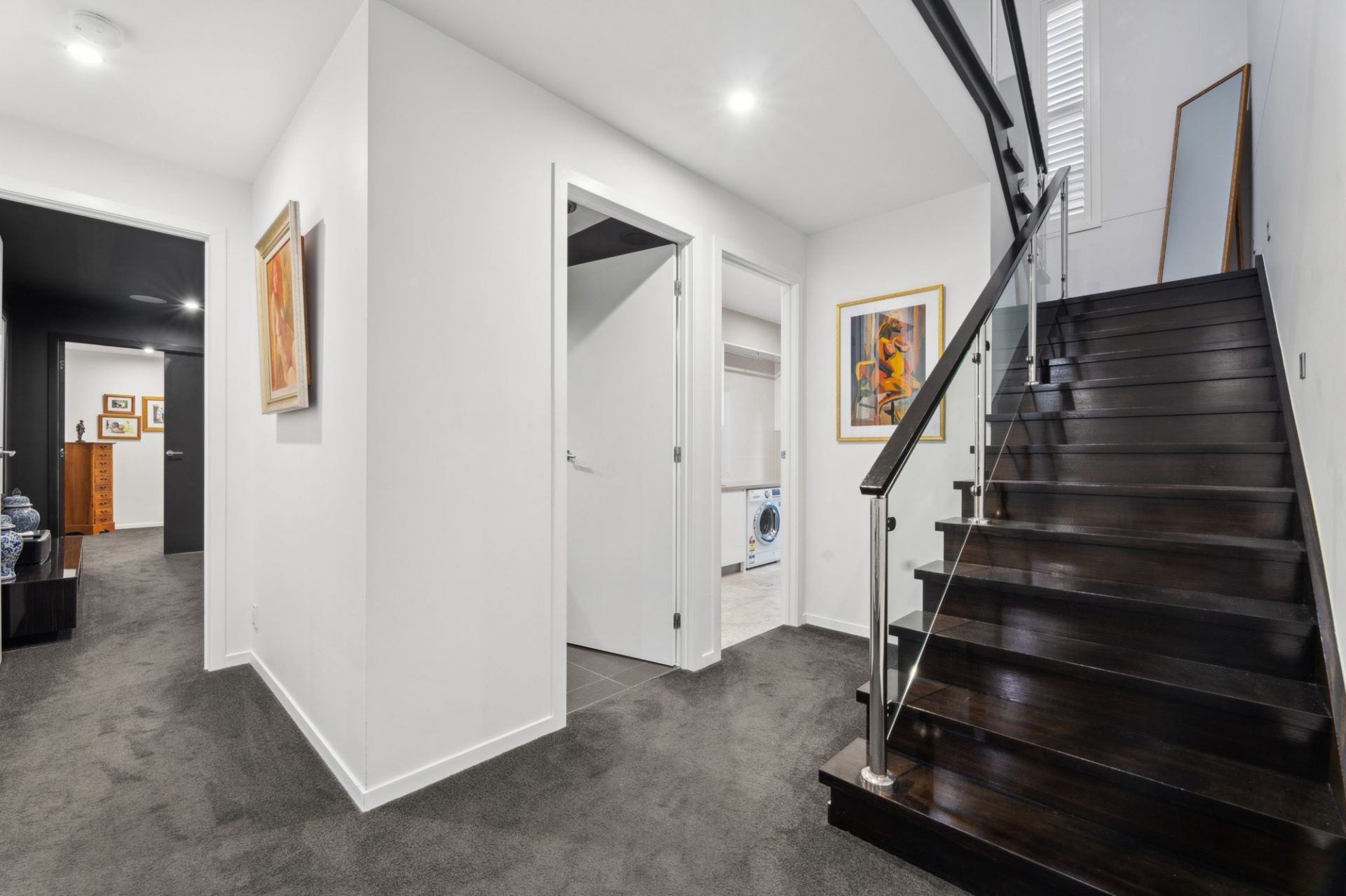 Dressed in modern monochromatic tones, the home exudes refined sophistication, featuring soaring ceilings and expansive glass windows that flood the living areas with natural light. This seamless integration of indoor and outdoor spaces enhances the connection to the surrounding natural beauty. The heart of the home is the designer kitchen, where sleek black stone benchtops and glossy cabinetry create a striking visual contrast. The standout island, with its illuminated stone facade, serves as both a functional culinary workspace and an elegant gathering spot for entertaining.