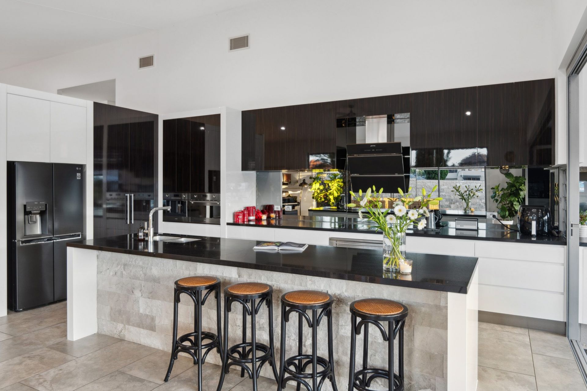 - Designer kitchen with black stone benchtops, sleek black backsplashes, SMEG appliances, and island for casual dining