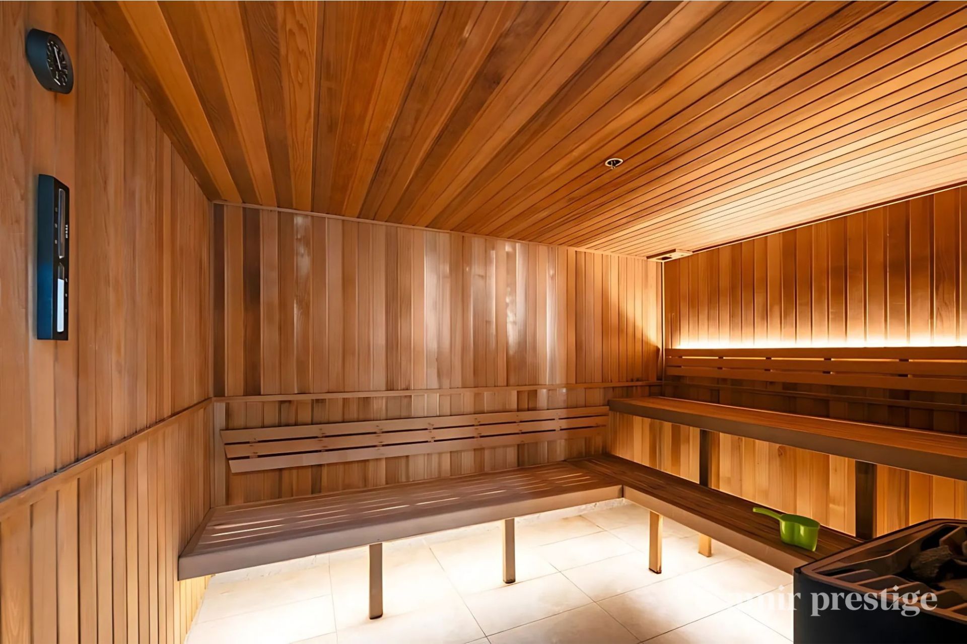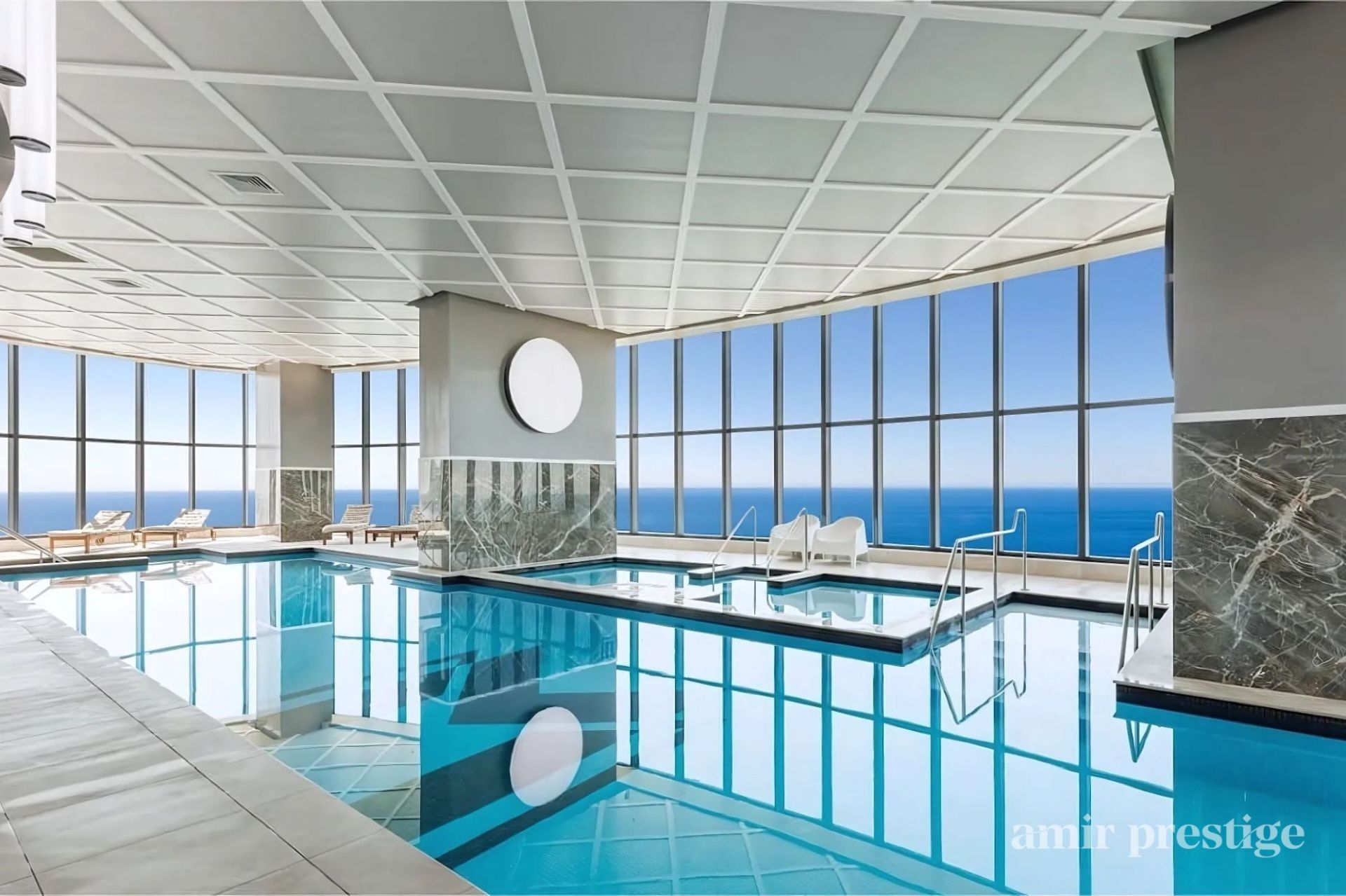 Level 33: Indoor heated pool, gym, sauna, and spa with spectacular views